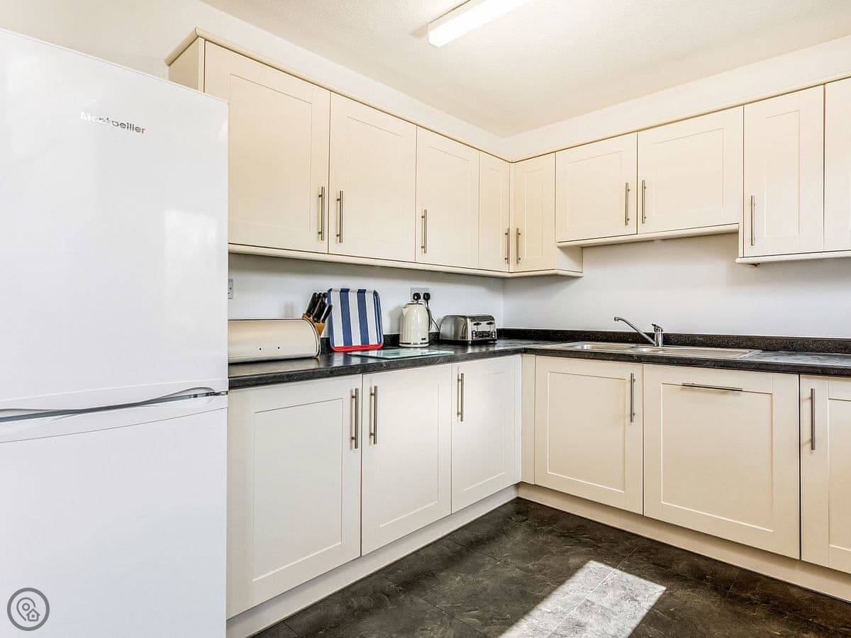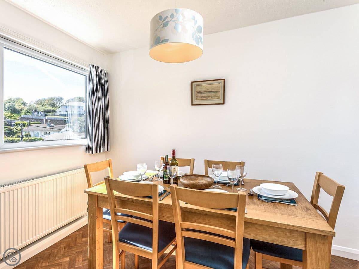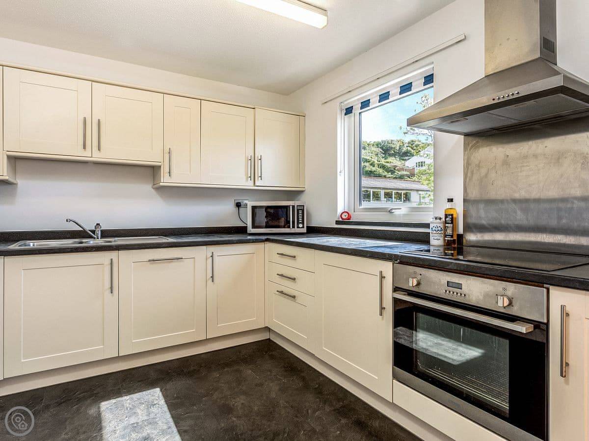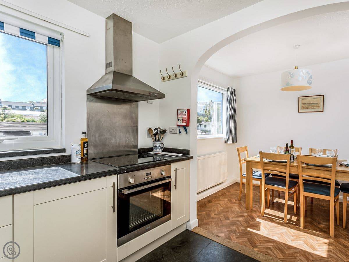 The kitchen is modern and has a dining area. You've got a dishwasher, fridge-freezer, and washing machine. The washing machine is in the big garage on the ground floor, which is useful for drying wetsuits and coats if the weather's bad. There's a small garden at the side.