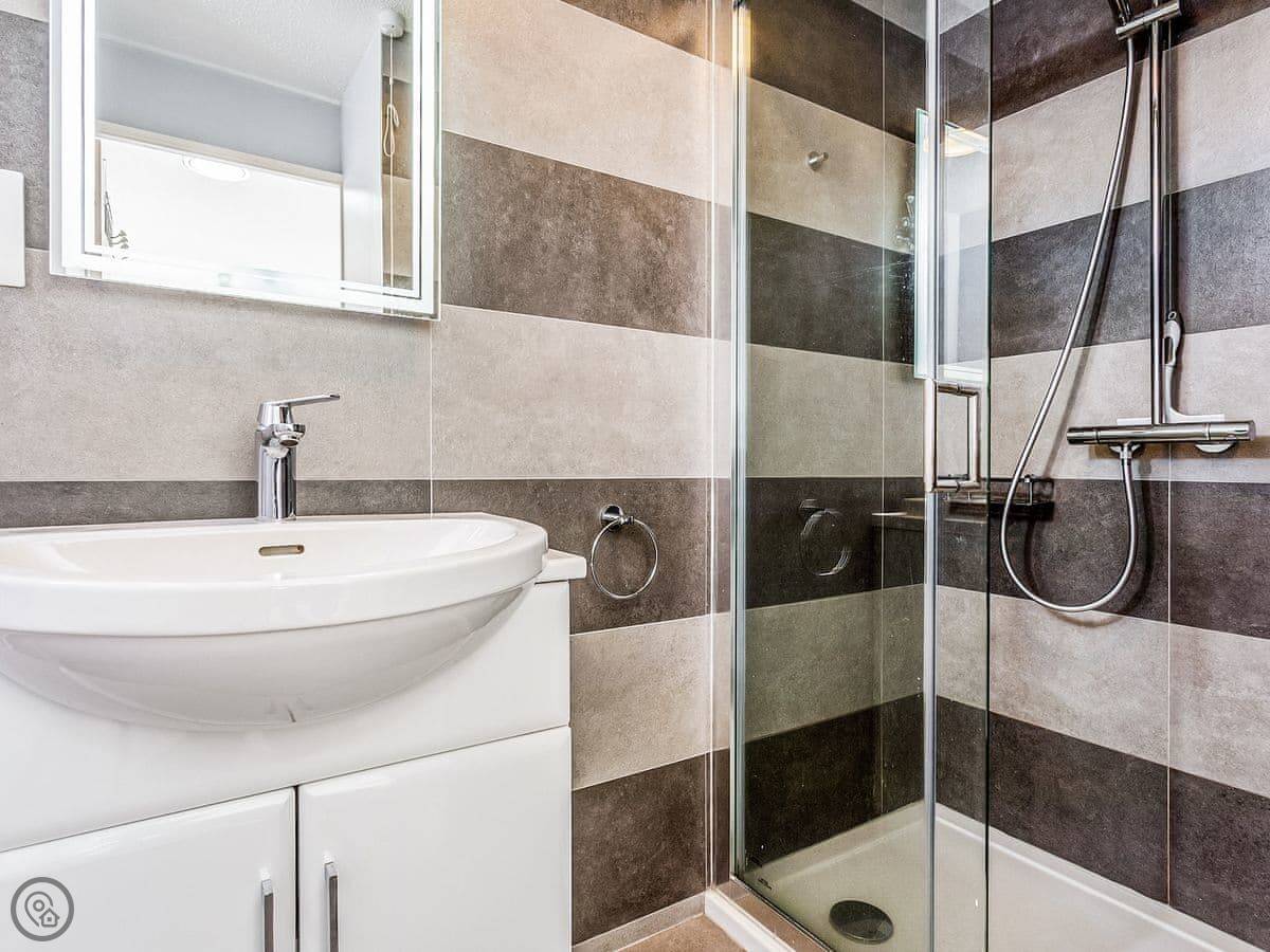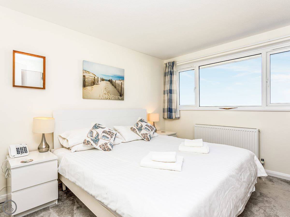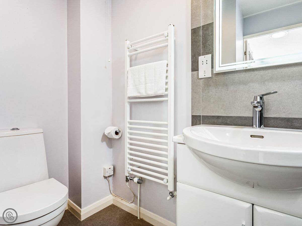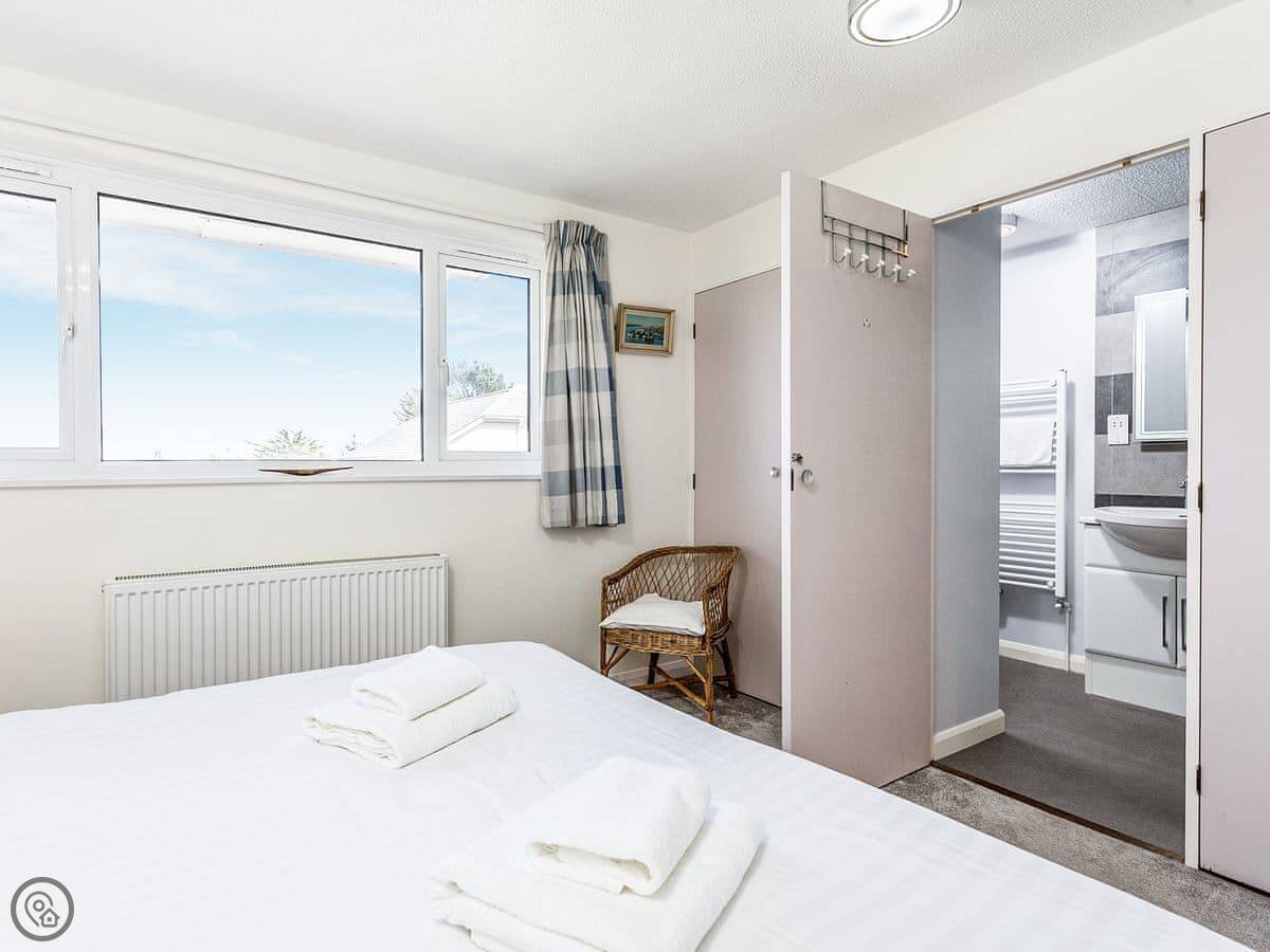 The kitchen is modern and has a dining area. You've got a dishwasher, fridge-freezer, and washing machine. The washing machine is in the big garage on the ground floor, which is useful for drying wetsuits and coats if the weather's bad. There's a small garden at the side.