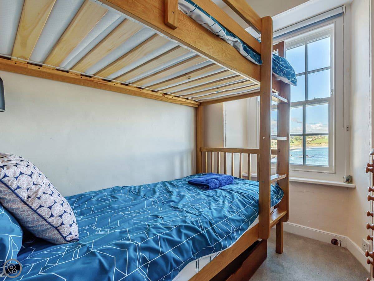 The house is tastefully decorated and furnished throughout with excellent views of the sea from all rooms apart from the kitchen and one back bedroom. On the ground floor the dining room is furnished with a table seating eight with a good sea view from the front window. The fitted modern kitchen has an electric cooker with extractor hood, fridge, dishwasher, microwave and range of cupboards and work tops. The kitchen also provides access to the rear courtyard. At the rear of the hall is the shower room with toilet, the superb living room, which extends the full depth of the house, has Smart TV, and again great sea views from the window and French doors open on to the pleasant patio area suitable for barbecues and al fresco dining. The central staircase rises to the first floor where there are four spacious bedrooms. Two bedrooms have kingsize beds, one has twin beds and one has bunk beds . There is also a spacious bathroom with toilet. Outside is a rear garden with patio area, while the utility room which houses the washing machine a second fridge and freezer is across the patio. The patio also gives access to the terraced garden via a locked gate, the views from this area are superb .