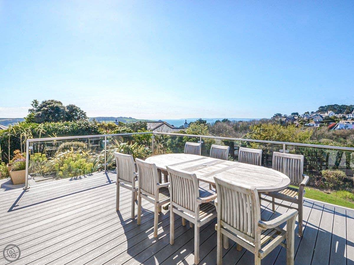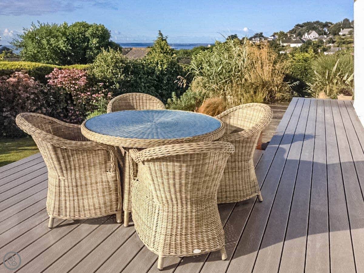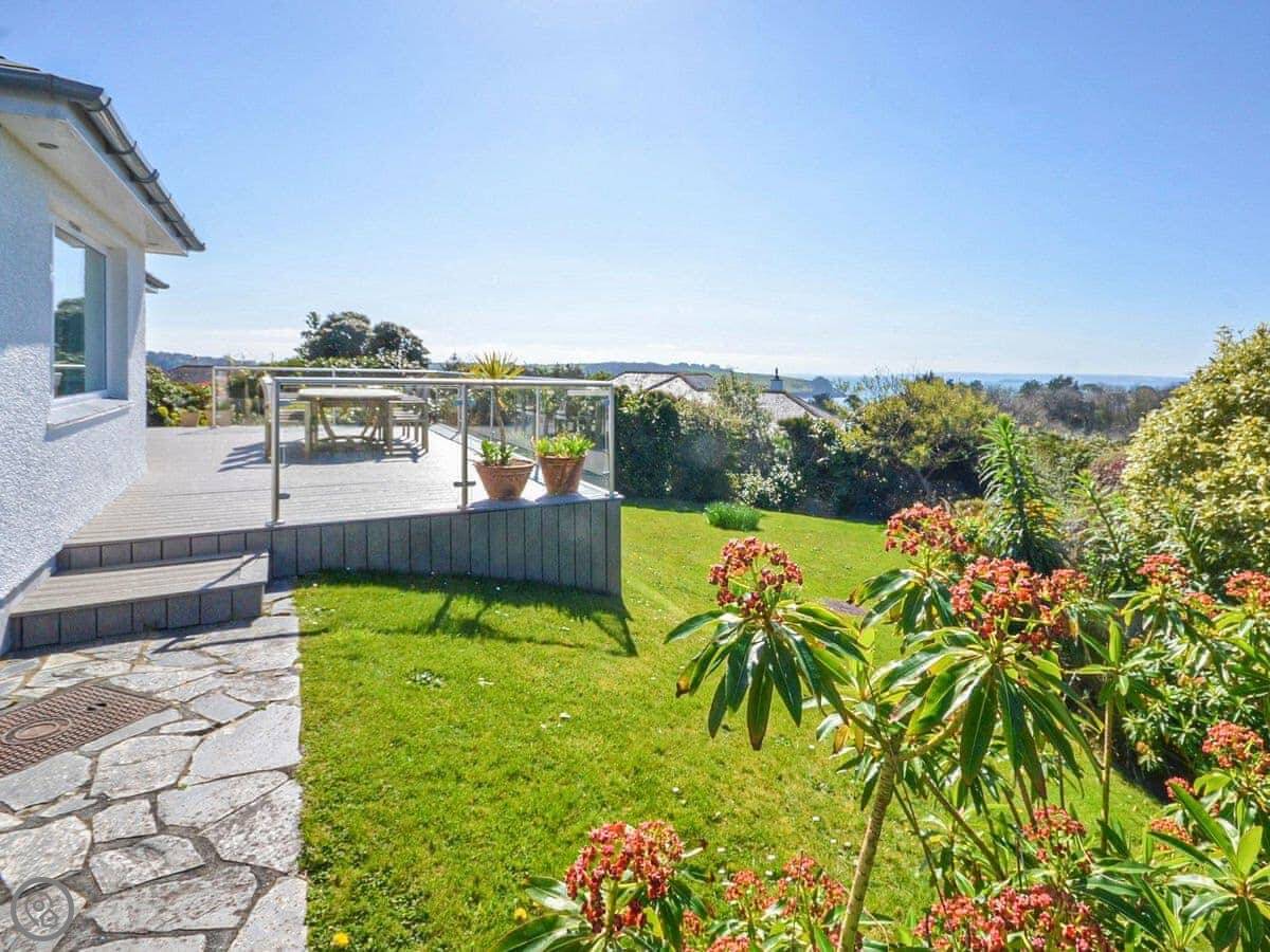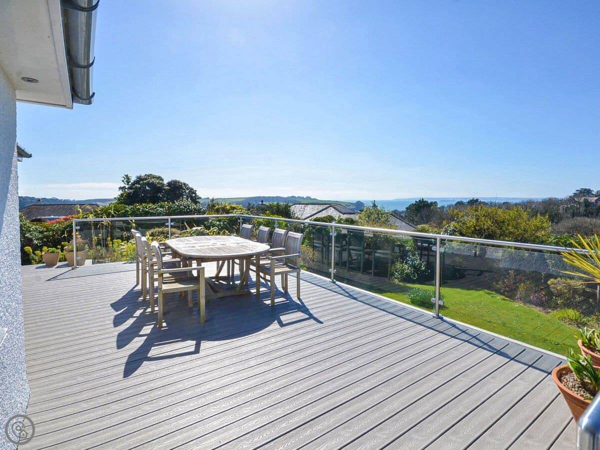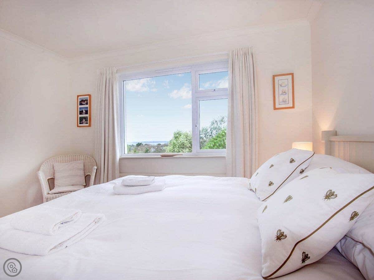 It sleeps six, with three bedrooms. Two proper doubles, one with an en-suite bath, and a twin room. There's another family shower room as well. It's got a 4 Star rating, so it's comfortable and well looked after. The view is the main thing. You get a panoramic sea view from the back, right over the Carrick Roads and towards the Lizard. There's a big deck and a decent sized garden.