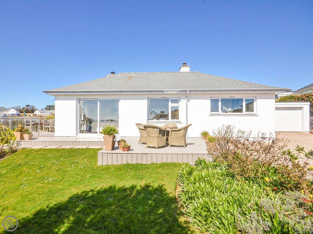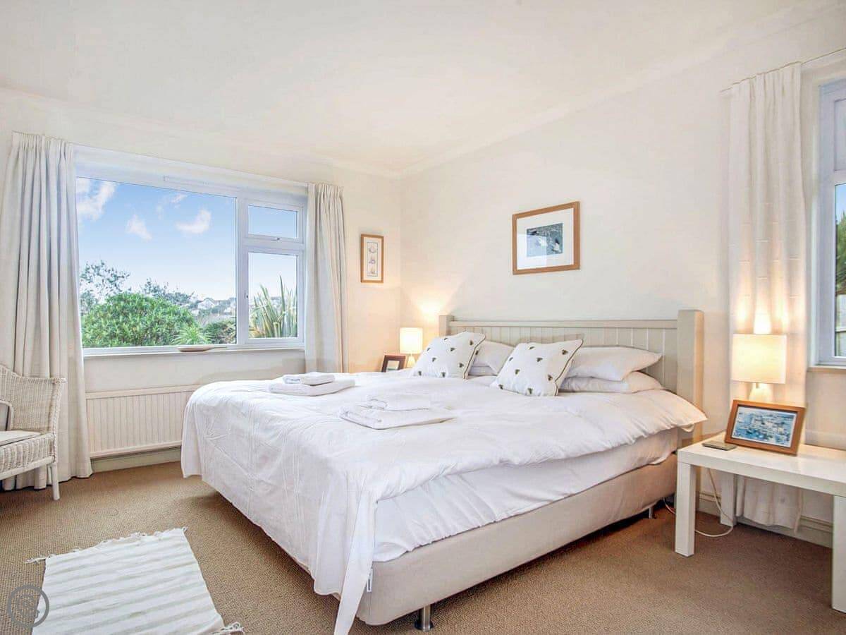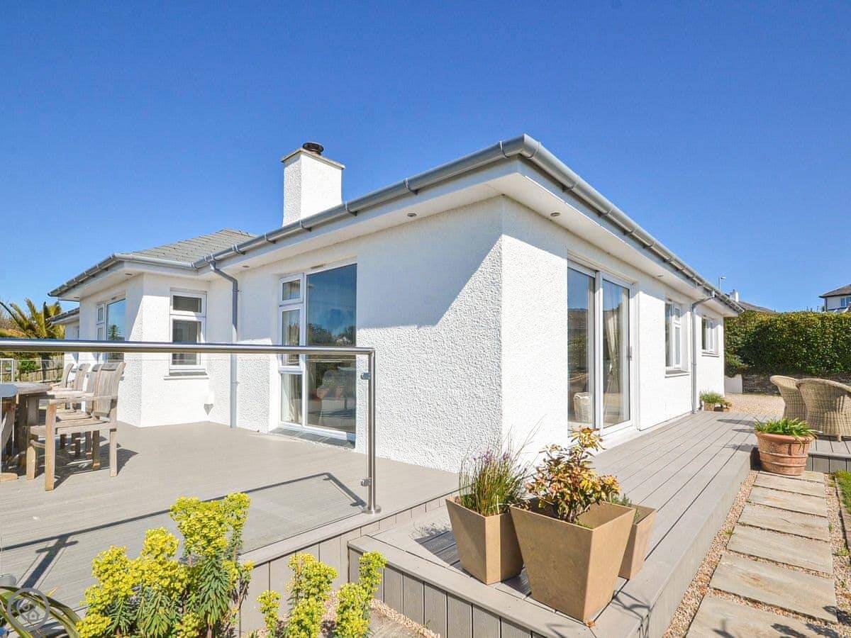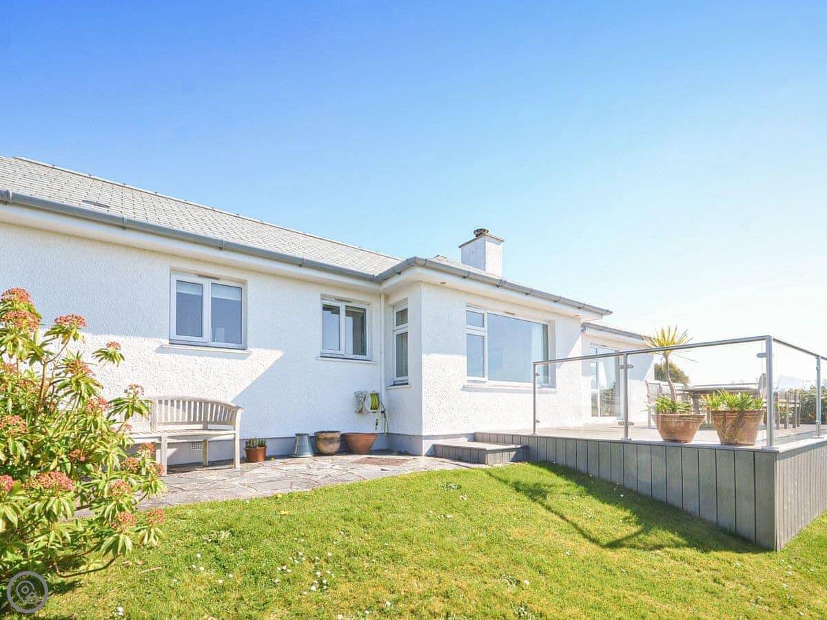 It sleeps six, with three bedrooms. Two proper doubles, one with an en-suite bath, and a twin room. There's another family shower room as well. It's got a 4 Star rating, so it's comfortable and well looked after. The view is the main thing. You get a panoramic sea view from the back, right over the Carrick Roads and towards the Lizard. There's a big deck and a decent sized garden.
