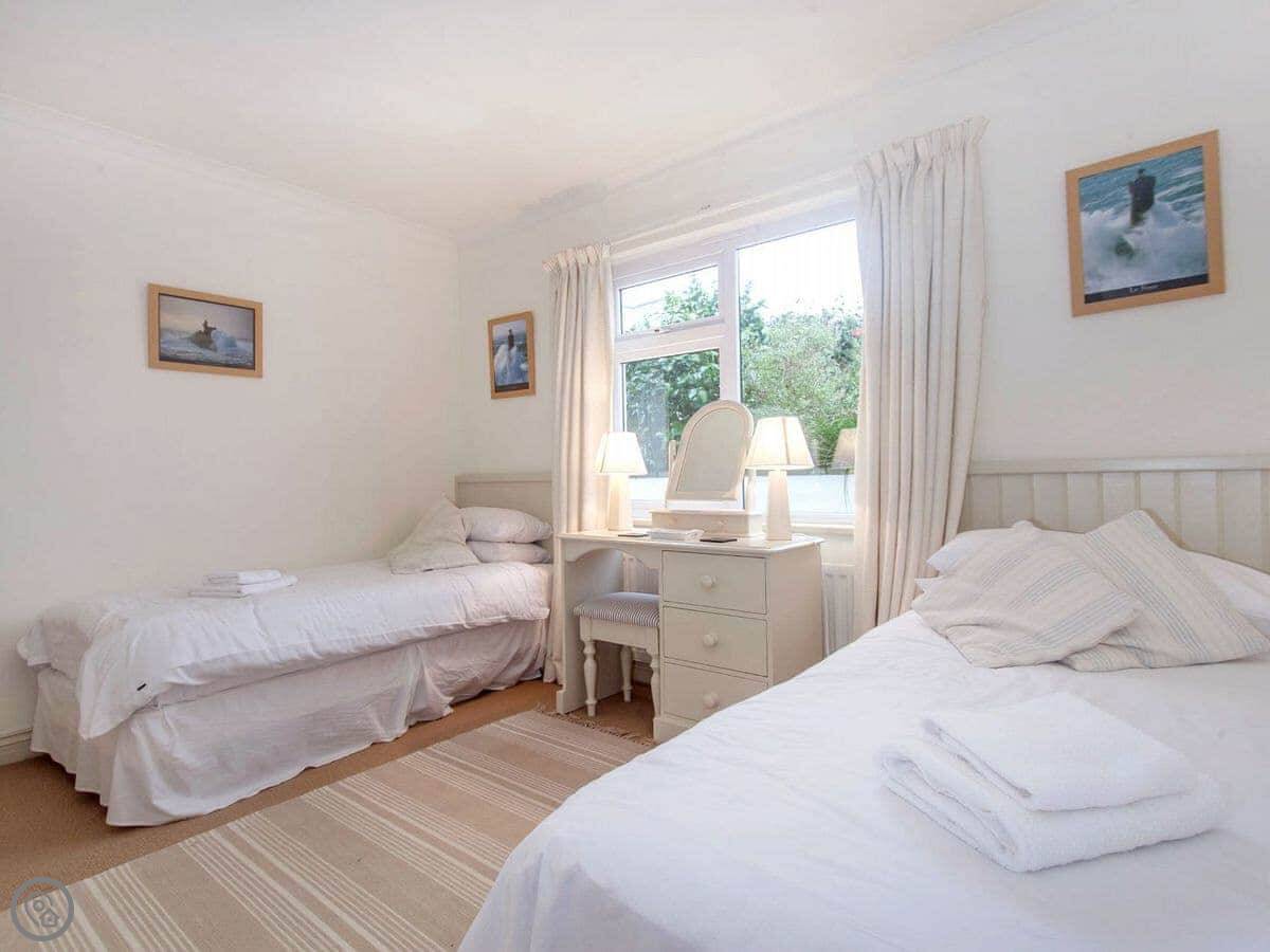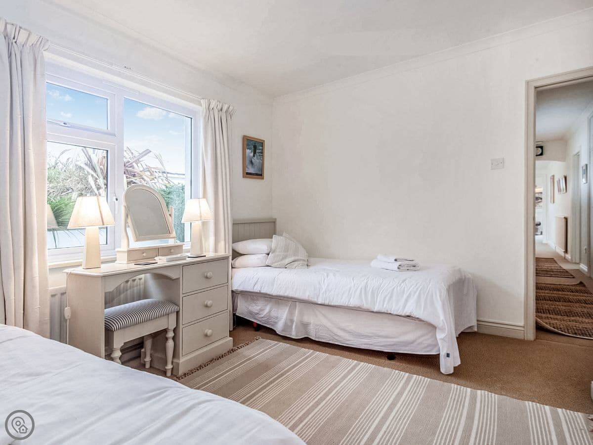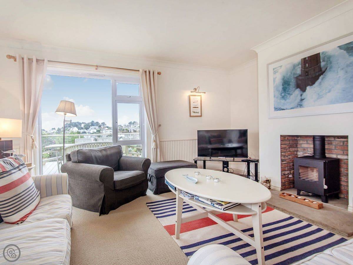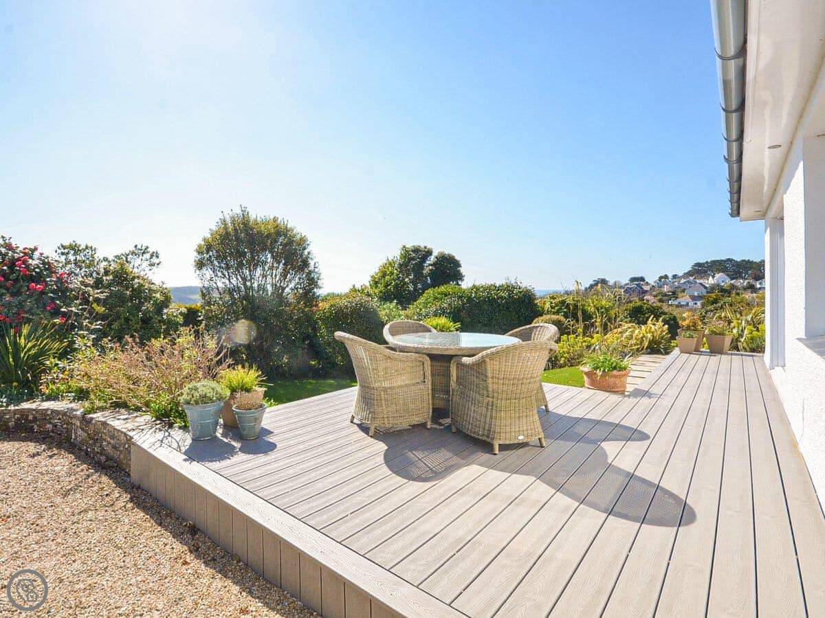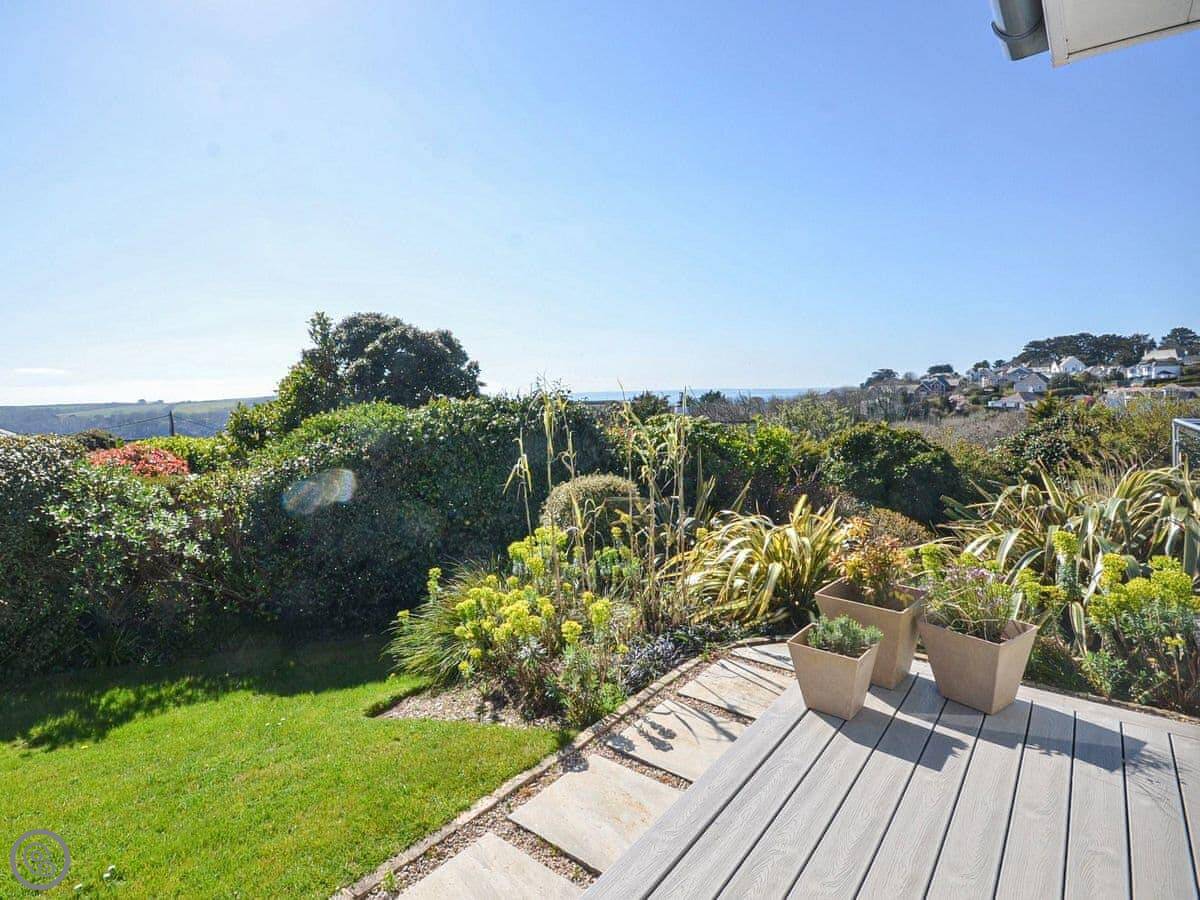 It sleeps six, with three bedrooms. Two proper doubles, one with an en-suite bath, and a twin room. There's another family shower room as well. It's got a 4 Star rating, so it's comfortable and well looked after. The view is the main thing. You get a panoramic sea view from the back, right over the Carrick Roads and towards the Lizard. There's a big deck and a decent sized garden.