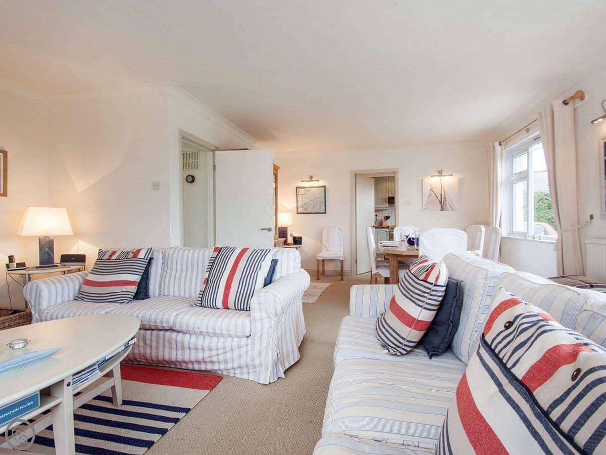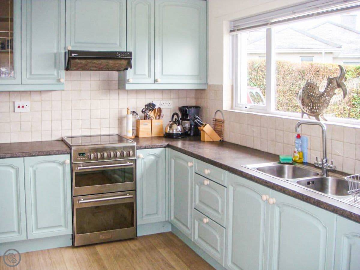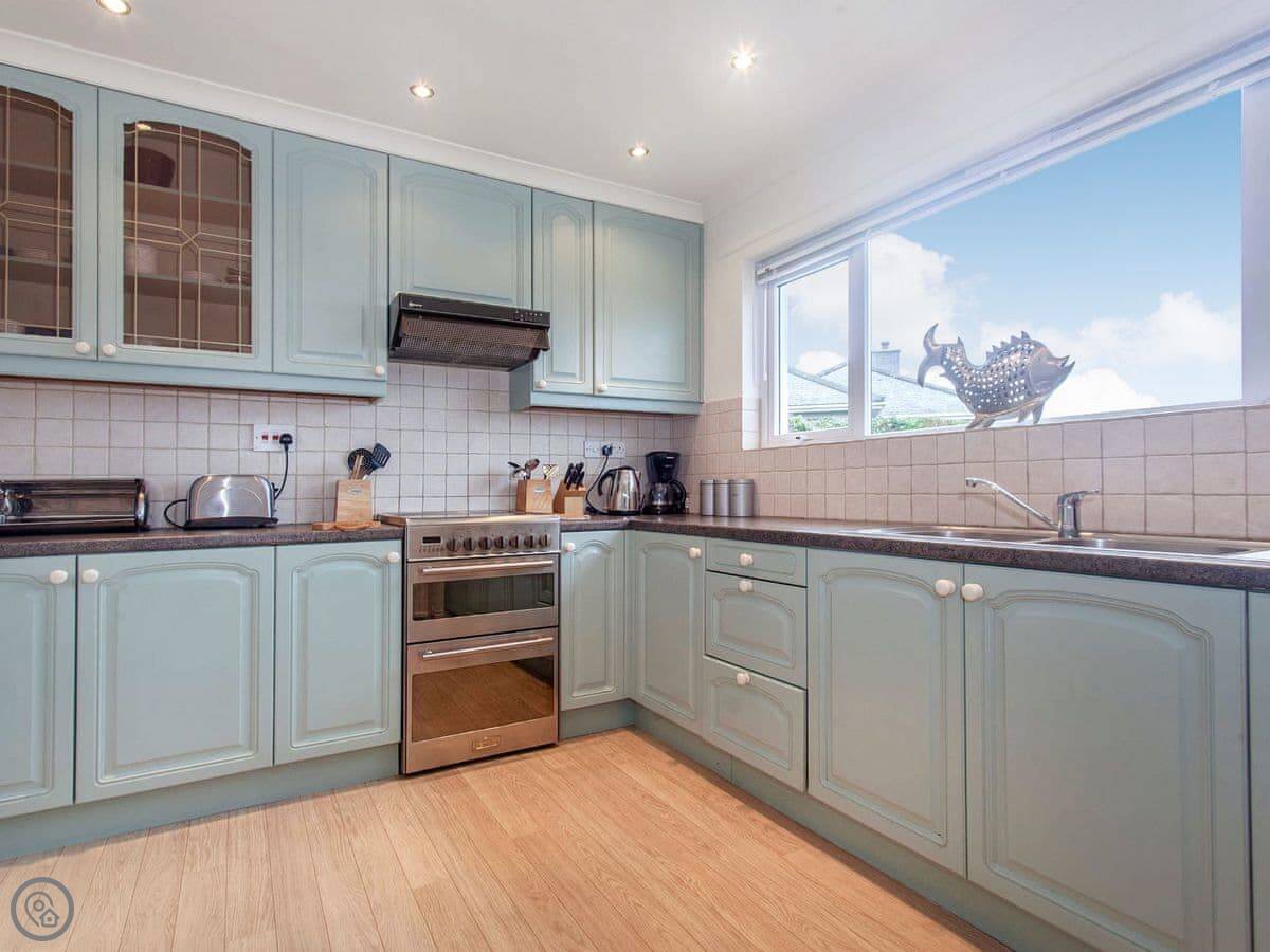 The kitchen is fine and has that same view. The living room has comfy sofas and doors to the deck. There's a Smart TV with Netflix and BT Sport if you need it. A utility room has a washing machine and tumble dryer.