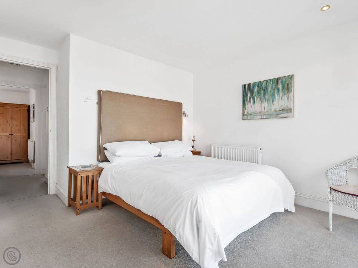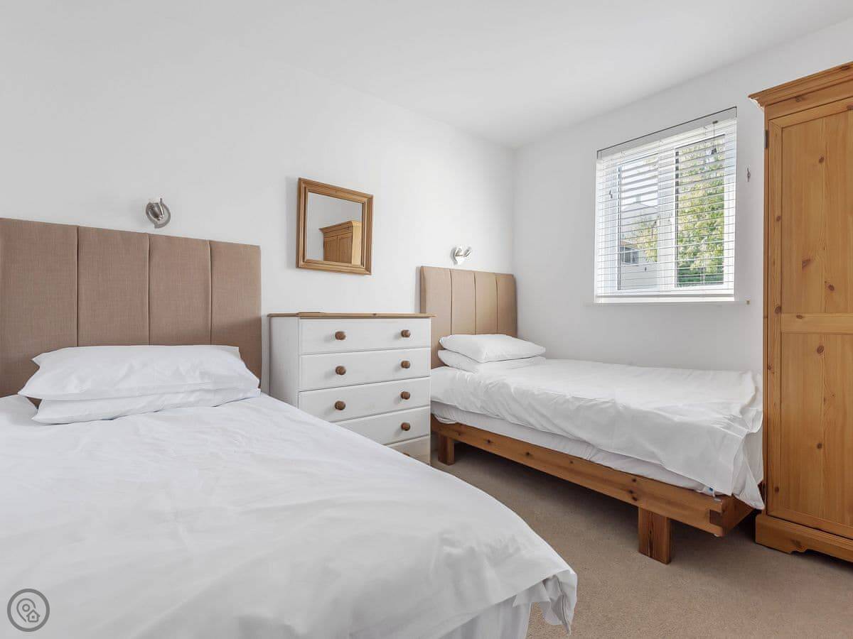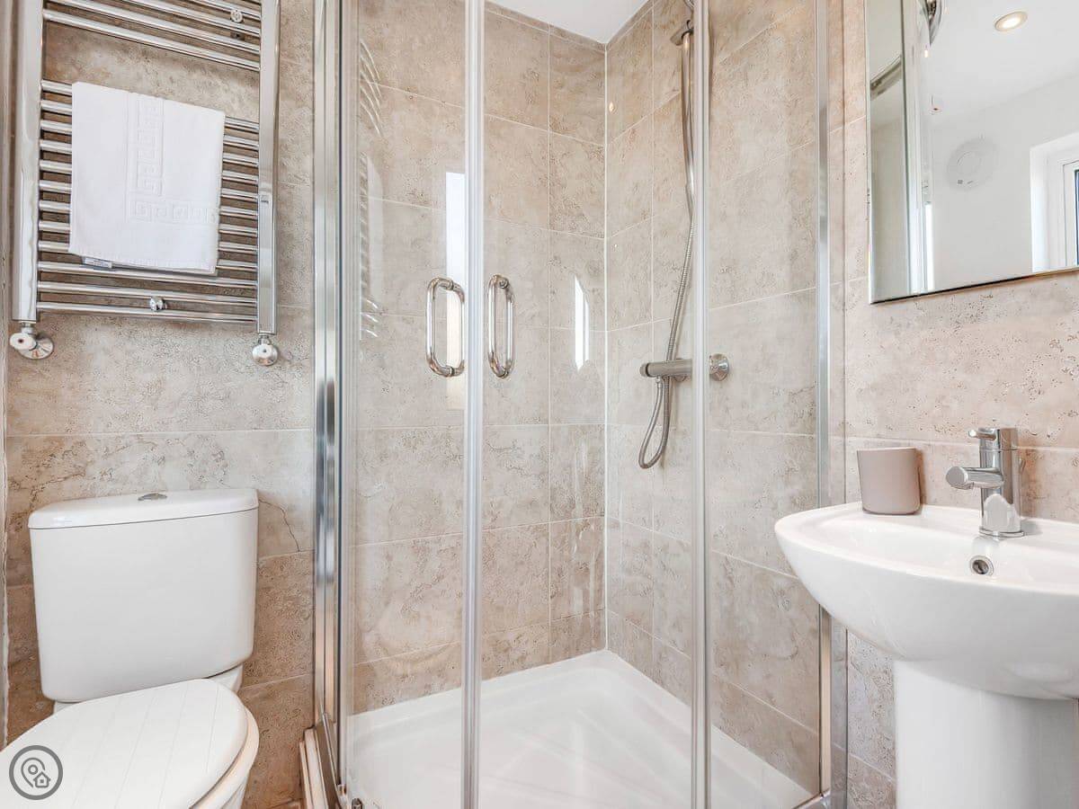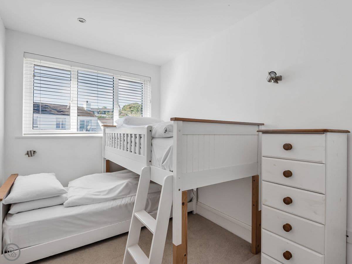 Bedrooms: one double on the ground floor with its own shower room. A king-size on the first floor with a walk-in wardrobe and a small Juliet balcony. Then there's a twin room and a bunk room. Those two share a family bathroom with a bath and a separate shower.