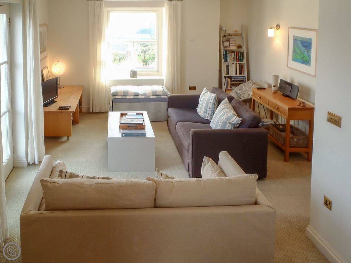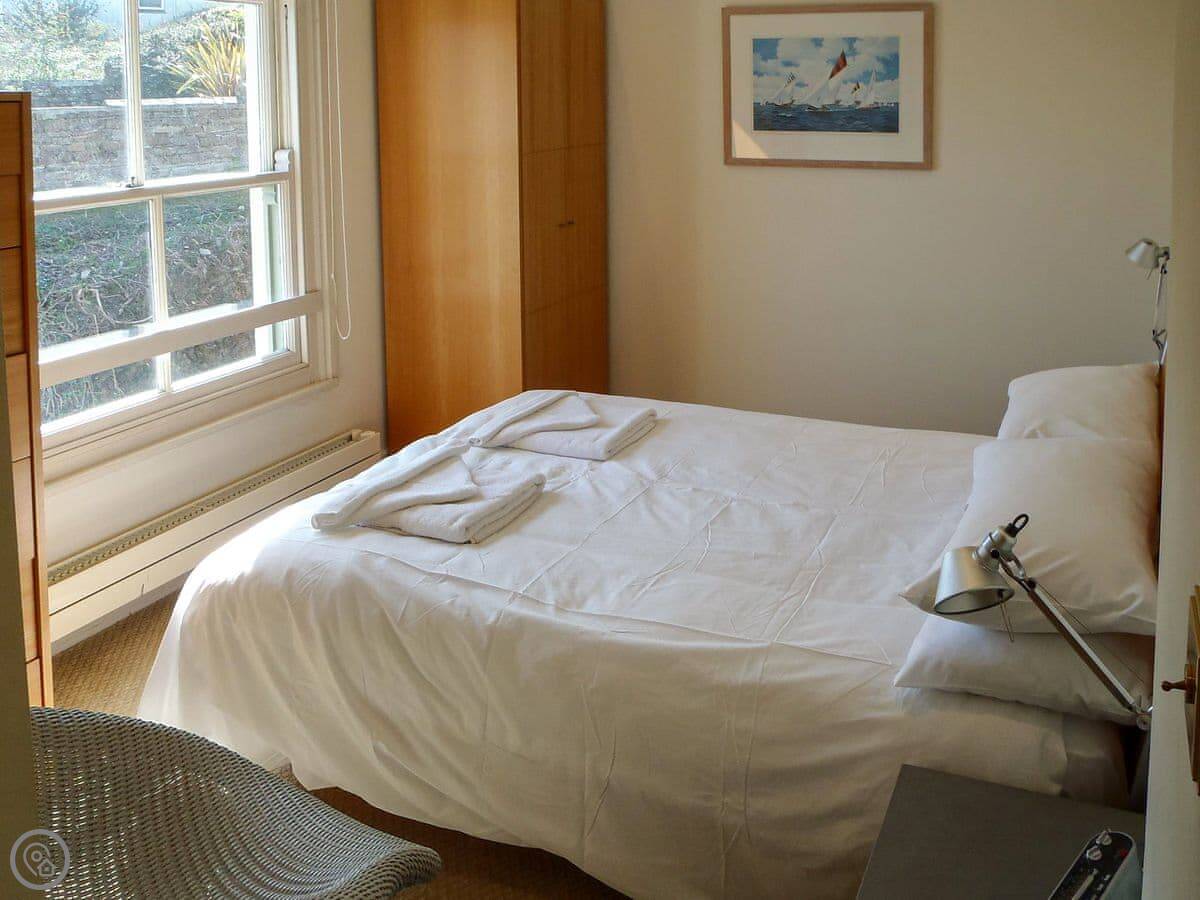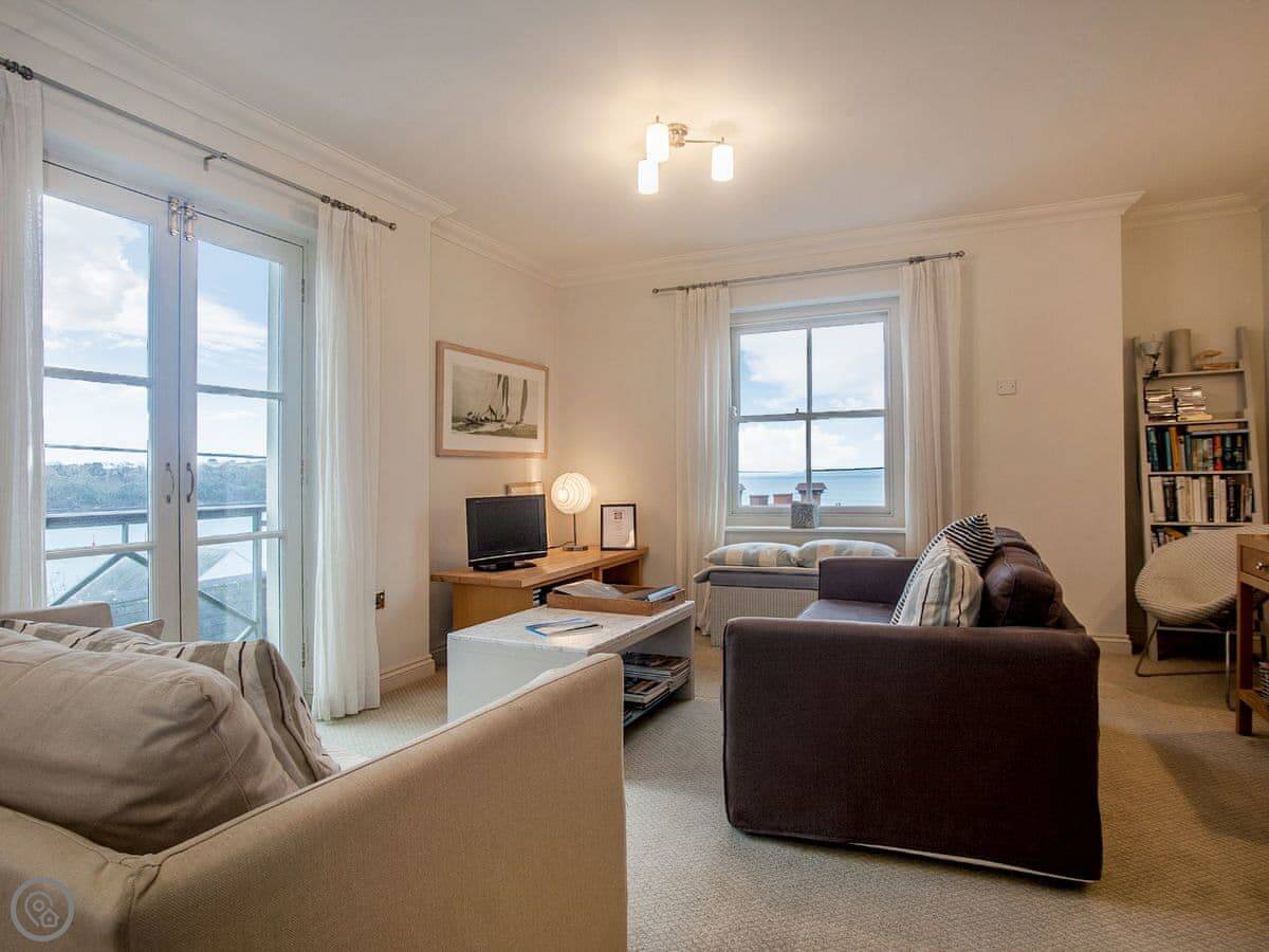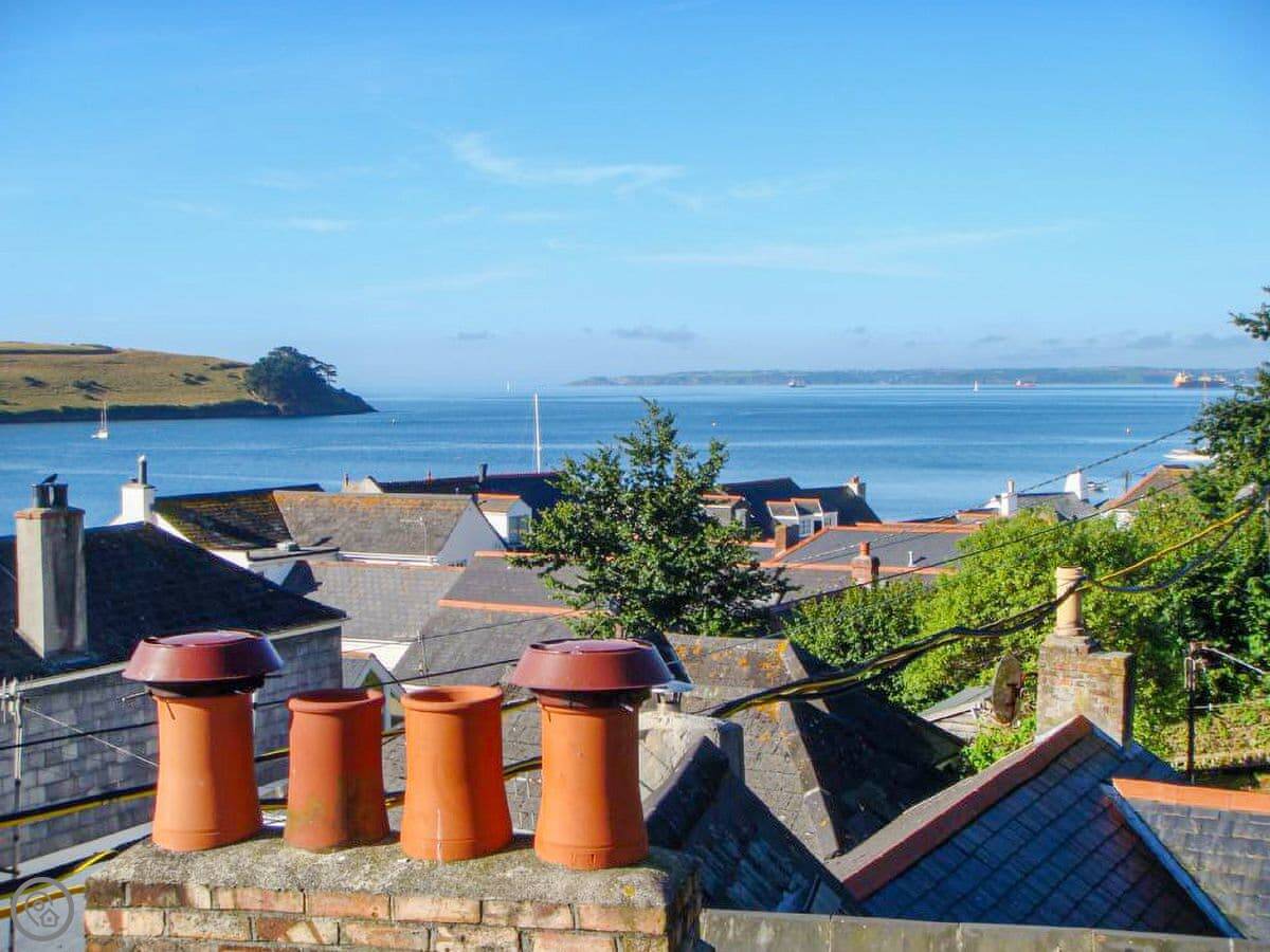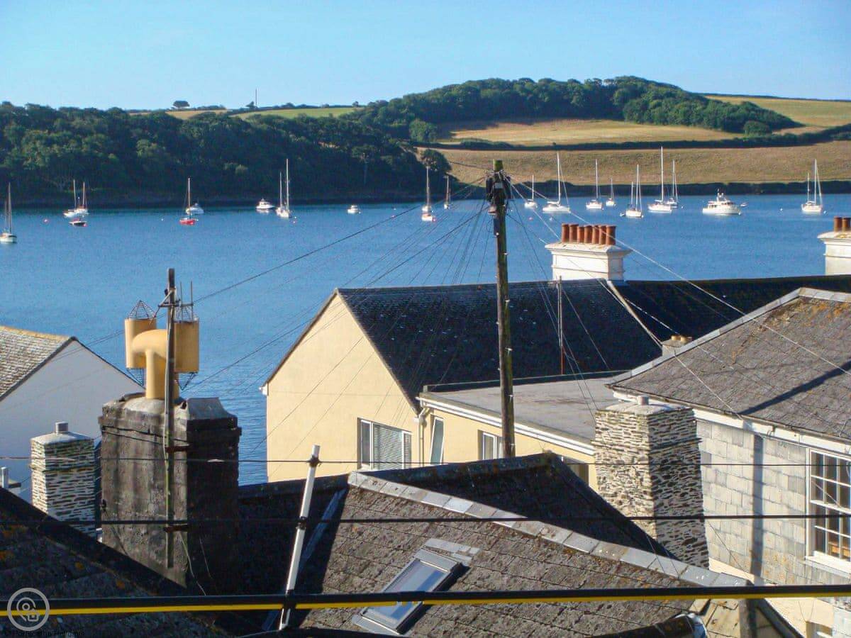 You can see the water from the living room. The view looks out over the harbour, towards Place and out to the Lizard. There are French doors that open onto a Juliet balcony. You can't step out onto it, but you can lean out.