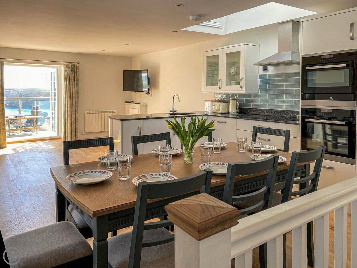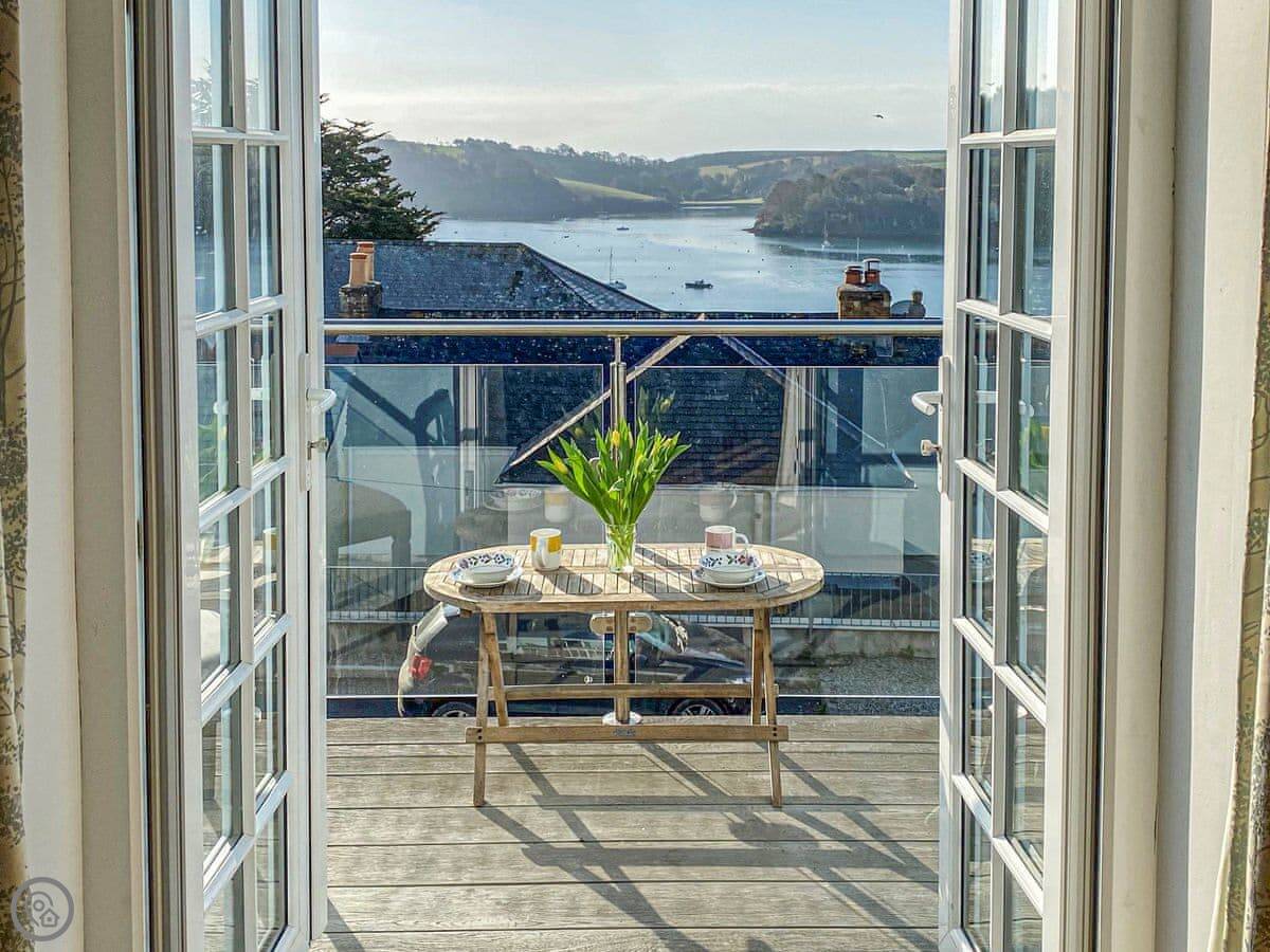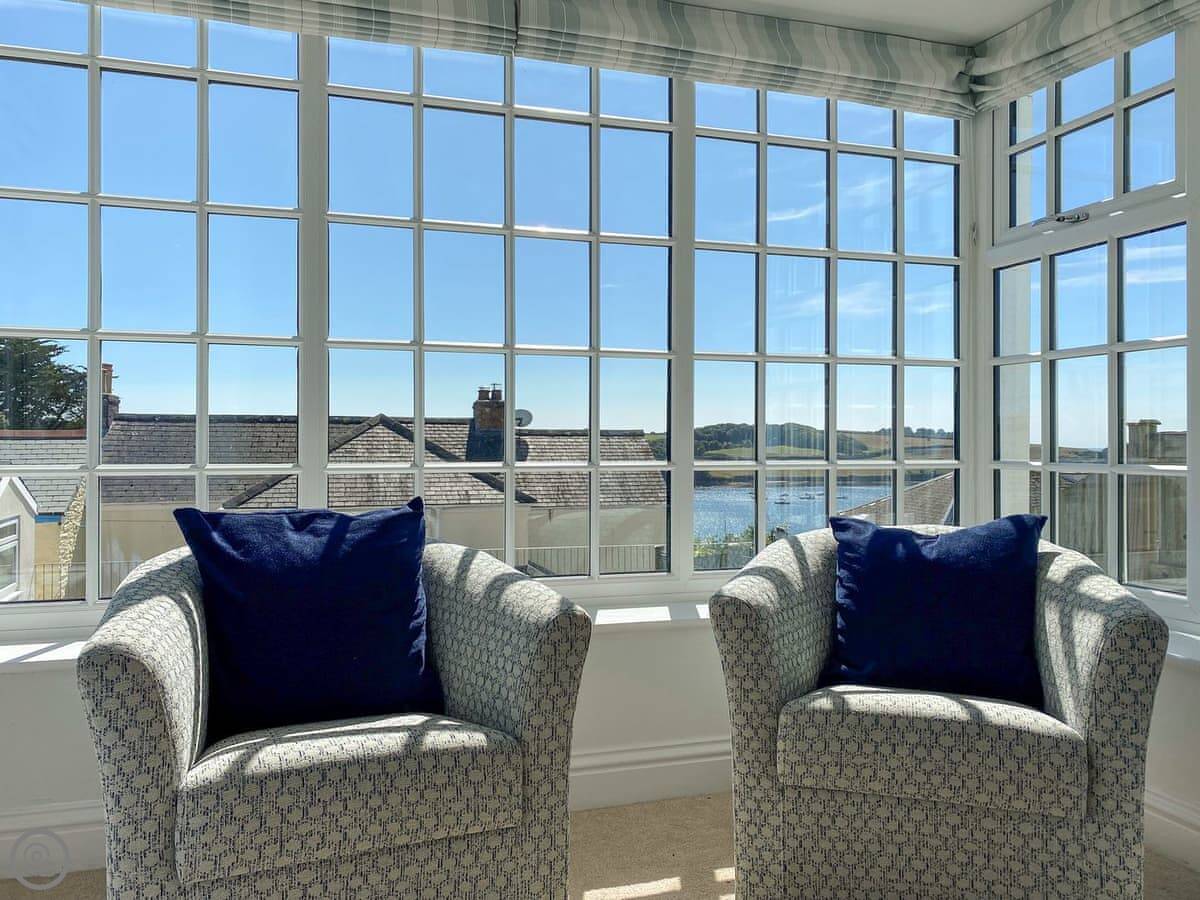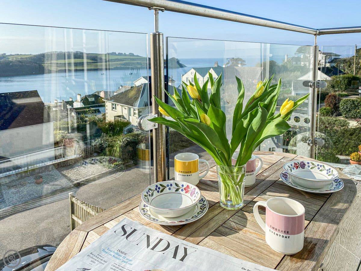 It's a house for eight people. Four bedrooms, three bathrooms. Two bedrooms are downstairs, both with their own shower room. One has a big window with a good view. Upstairs, the living room, kitchen and dining are all one space. That's so you can sit out on the balcony. The view from there is across the water towards St Anthony's Head.
