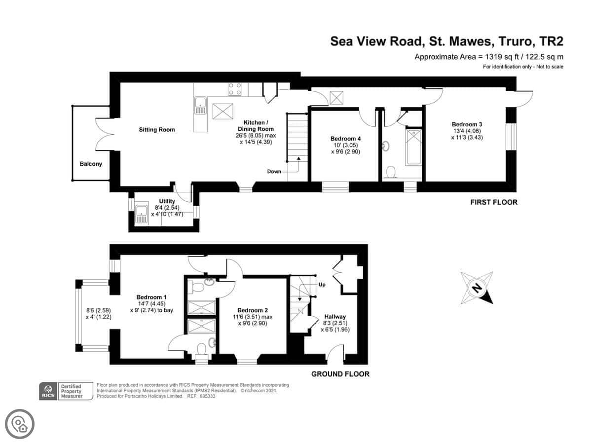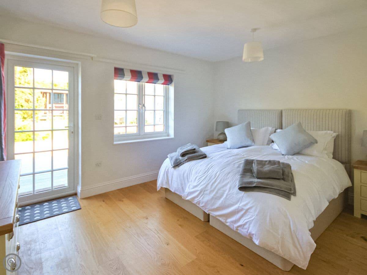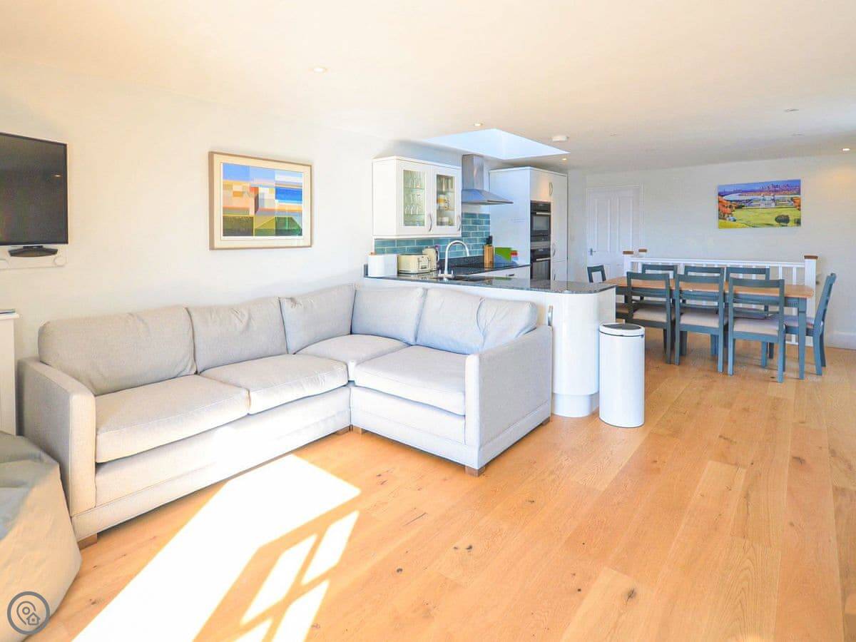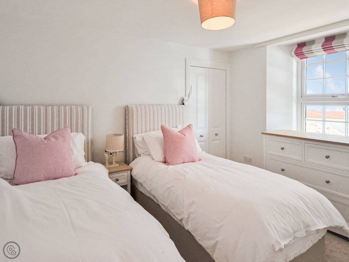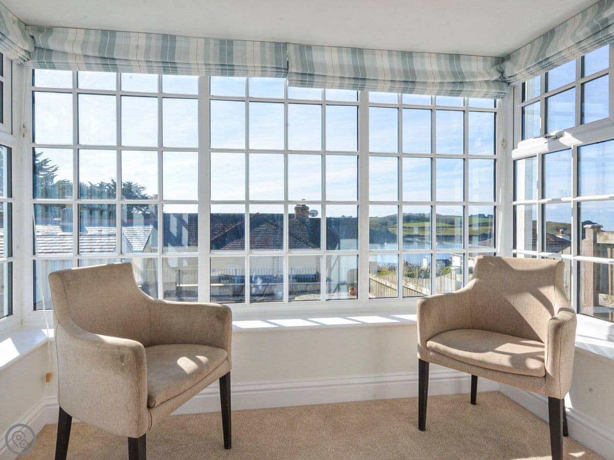 It's a house for eight people. Four bedrooms, three bathrooms. Two bedrooms are downstairs, both with their own shower room. One has a big window with a good view. Upstairs, the living room, kitchen and dining are all one space. That's so you can sit out on the balcony. The view from there is across the water towards St Anthony's Head.