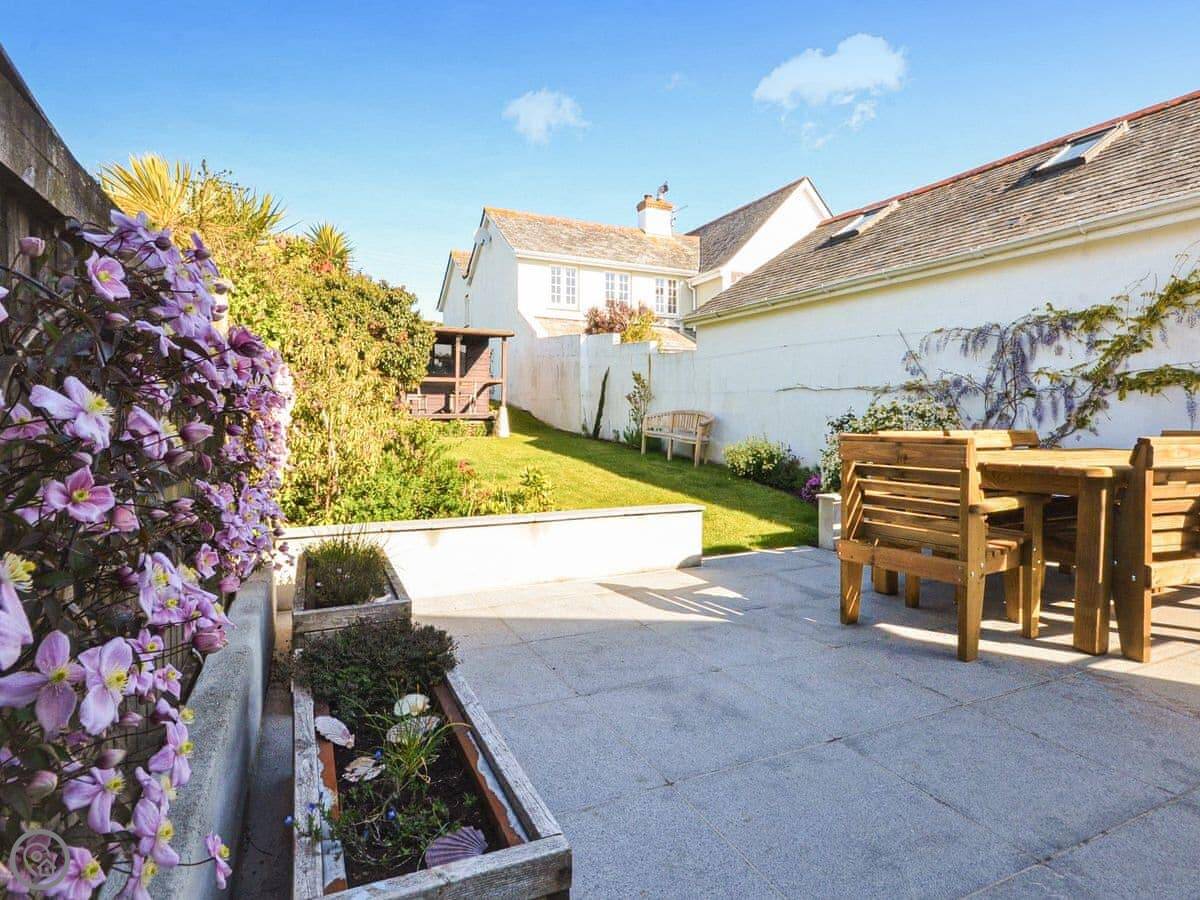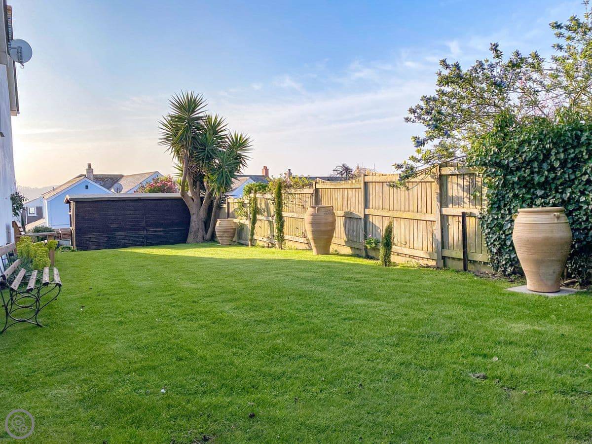 The stairs are fine. The garden is a decent size, mostly lawn with a patio area for sitting out. It's got a side entrance with a covered bit for bikes or wetsuits, and a tap to rinse sandy feet.