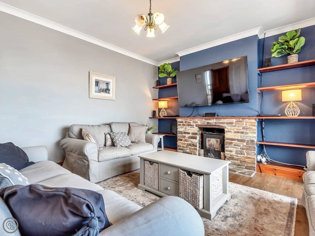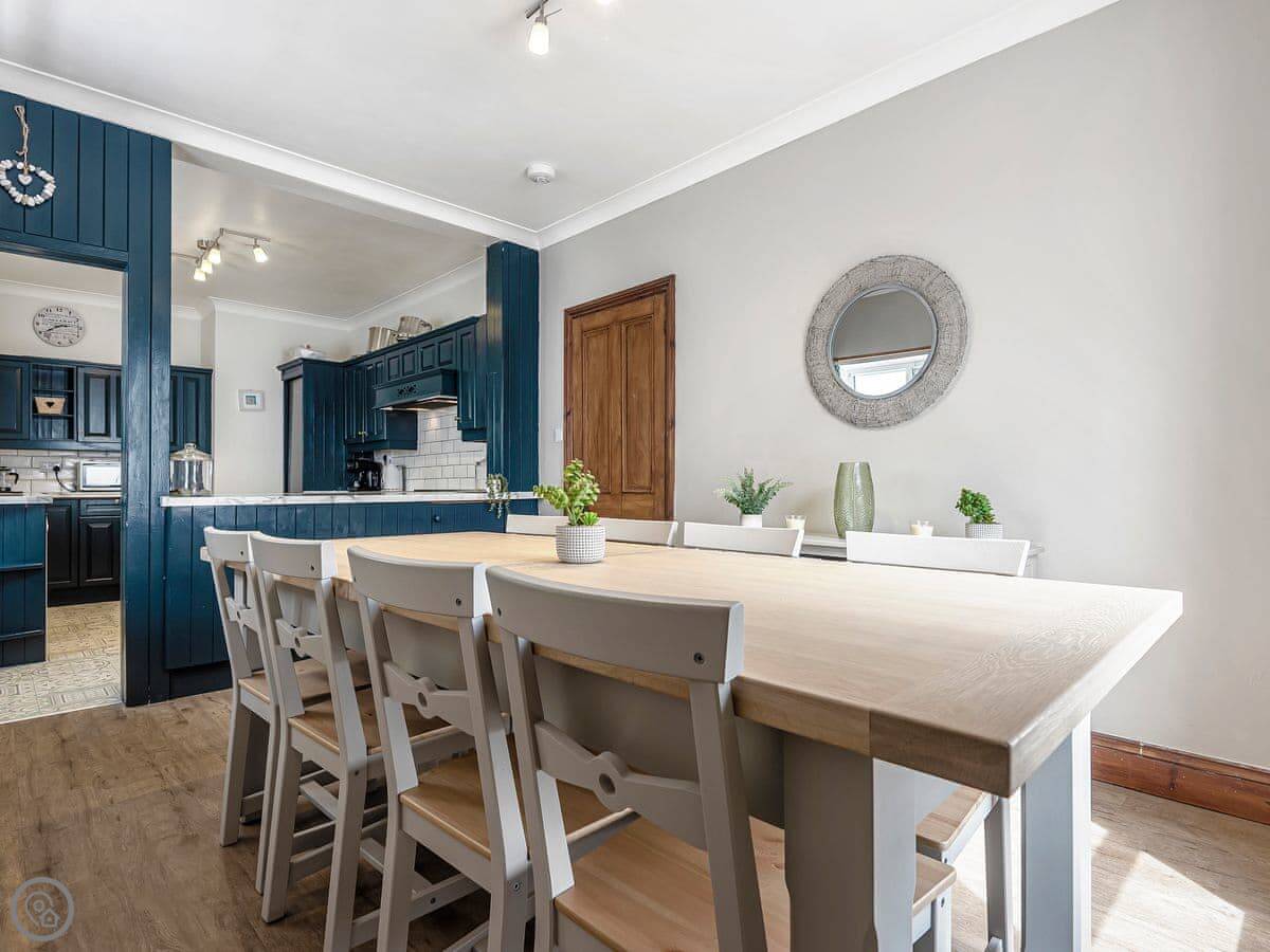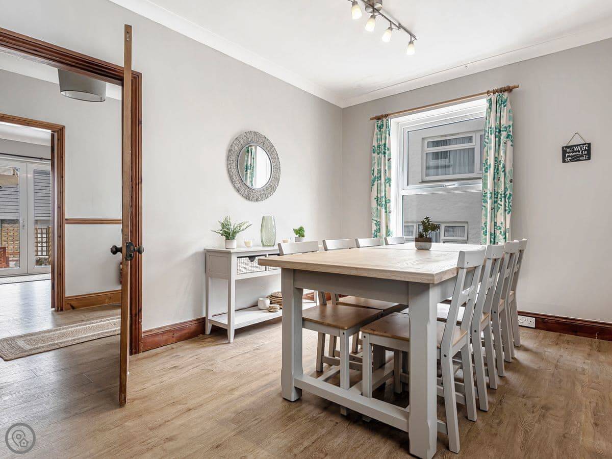 The living room is big. There's a wood burner for winter and a TV you can use for streaming. The kitchen table extends to seat everyone. Through the kitchen is the utility room and a door to the parking space.