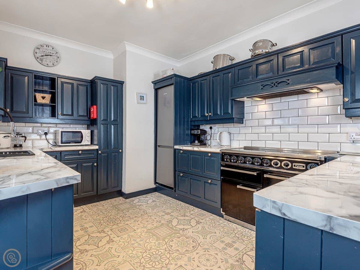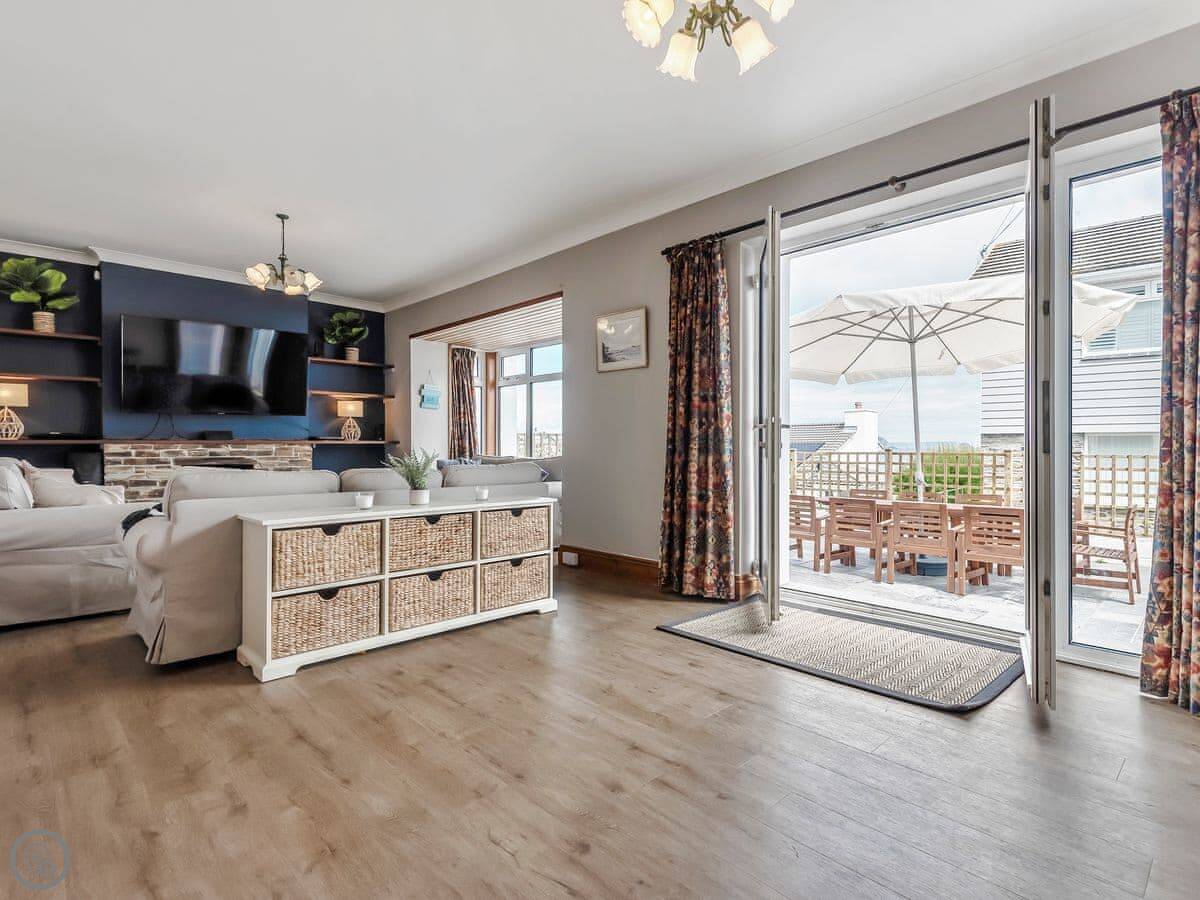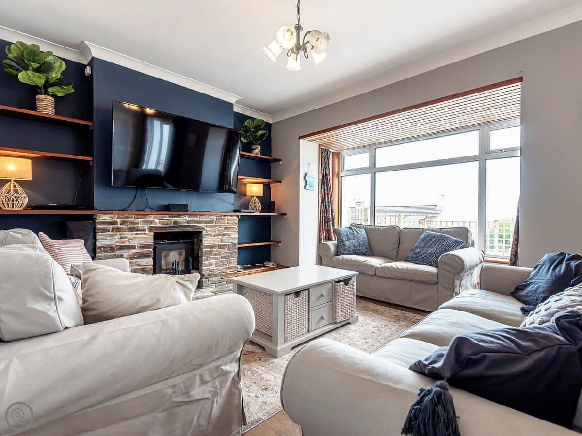 The living room is big. There's a wood burner for winter and a TV you can use for streaming. The kitchen table extends to seat everyone. Through the kitchen is the utility room and a door to the parking space.