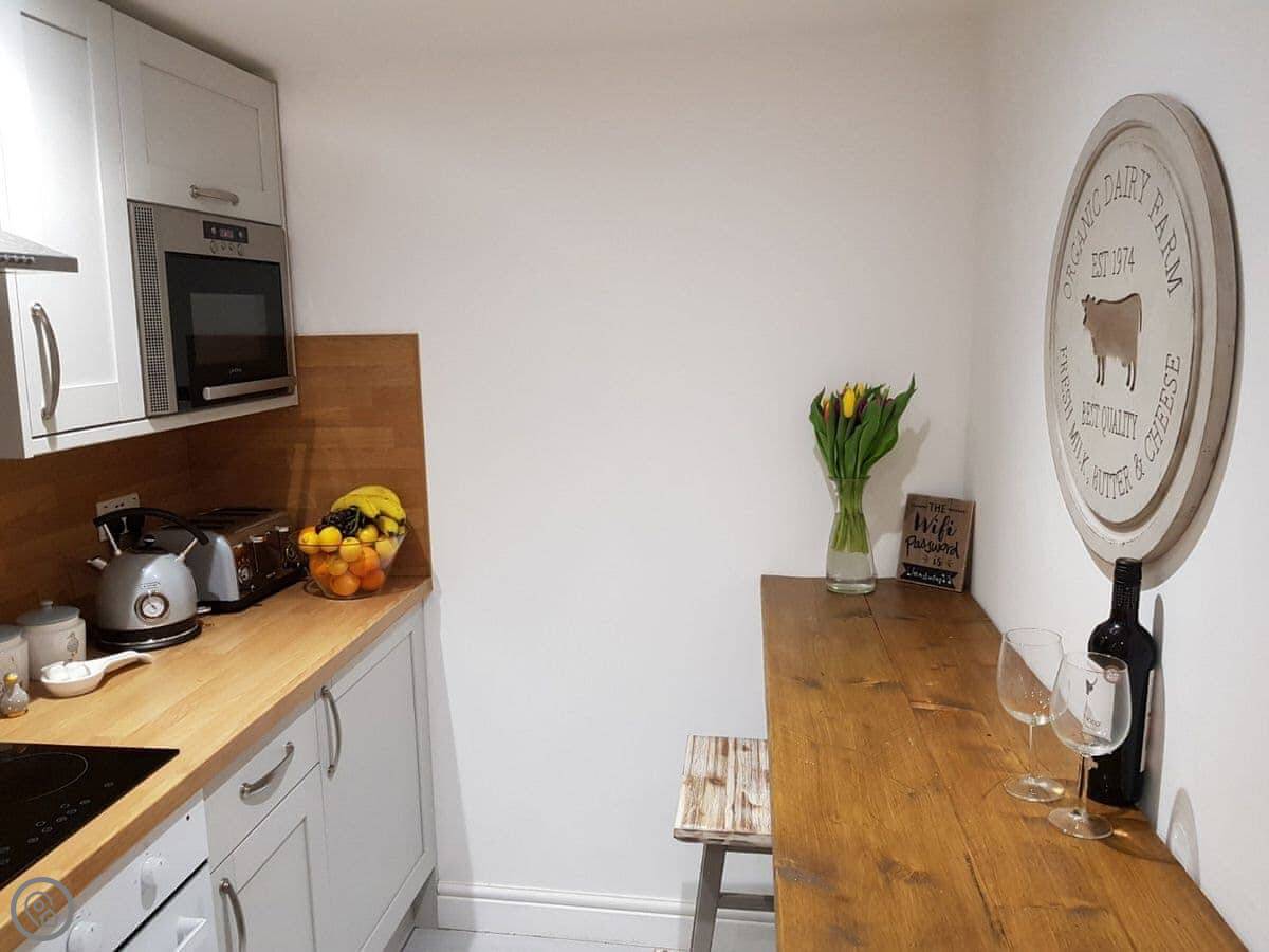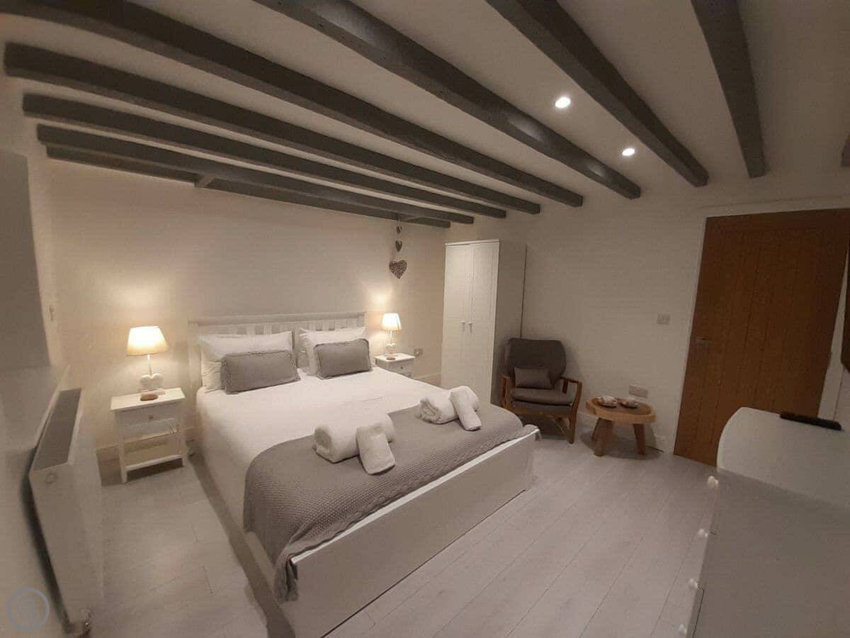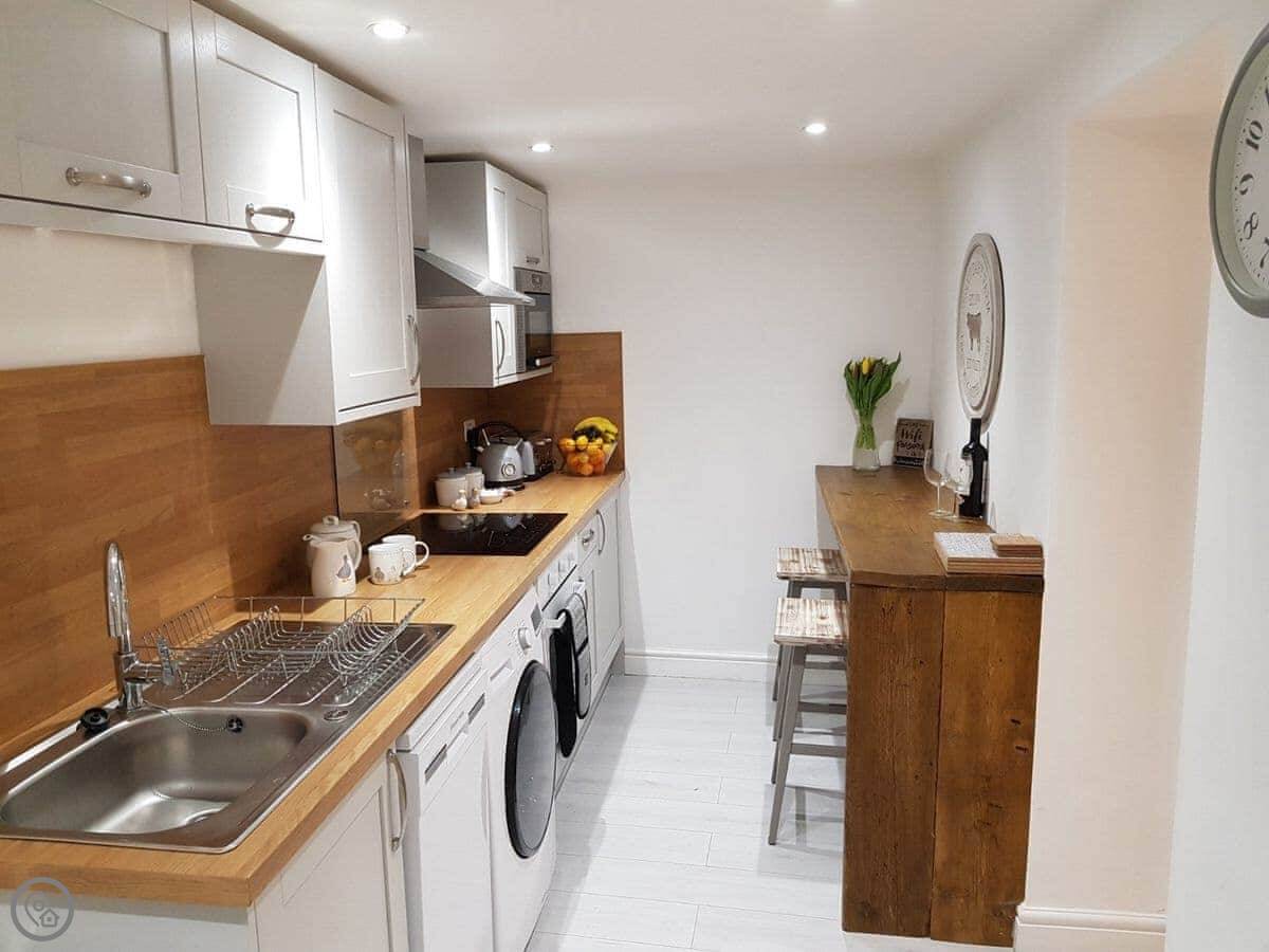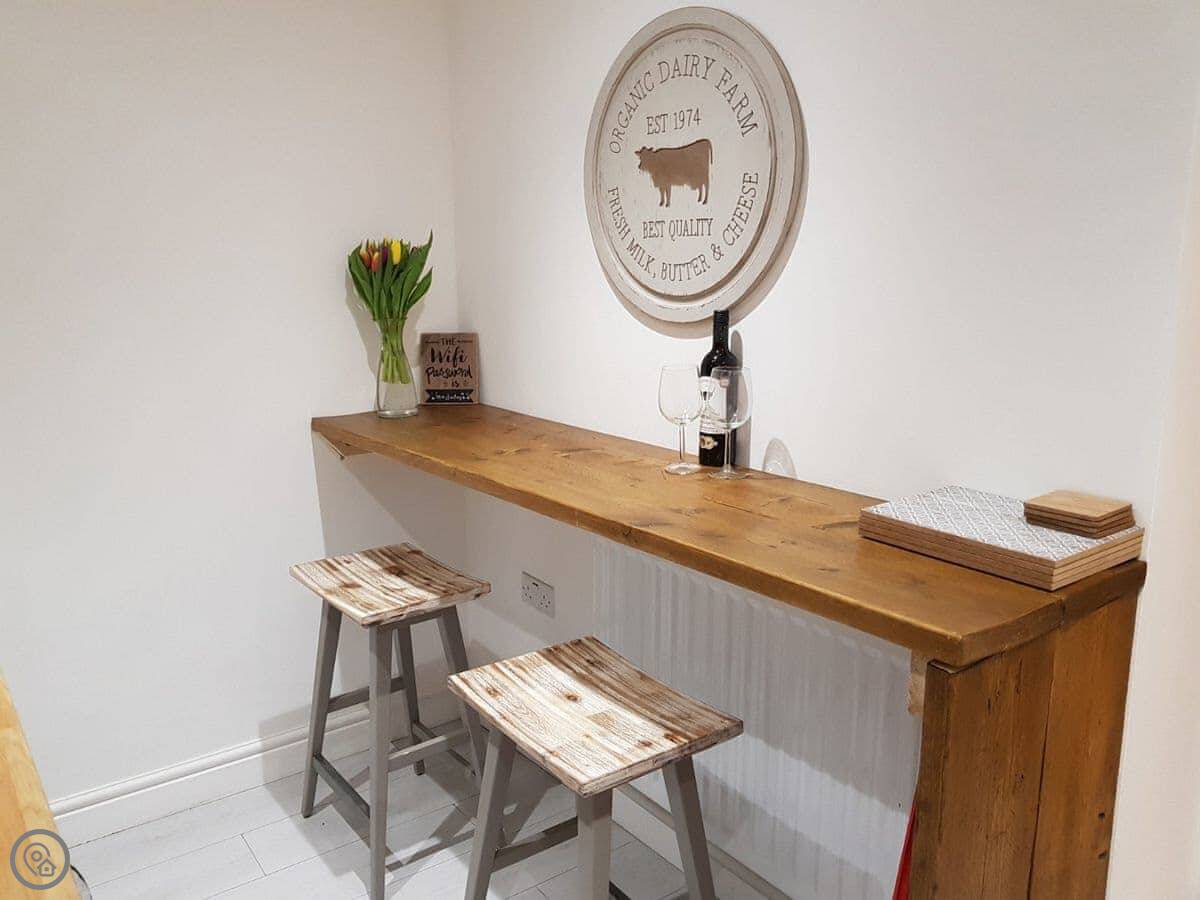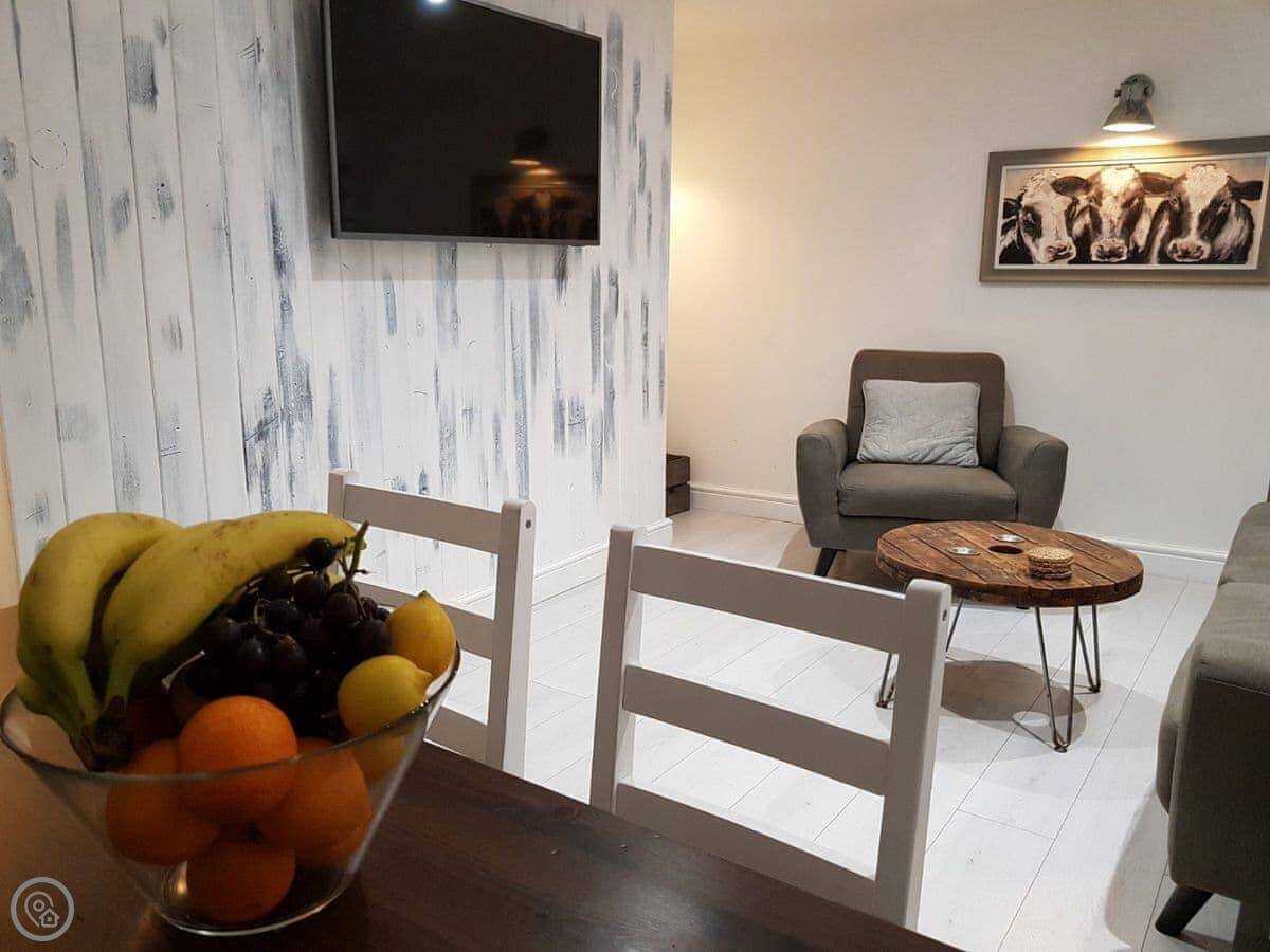 It's got a four star rating, so it's well looked after. The kitchen is a proper full size one. The beams make it feel like a cottage but everything else is modern. There's a TV and WiFi.