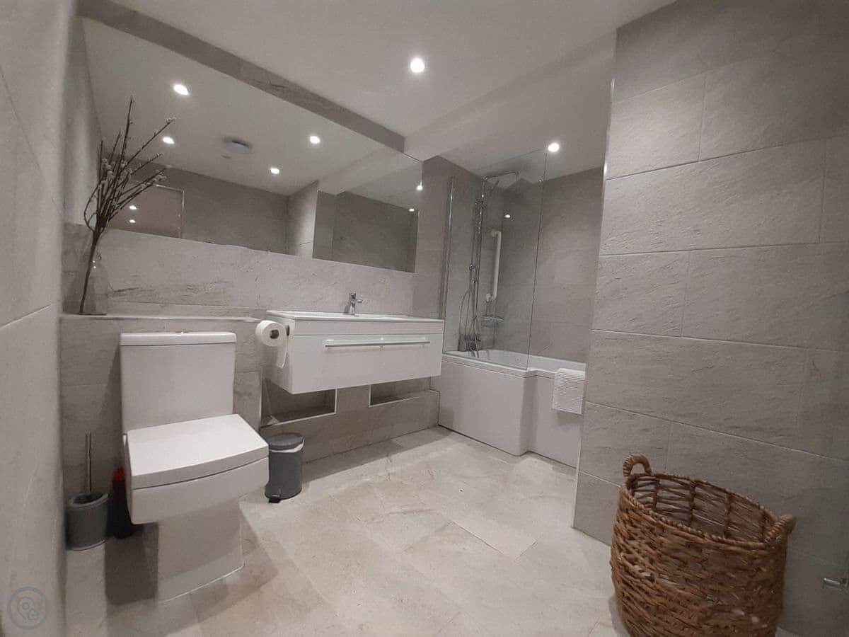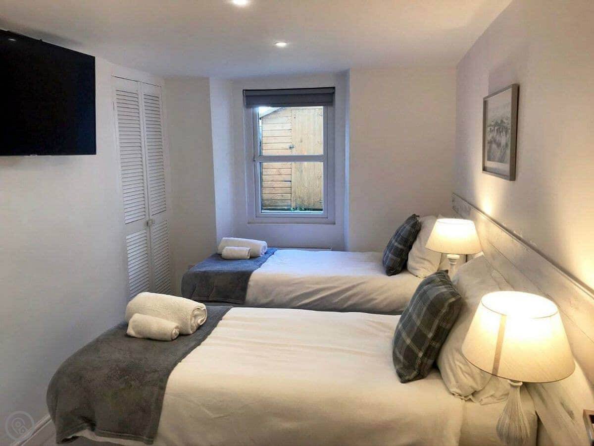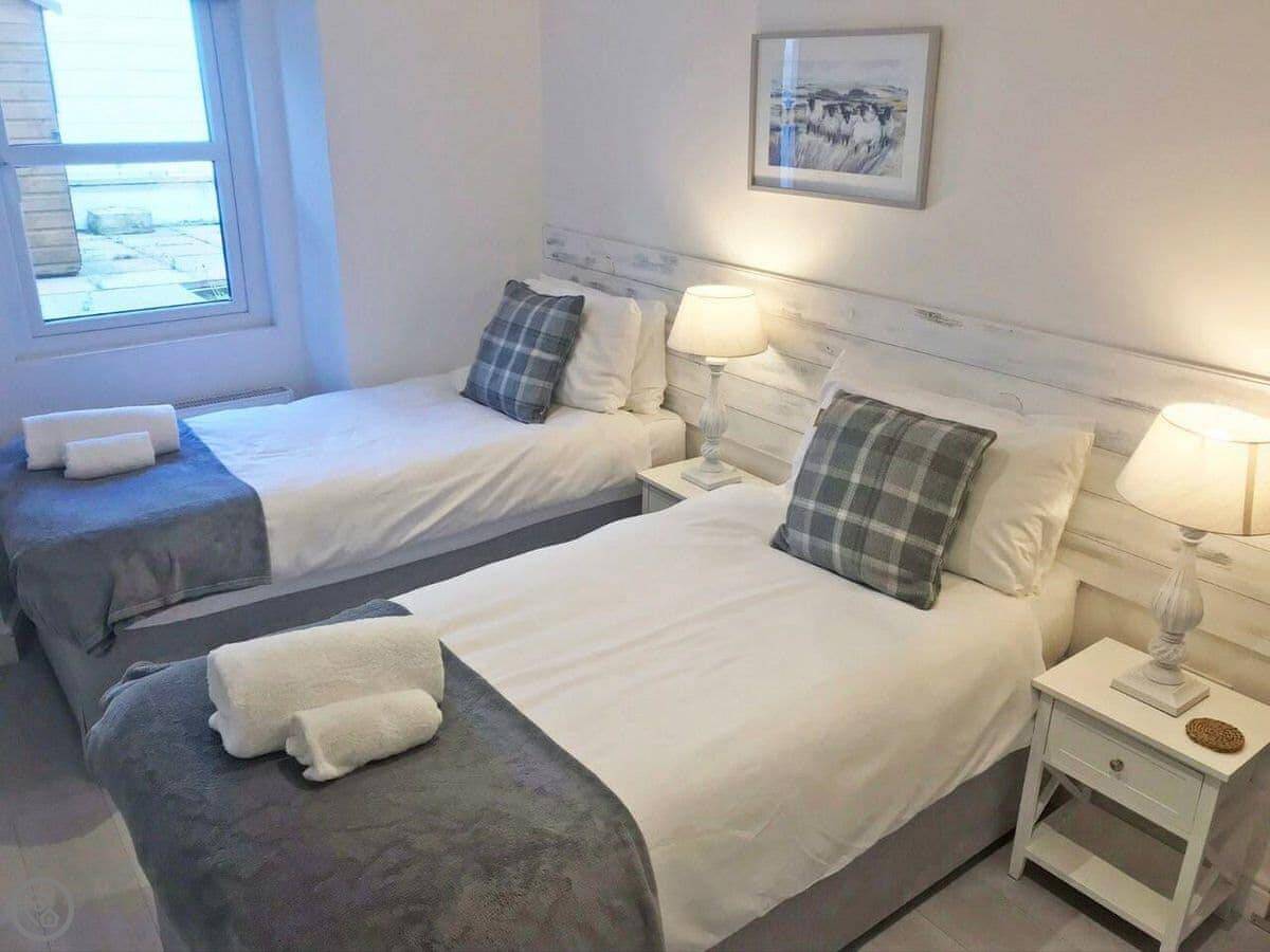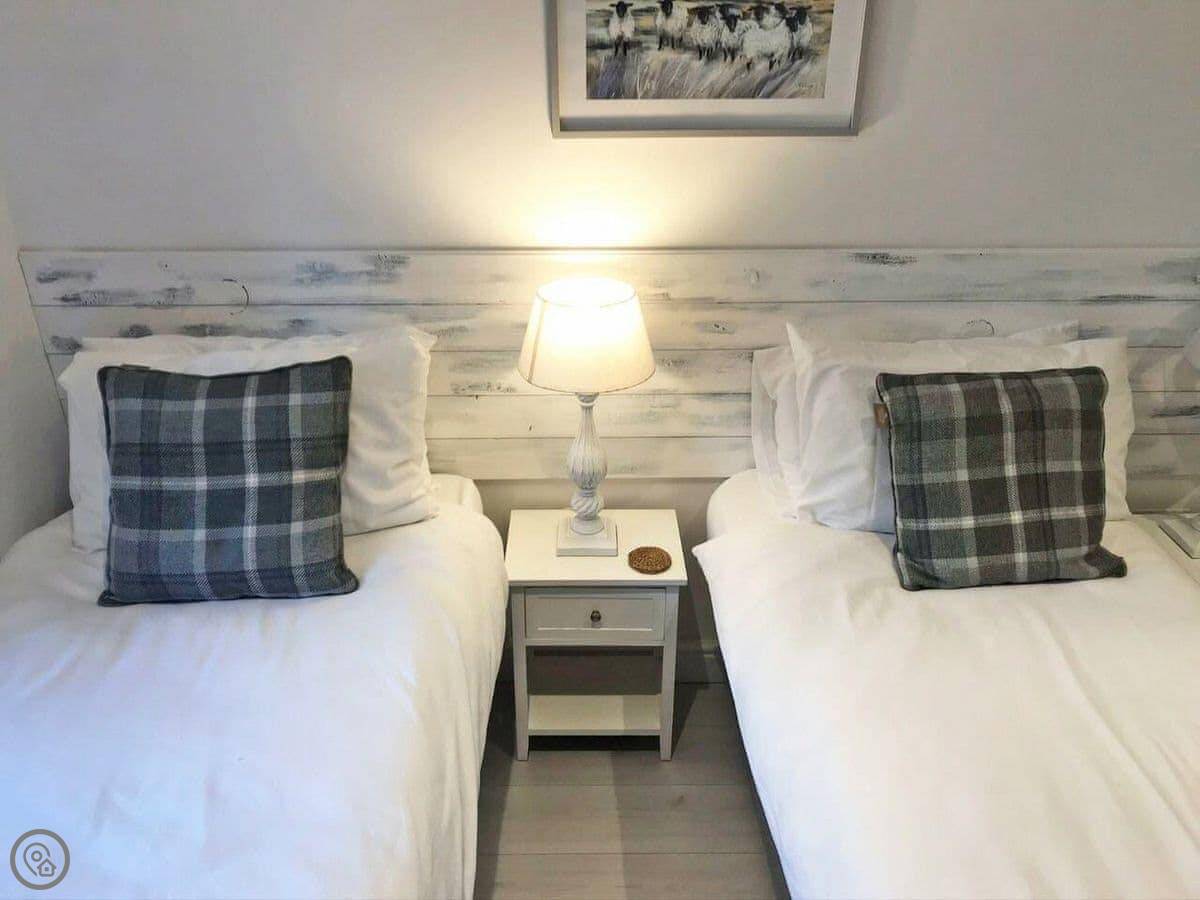 It sleeps six. Two bedrooms, but both with king size beds. One bathroom with a shower over the bath. We've put grab rails in there. You can bring one dog.
