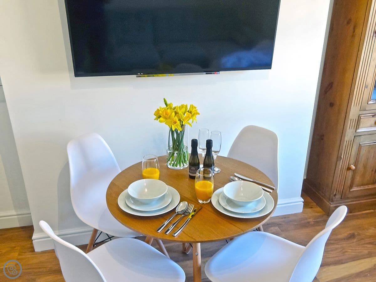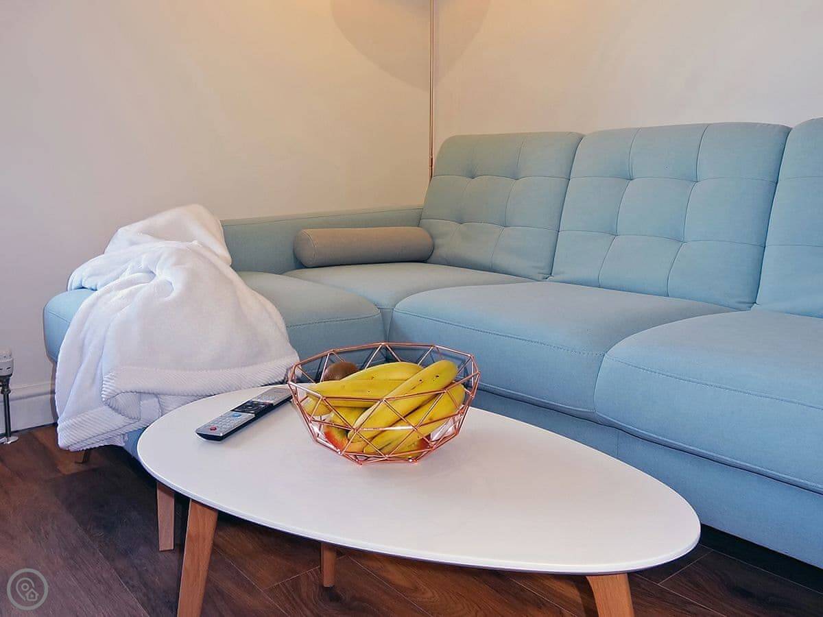 The living room and kitchen are all in one space. The main thing is the view. You get a good look at the Great Orme and the bay from the big windows. There's a 4K TV with internet.