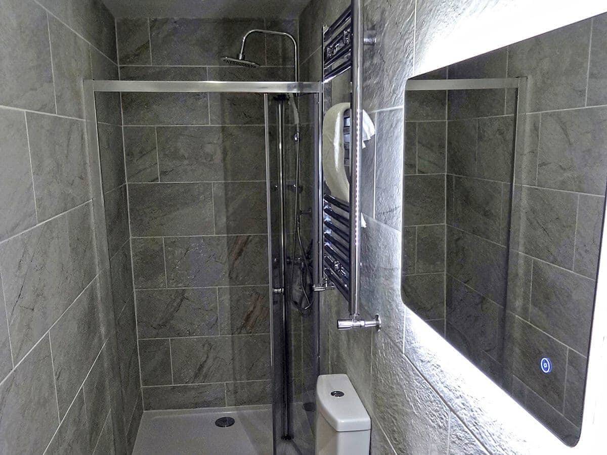 It's a one-bedroom apartment for two people. There are two bathrooms, both with showers, which is handy. The bedroom is upstairs. The stairs are a modern open-tread design.