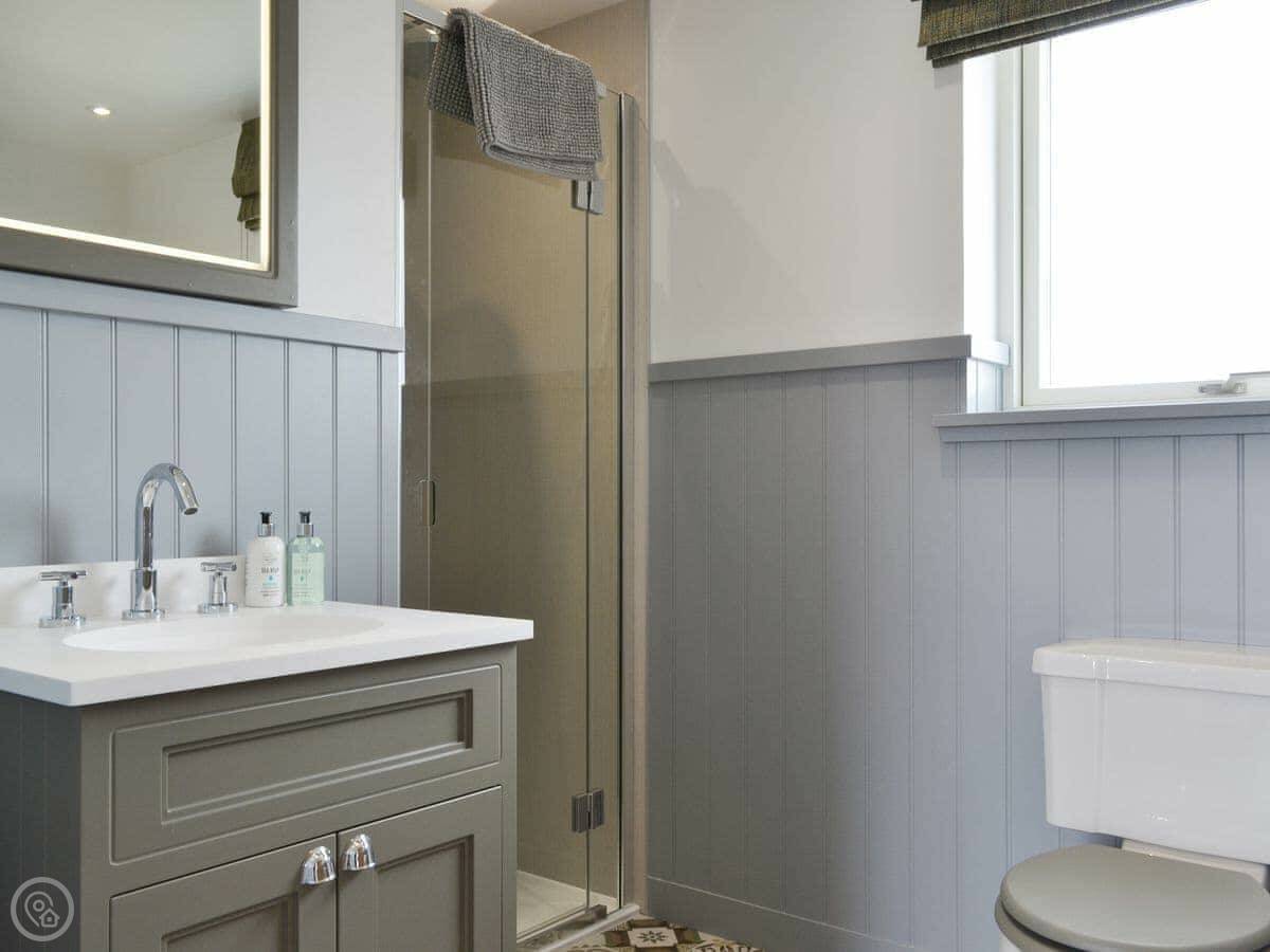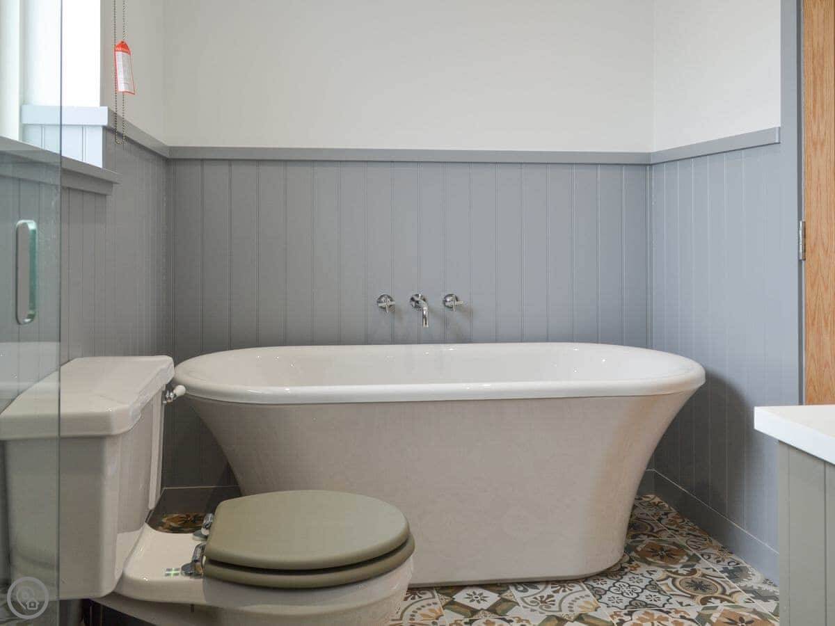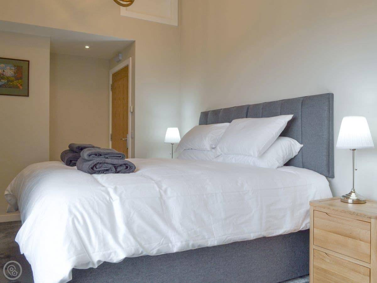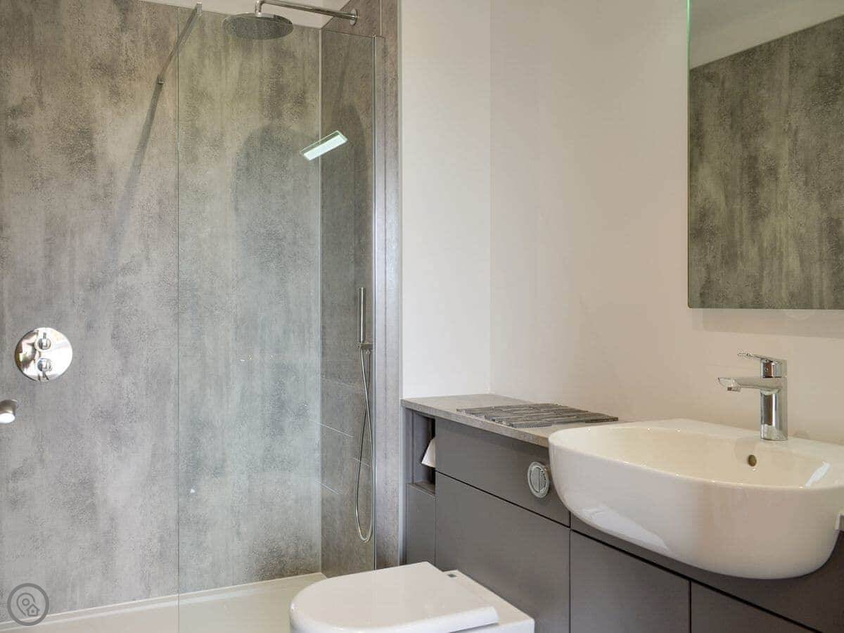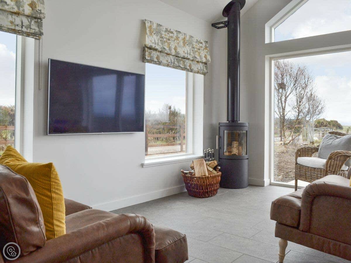 It sleeps four. Two bedrooms and two bathrooms. One is an en-suite shower room off the main bedroom, which has a king-size bed. The other is a twin room. We put underfloor heating throughout and there's a wood burner in the living area. It was all done up in 2020, so the appliances are decent. It's warm.
