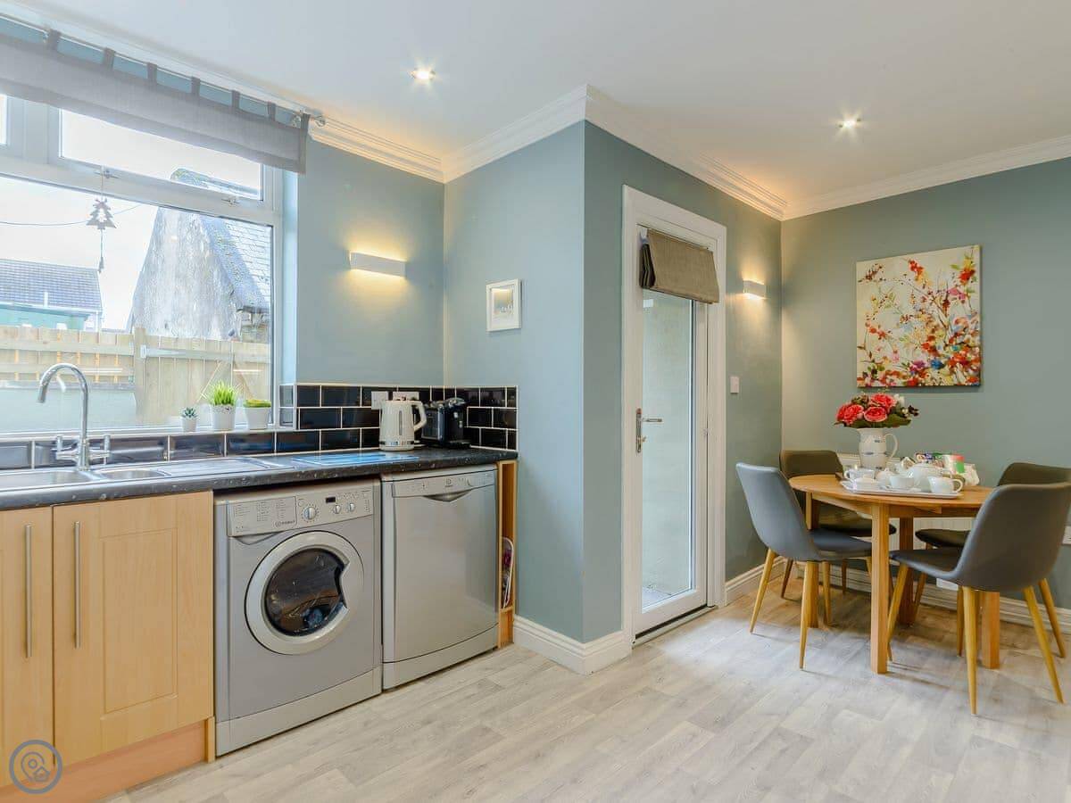 For facilities, you've got WiFi, a Smart TV, a washing machine, and a dishwasher. Bedding and towels are included. There's a cot and a highchair if you need them. One well-behaved dog is allowed. They can't be left alone in the cottage, but the owners can arrange a dog sitter or walker if you ask in advance for a small charge.