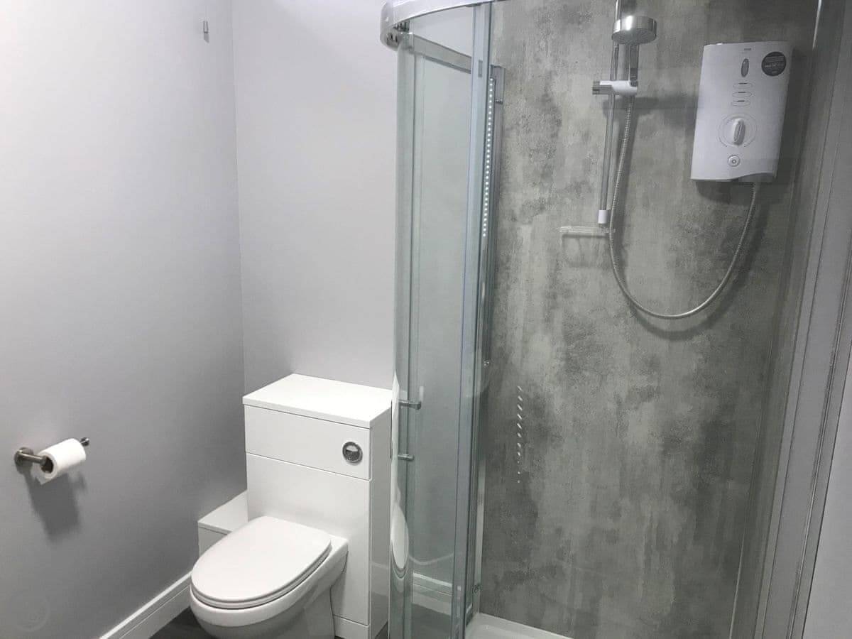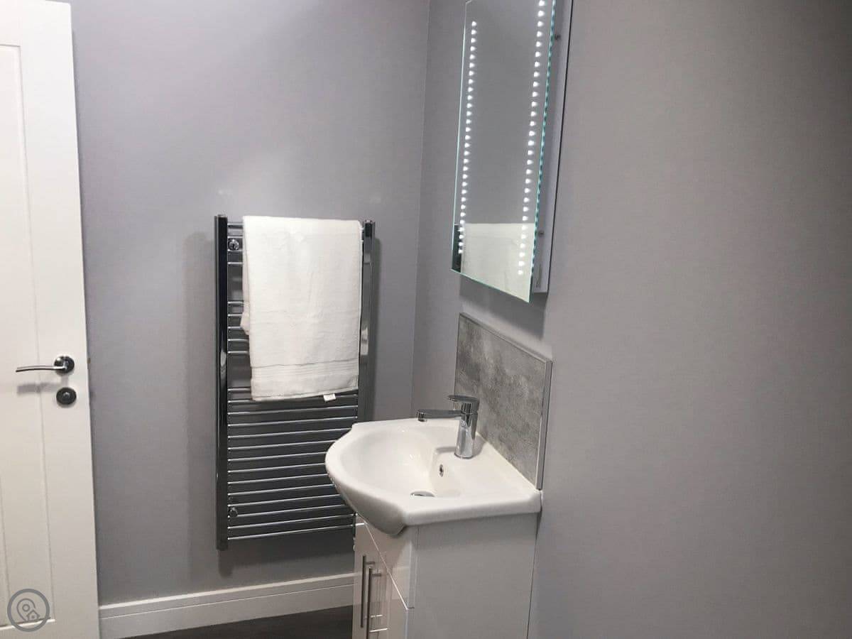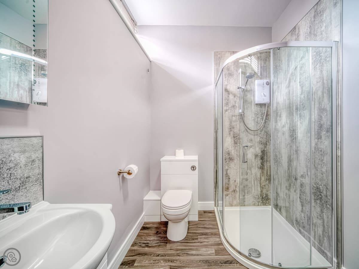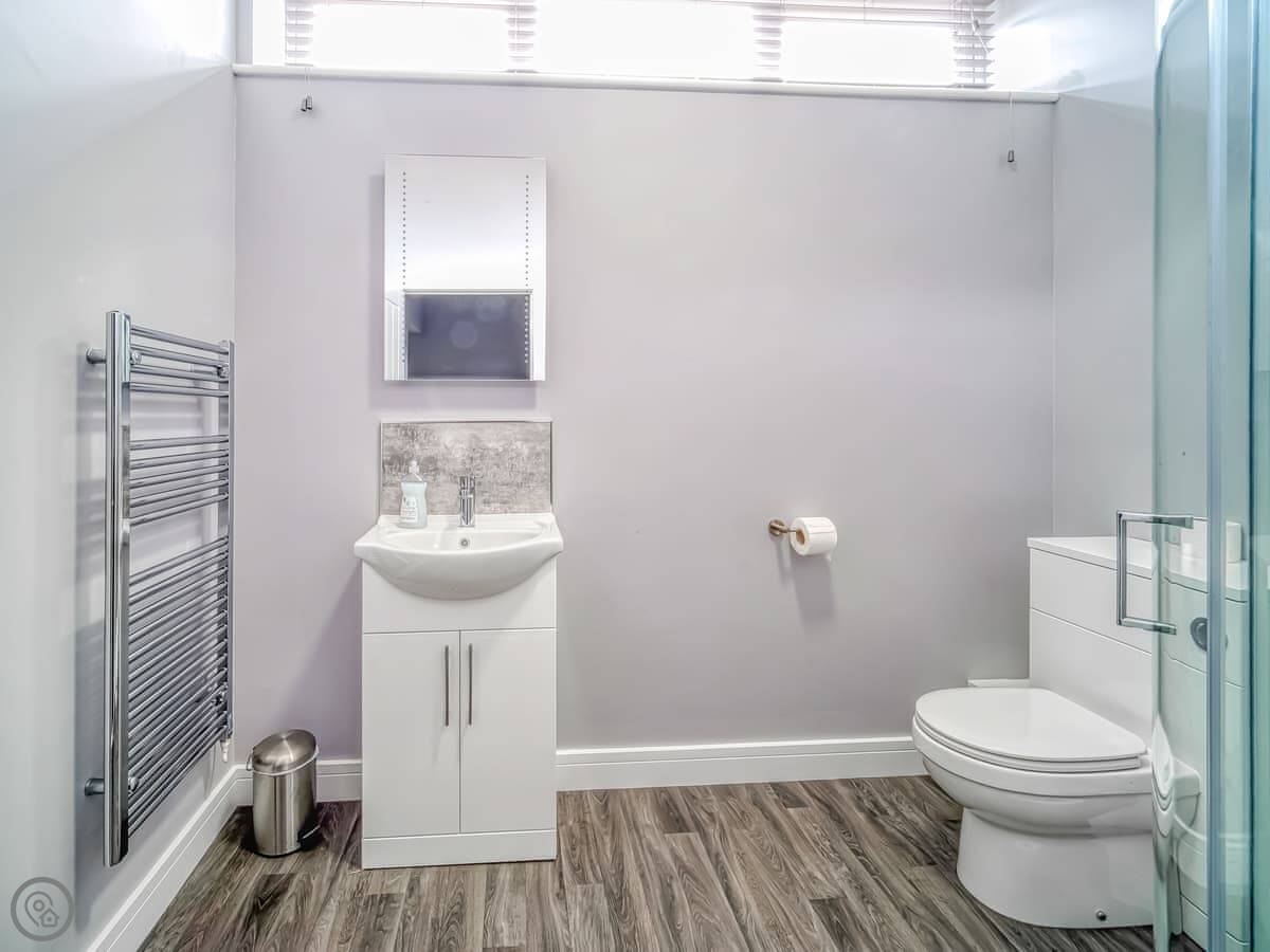 The bedroom has a double bed. The bathroom has a shower. The main room is open plan, with the kitchen, a dining table, and a sofa. The kitchen has a dishwasher. There's Wi-Fi and a TV. All the bedding and towels are included.