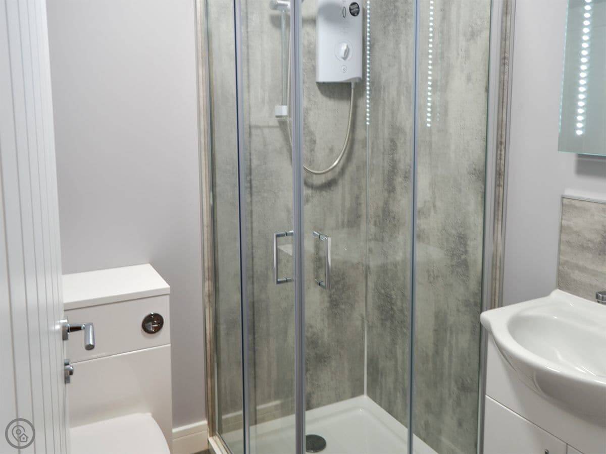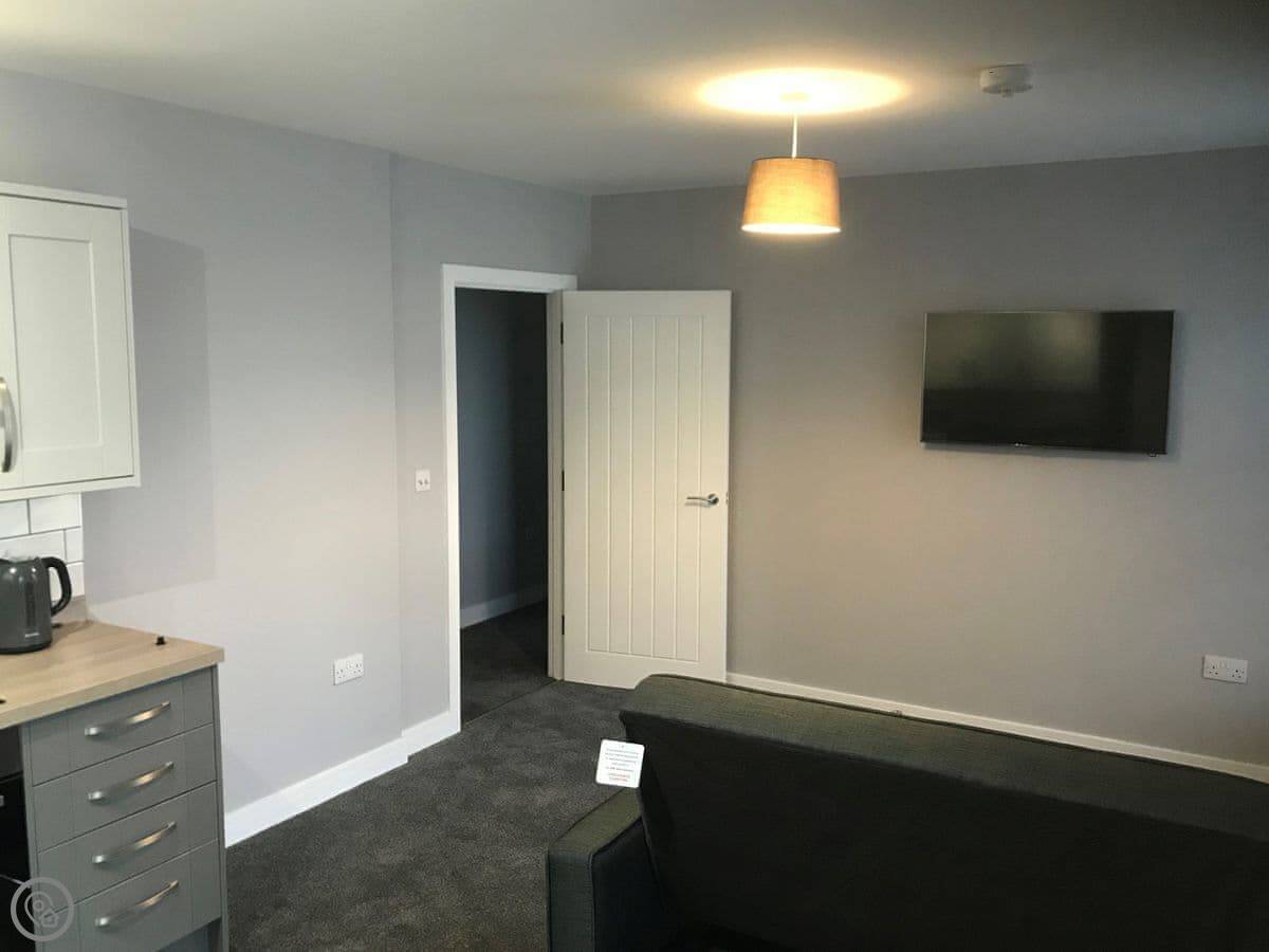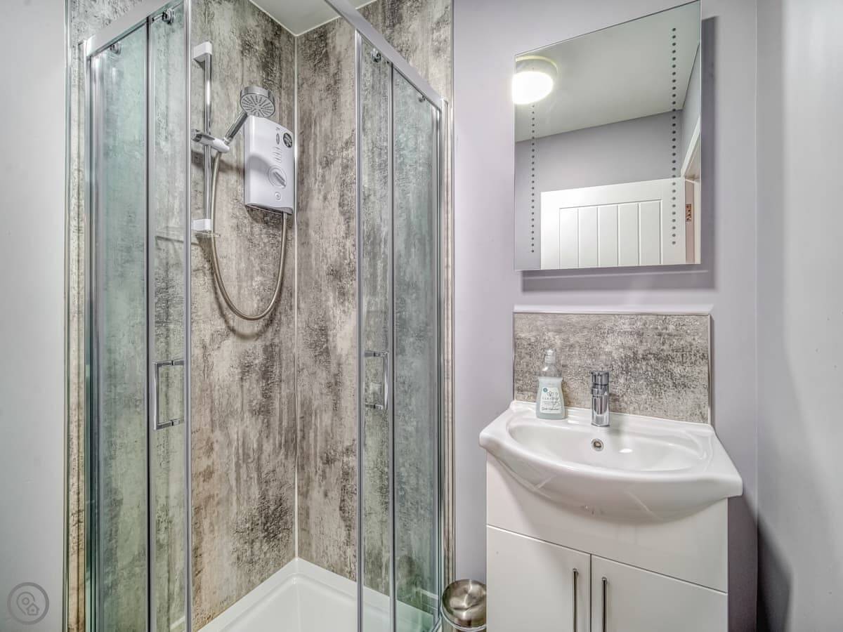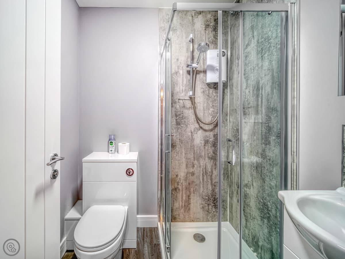 The building has been refurbished. Your flat is all yours, no shared spaces inside. The bedroom's a decent size with a double bed. The shower room has one of those lit-up mirrors. The main room is open plan: kitchen, dining table, and living area with a sofa that can be made into another double bed if you need it. The kitchen has a dishwasher.