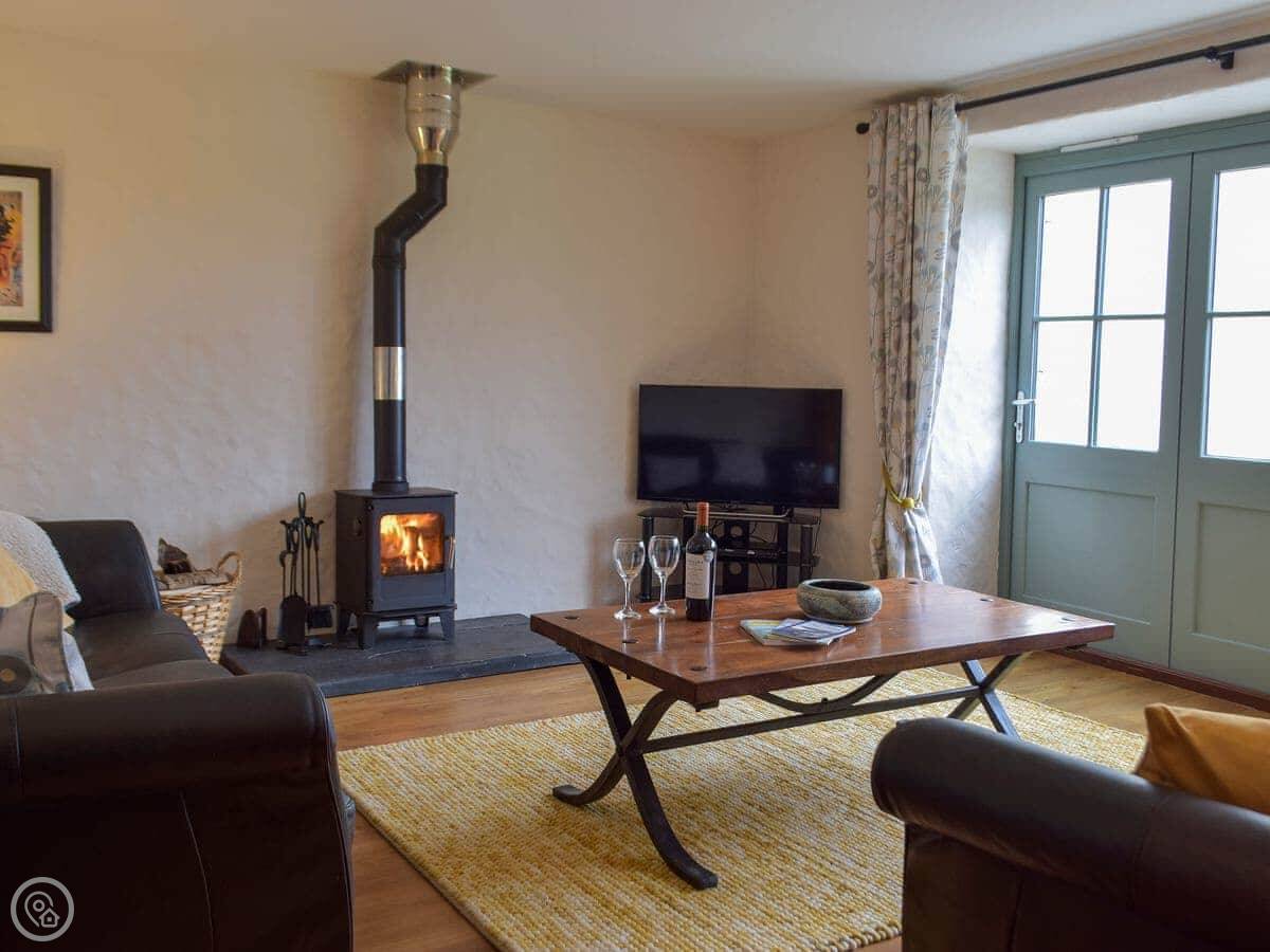 The main living area has big doors that open onto a terrace. There's a wood burner for cooler evenings. The kitchen is a good size. There's a smaller snug area off the kitchen, which is handy.
