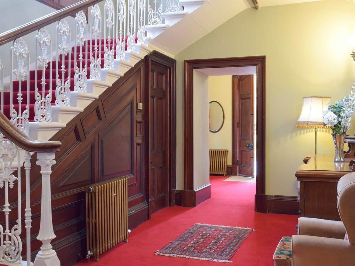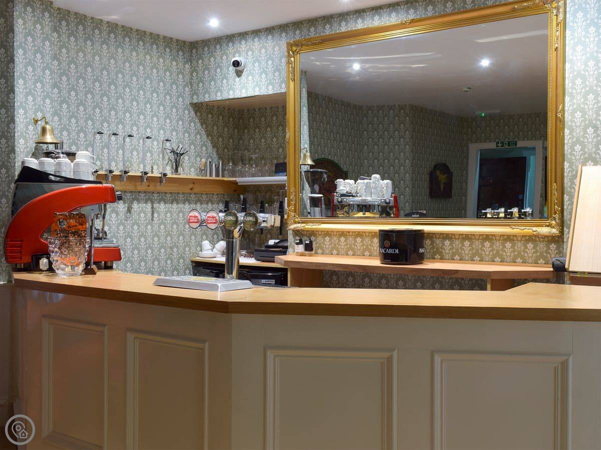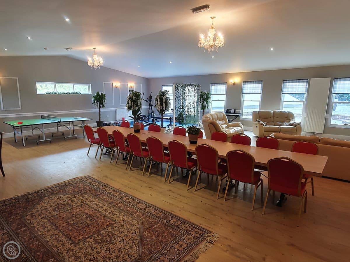 It's got a five-star rating. That means it's very well finished, comfortable, and has everything you'd expect for a high-end stay. There's a big catering kitchen and a banqueting hall. People often book caterers for events here. There's also a games room, plenty of parking, and the garden and patio areas.