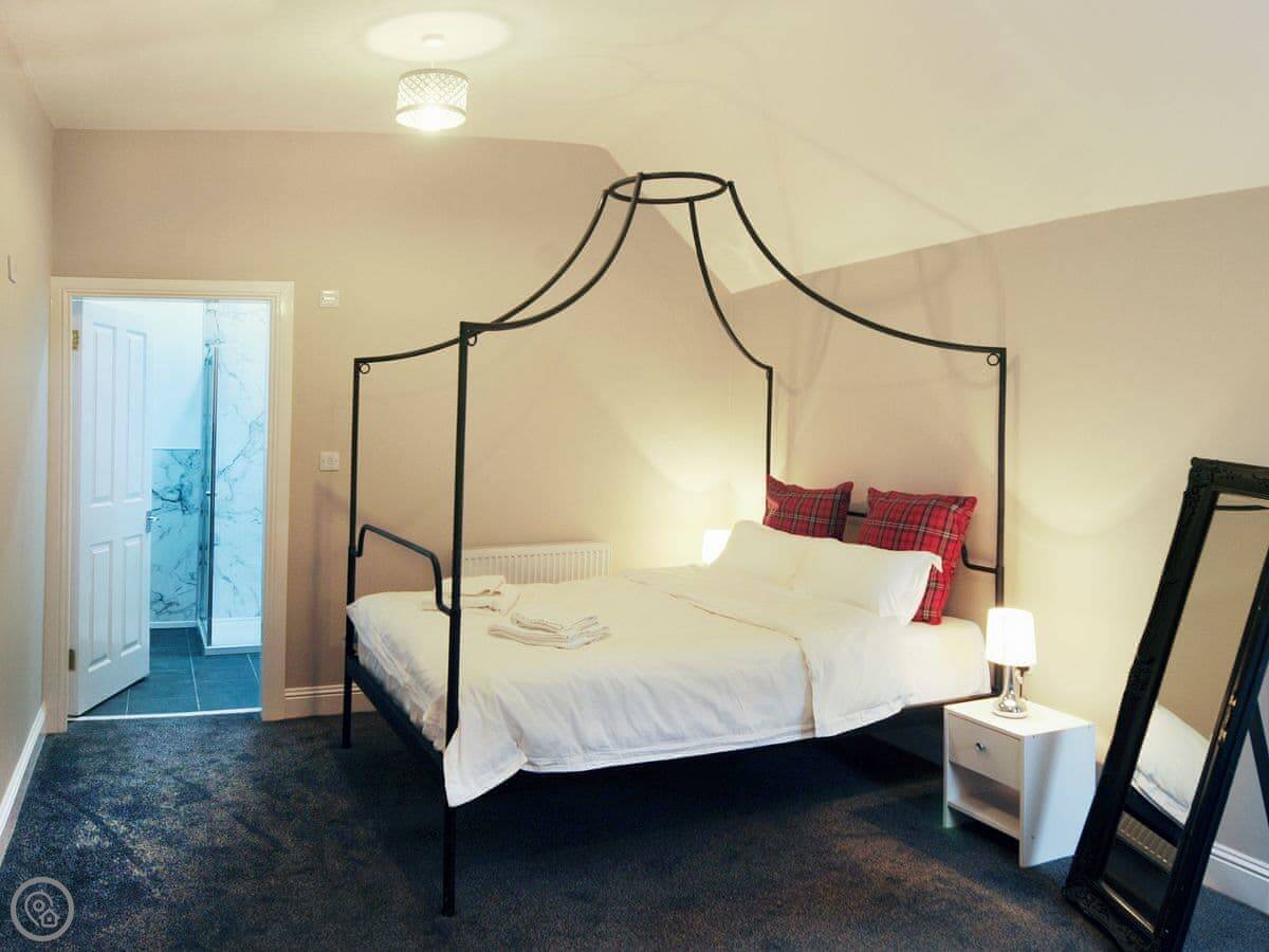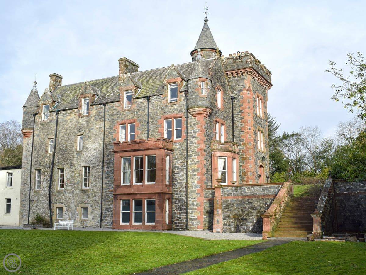 Machermore Castle is near Newton Stewart, in Dumfriesshire. It's a 16th-century castle on the banks of the River Cree, with about 30 acres of its own woodland. It's detached, obviously. The place sleeps up to twenty people, so it's for big groups. There are ten bedrooms and eight bathrooms, all of them en-suite.