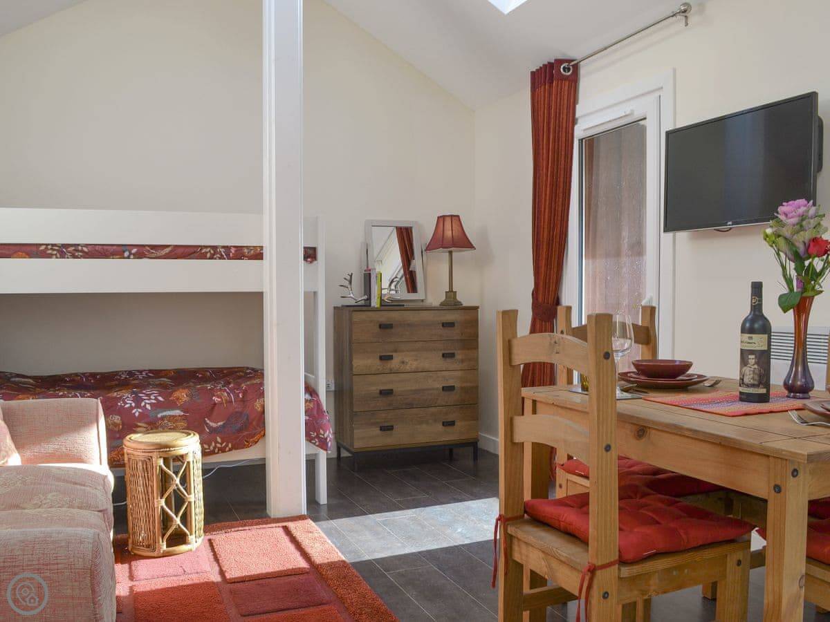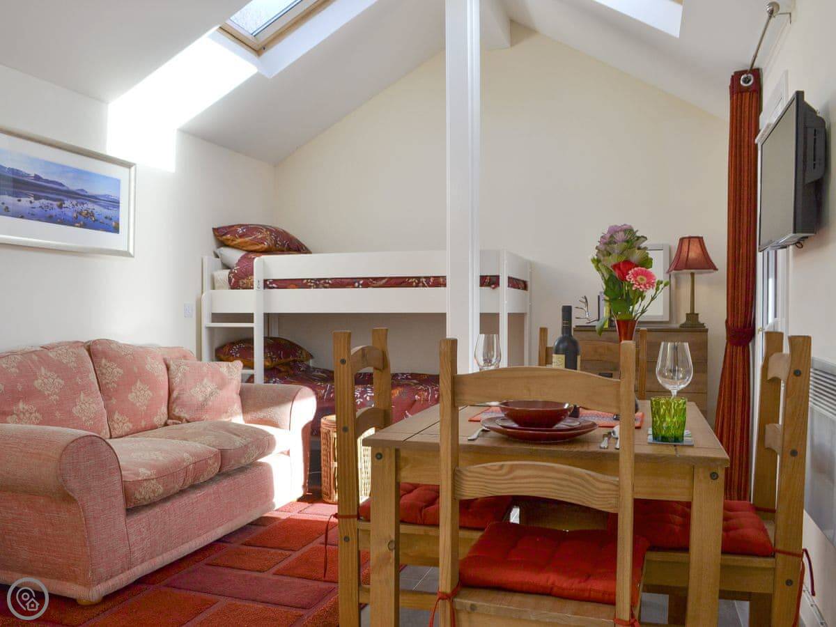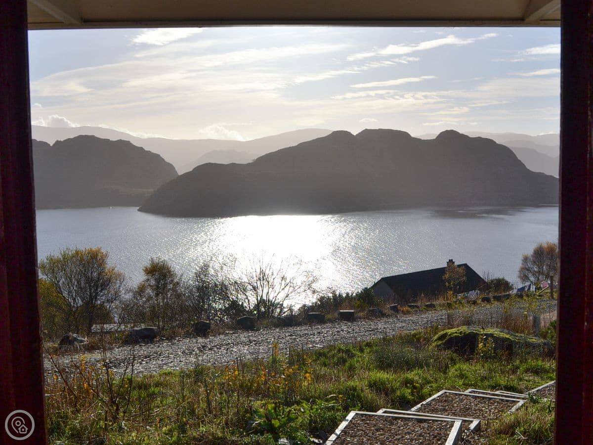 The main room has the bed, a sitting area, a small dining table and the kitchen all together. It's all on one level, which is good if stairs are a problem. The view from the big window is the main thing. It looks straight out over Diabaig Bay to the hills. You'll spend a lot of time looking at it.