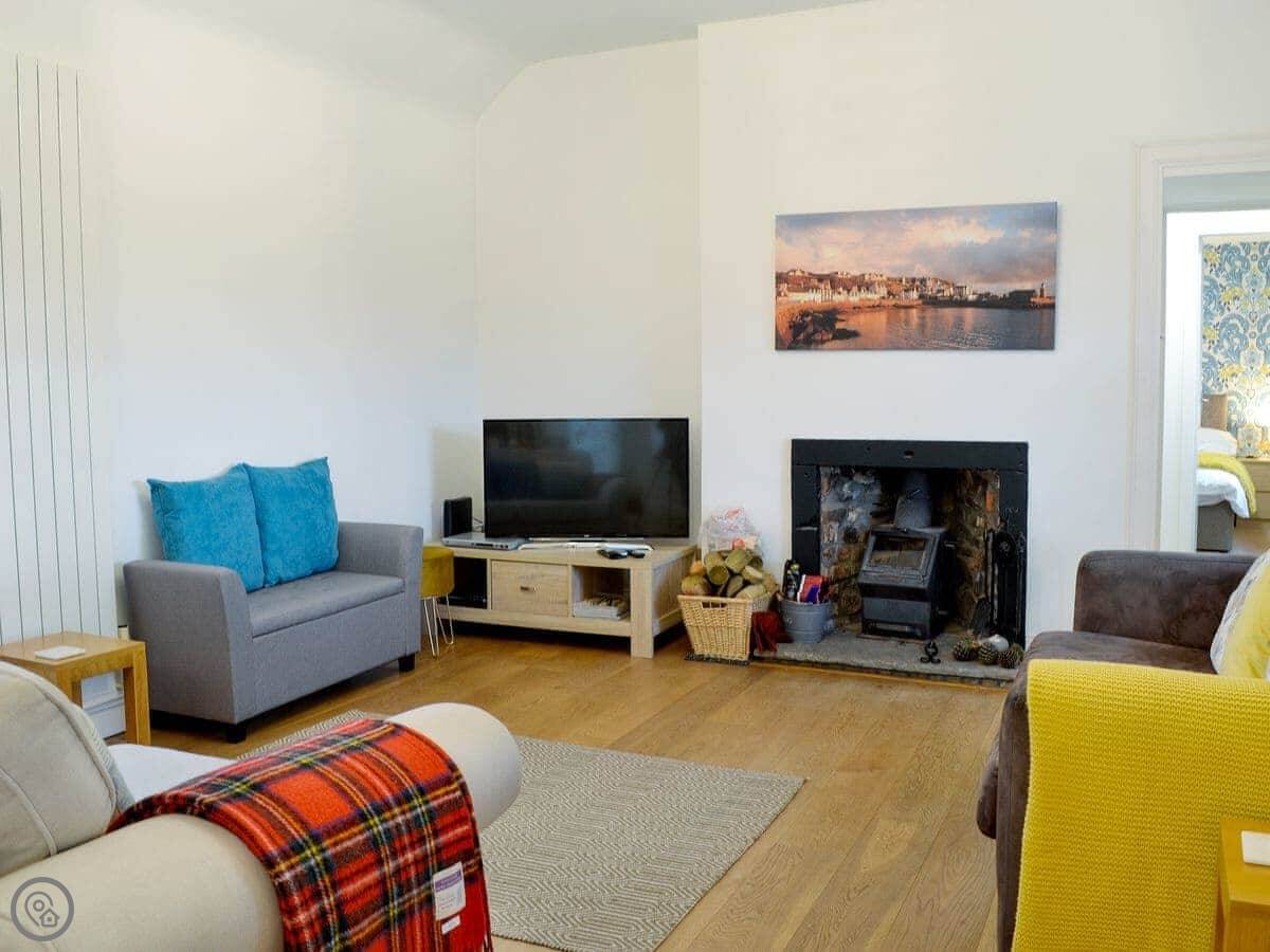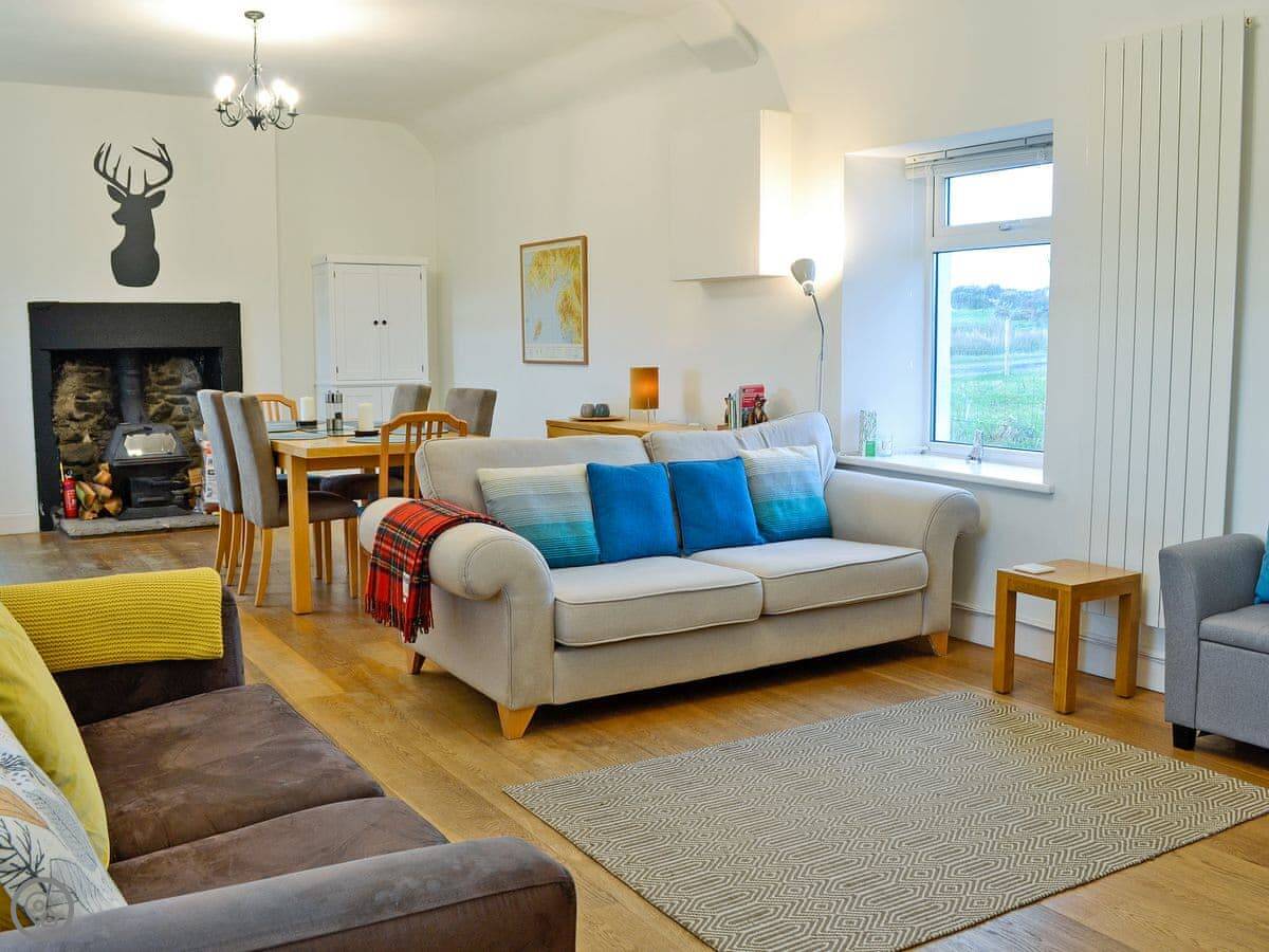 It sleeps four. Two bedrooms upstairs, one bathroom downstairs. It's got a 4 Star rating. Everything's there. It's been modernised inside. The living area is open plan and has two wood burners. It's a good space if the weather turns.