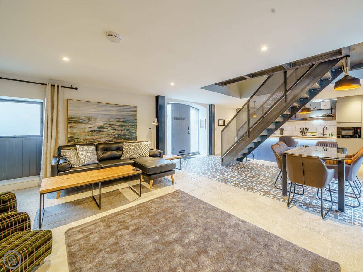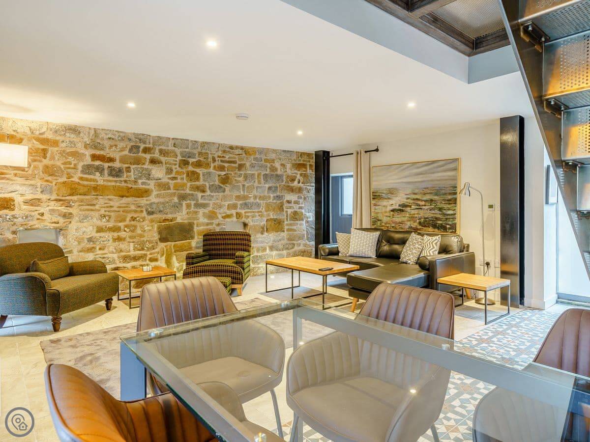Sepia Barn is a luxurious Grade II listed barn conversion which was originally built in the 1650s, showcasing beautiful views across Dentdale and beyond to Whernside, the highest of the Three Peaks. Situated on the main street in the lovely village of Dent with 1½ acres of its own private land, this characterful three-bedroom property built with traditional Yorkshire stone offers a wonderful retreat within the picturesque Yorkshire Dales National Park. It is cosy and warm with underfloor heating throughout, traditional flagstone flooring on the ground floor and solid wood floors upstairs in the bedrooms. A steel mesh staircase and landing add a contemporary twist to the traditional finishes, while wood fibre insulations, lime plaster and vegan paint allow the solid stone walls to breathe, as buildings of this age were designed to do. The open plan living/dining/kitchen area on the ground floor is spacious and stylishly furnished. Discover a well-equipped kitchen with a host of appliances. Relax in the living area which is comfortably furnished with a four-seater L-shaped sofa and two armchairs. Within the same space is the dining table seating up to six guests and tasteful floor lamps. The garden and terrace at the back of the property is fully enclosed, has an outdoor dining table and gravity chairs seating for six guests and features direct views to Rise Hill. the immediate field adjoining the terrace can very often have sheep in it and therefore the low wall and large dogs wil not be suitable in this rental. public car park directly next to the barn with two electric charging points