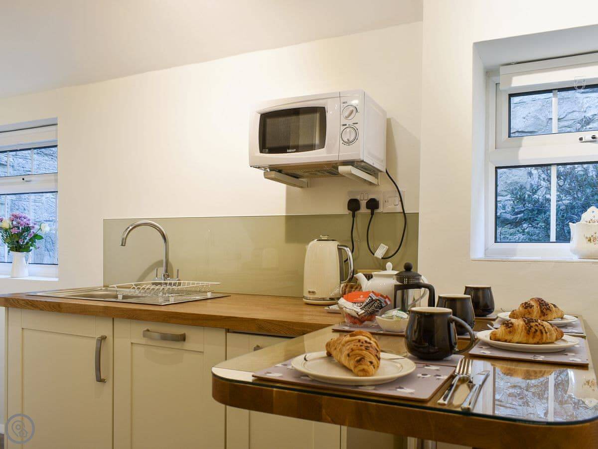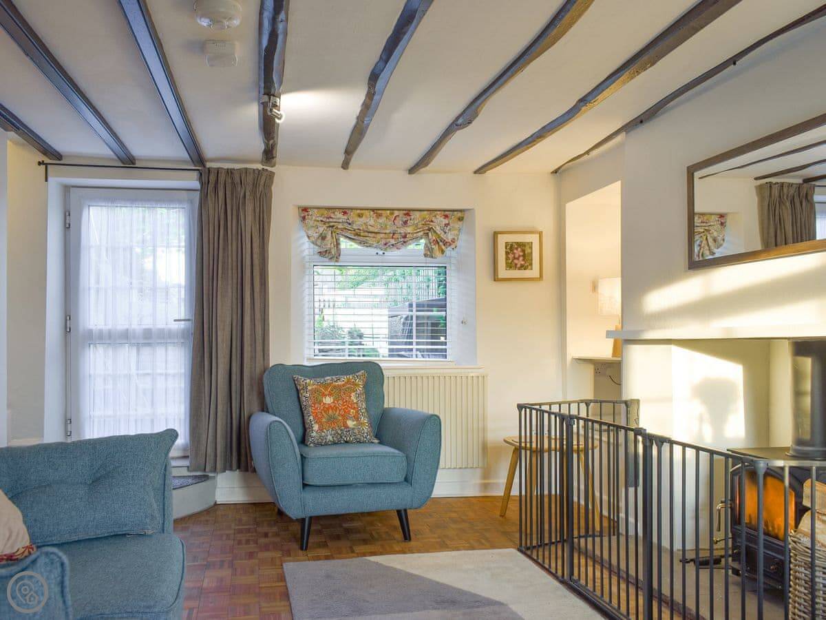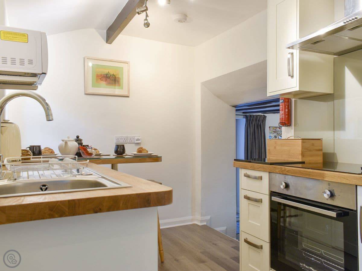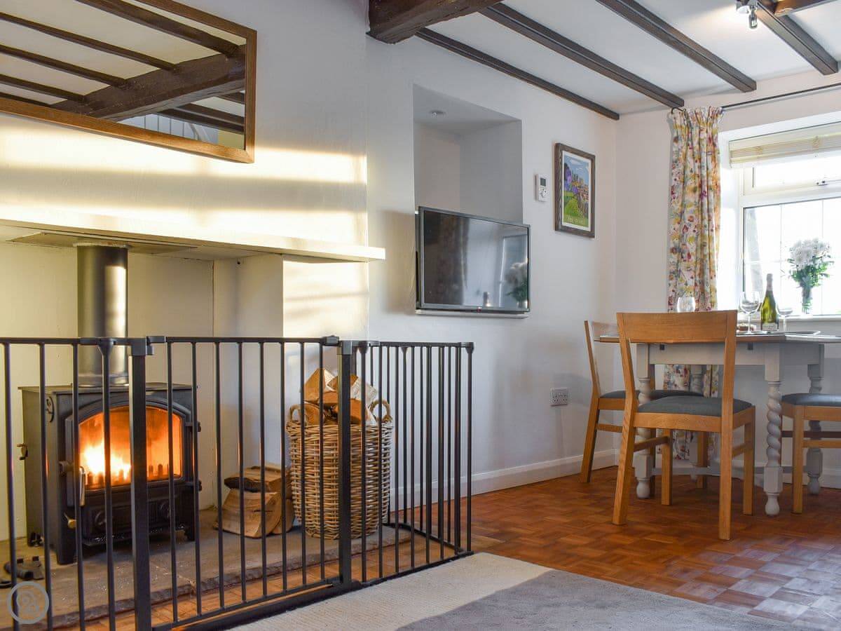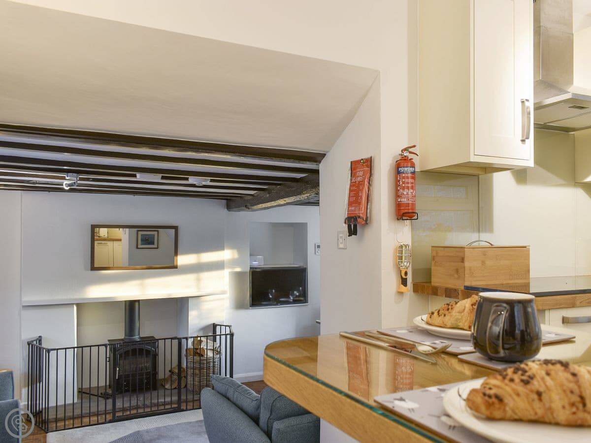There’s an open plan living room with a wood burner. The kitchen has a breakfast bar. One bathroom with a walk-in shower.