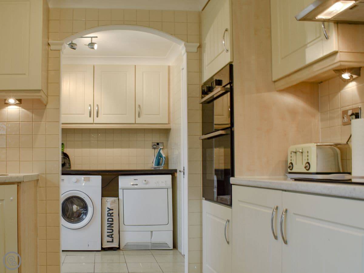 The living area is open-plan. There's a kitchen with a breakfast bar, and a utility room with the washing machine. The furniture is good. The bedding is hotel quality. Outside, there's a big deck with seating and a summer house.