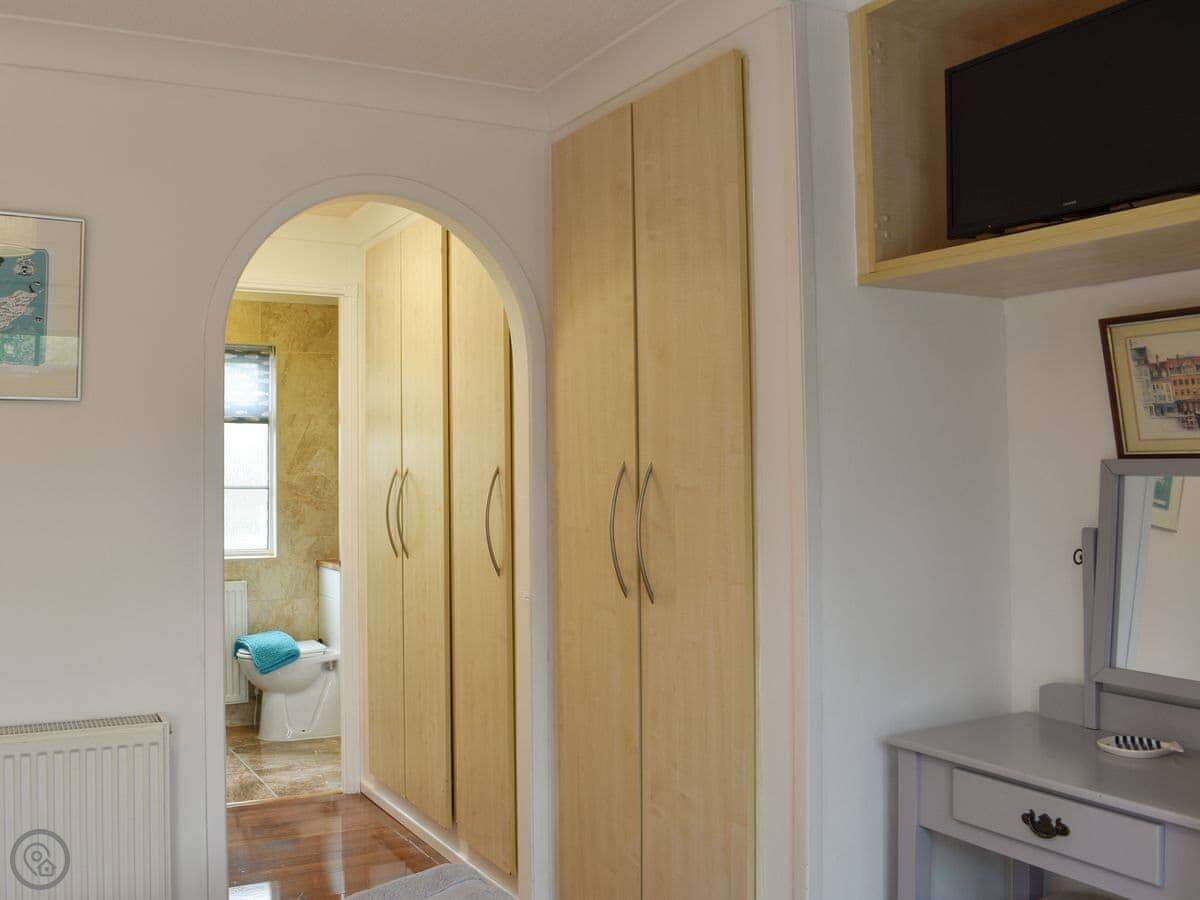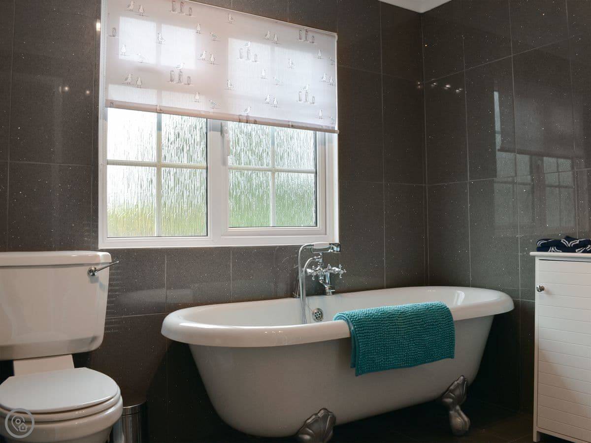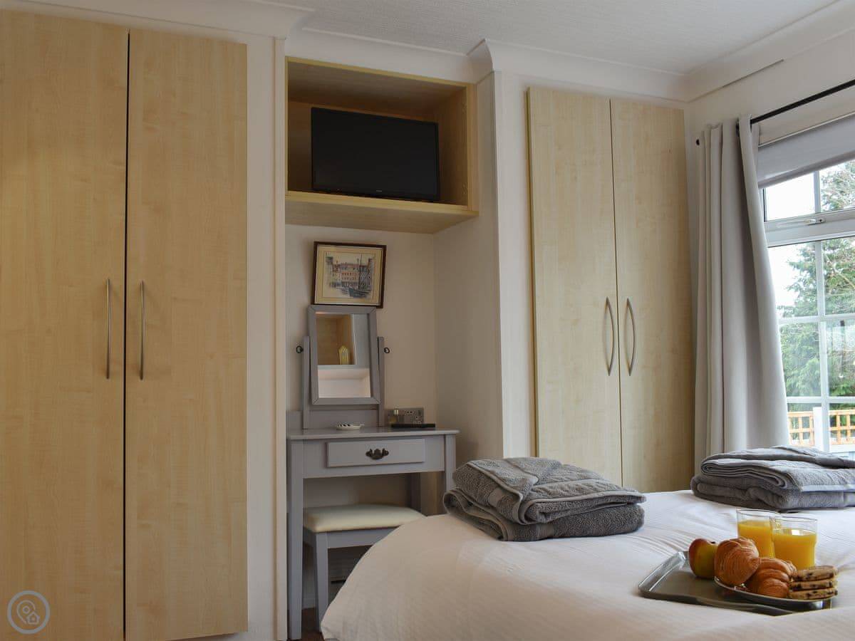 The lodge sleeps five. There are three bedrooms and two bathrooms. One bedroom has an en-suite shower. The main bathroom has a roll-top bath. The rating is 4 Star, so it's comfortable and well-equipped. It's all on one level, so there are no steps inside.