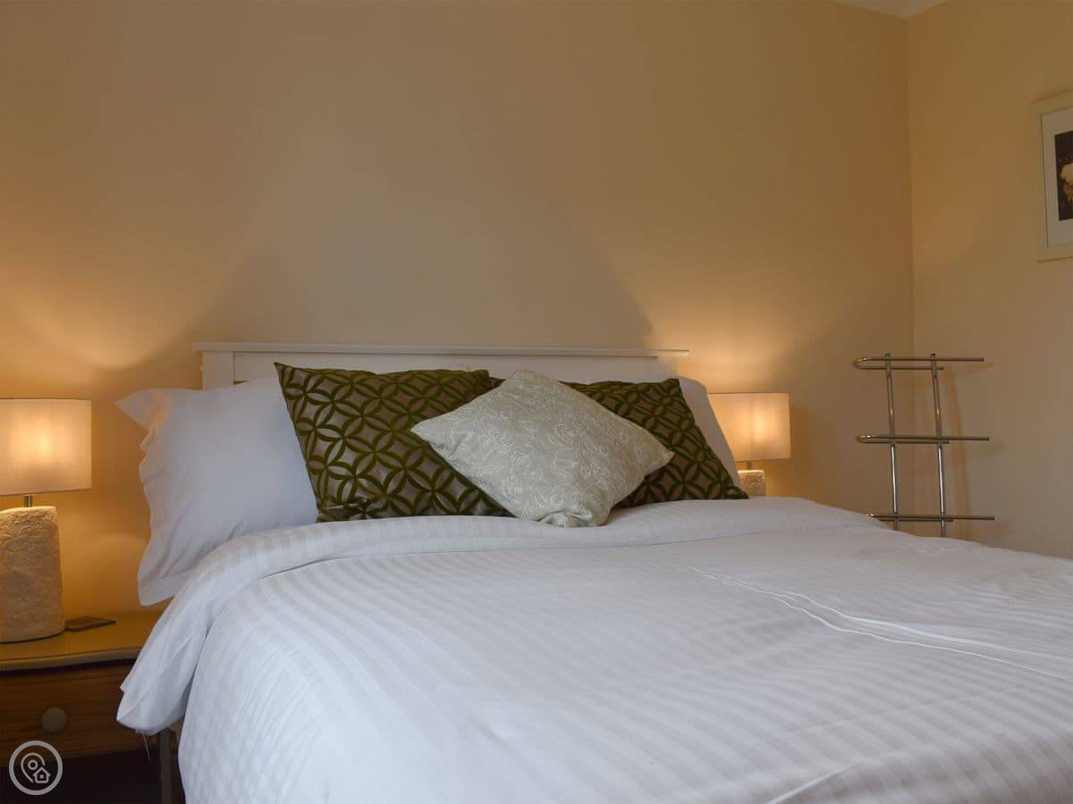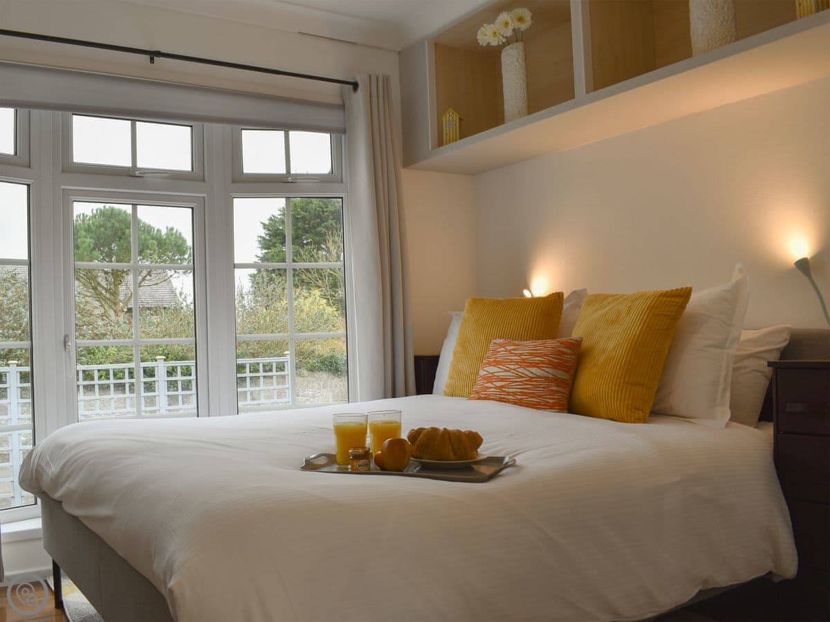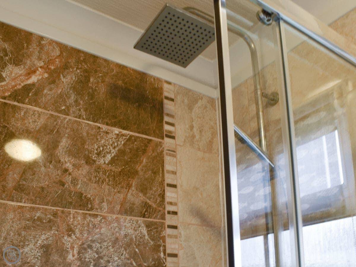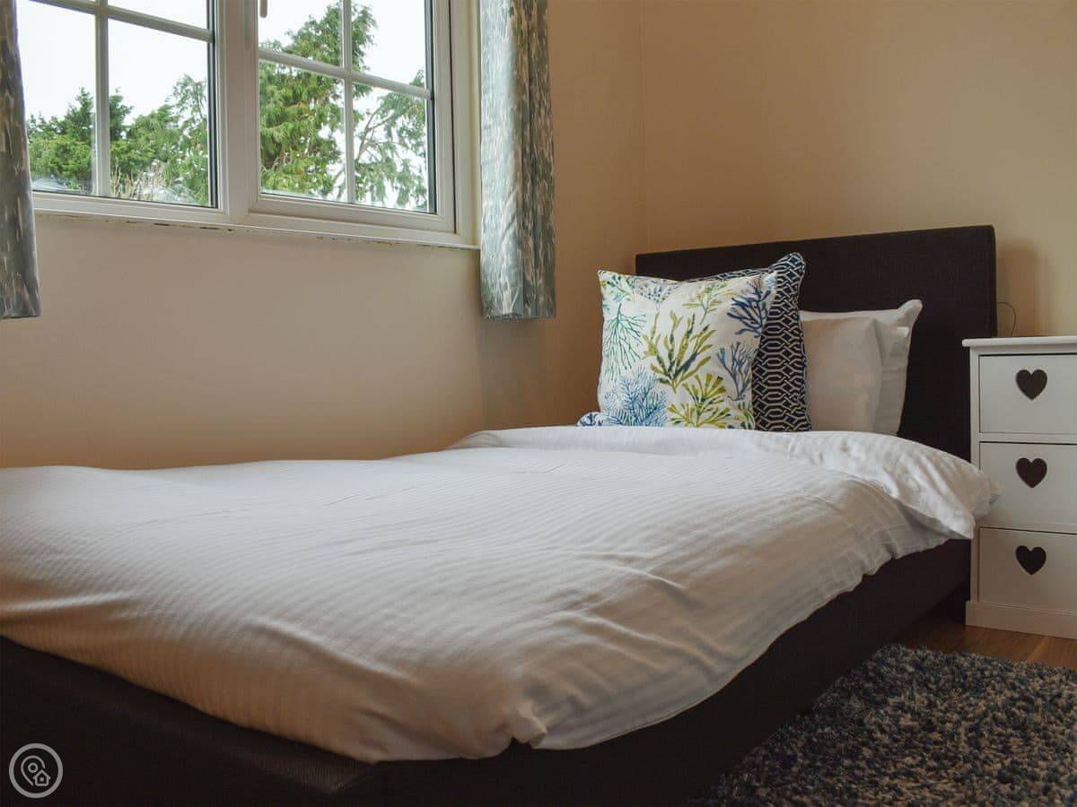 The lodge sleeps five. There are three bedrooms and two bathrooms. One bedroom has an en-suite shower. The main bathroom has a roll-top bath. The rating is 4 Star, so it's comfortable and well-equipped. It's all on one level, so there are no steps inside.