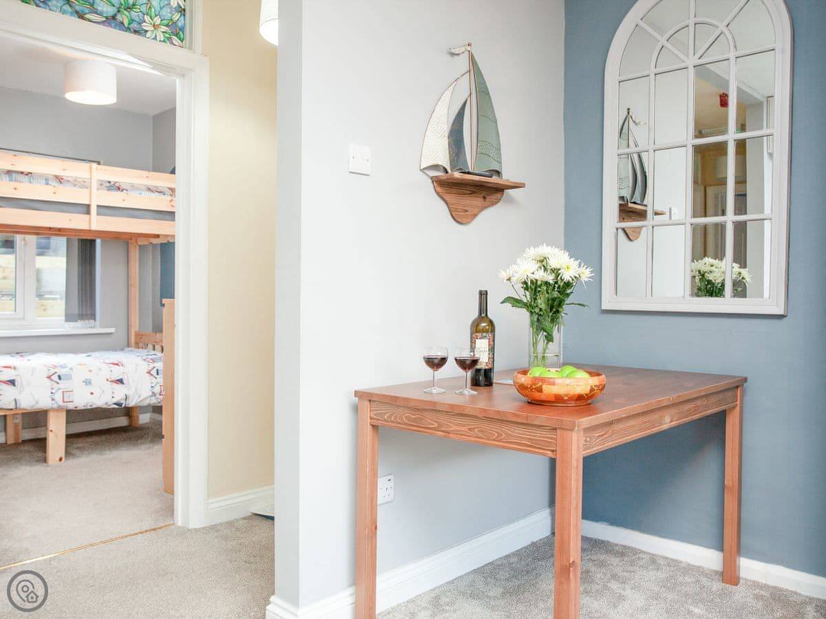 Admirals Apartment has three bedrooms, one with children’s bunk beds. It has a fully fitted kitchen/dining room with seating for 8. Captains Quarters is a gorgeous spacious one bedroom apartment with en-suite and a sofa bed in the living room. Commanders Cabin is a one bedroomed apartment with double bed, double sofa bed and en-suite. Boson Bunks is a one bedroomed property with a double sofa bed in the snug area and a separate shower room.
