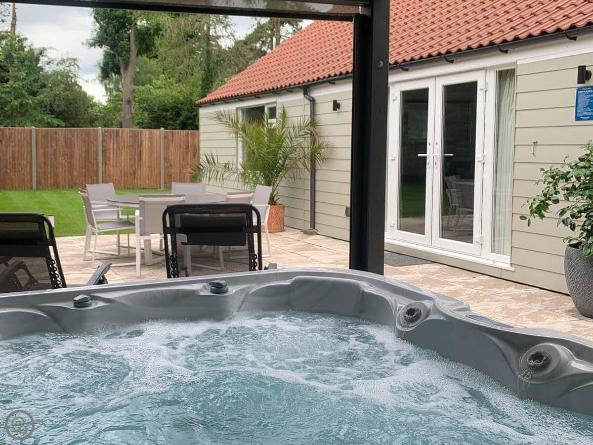 Outside, the garden goes round the sides. There's a patio with furniture and a BBQ. The hot tub is under a cover. There's a kennel out there too, as we take two dogs.