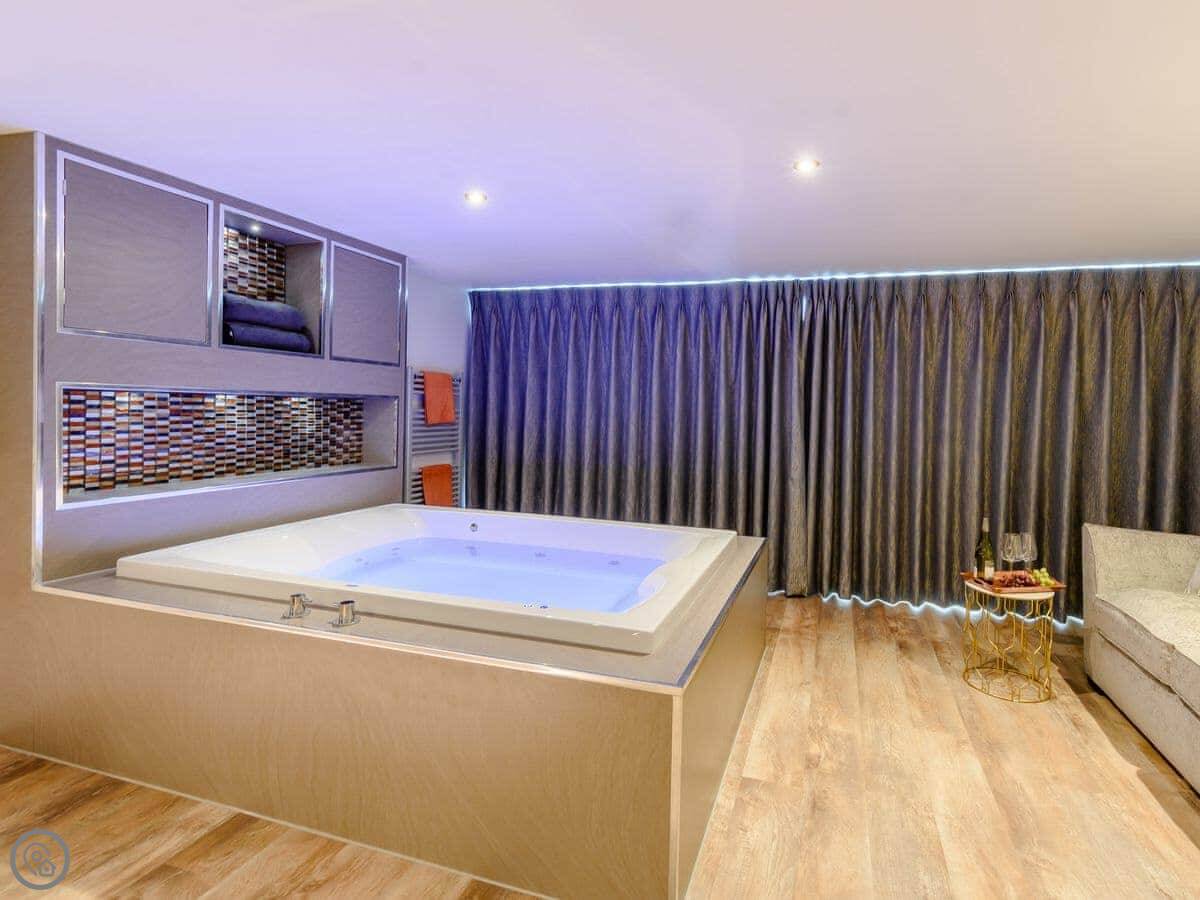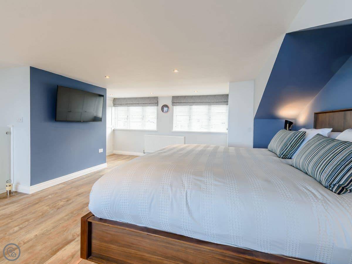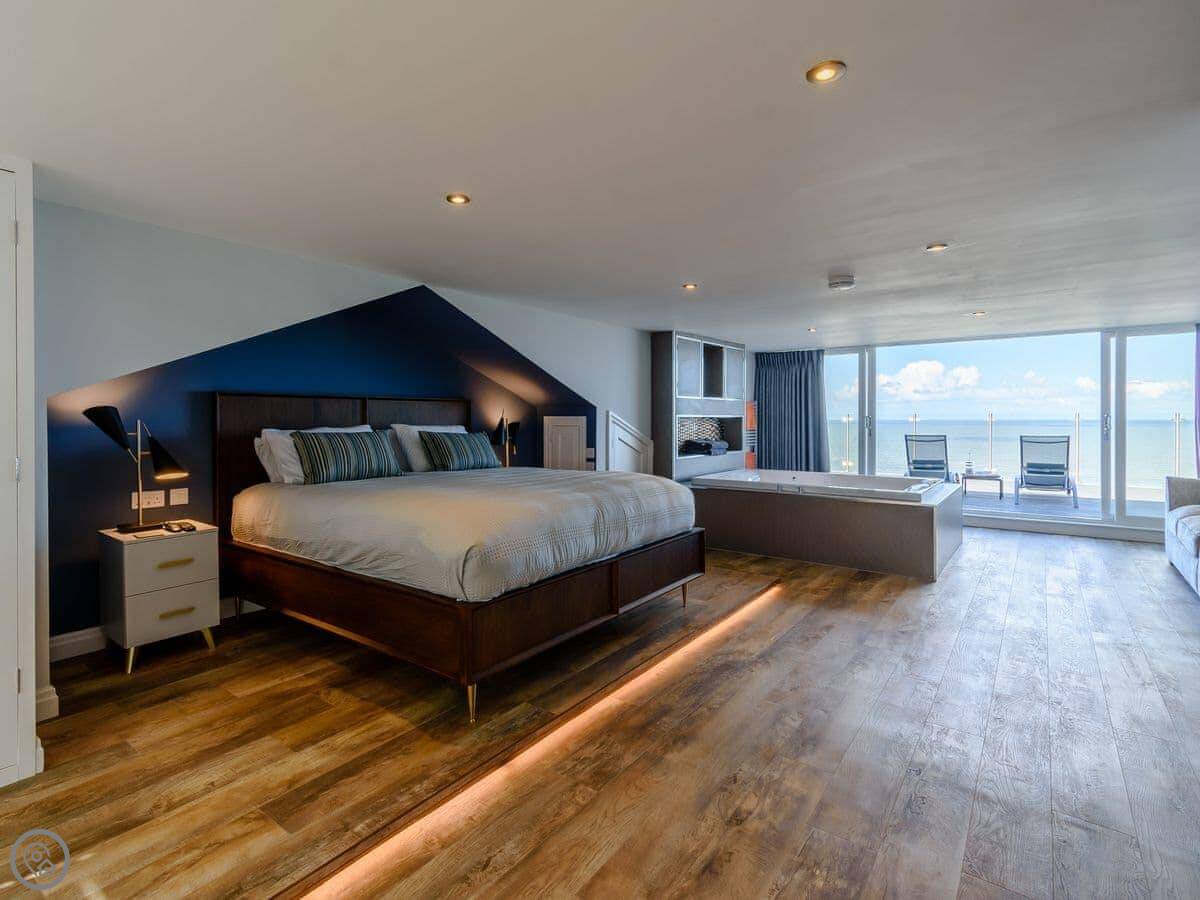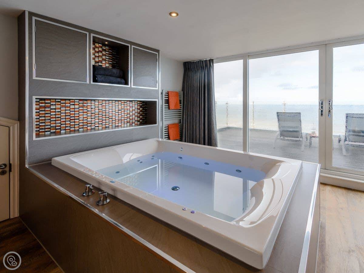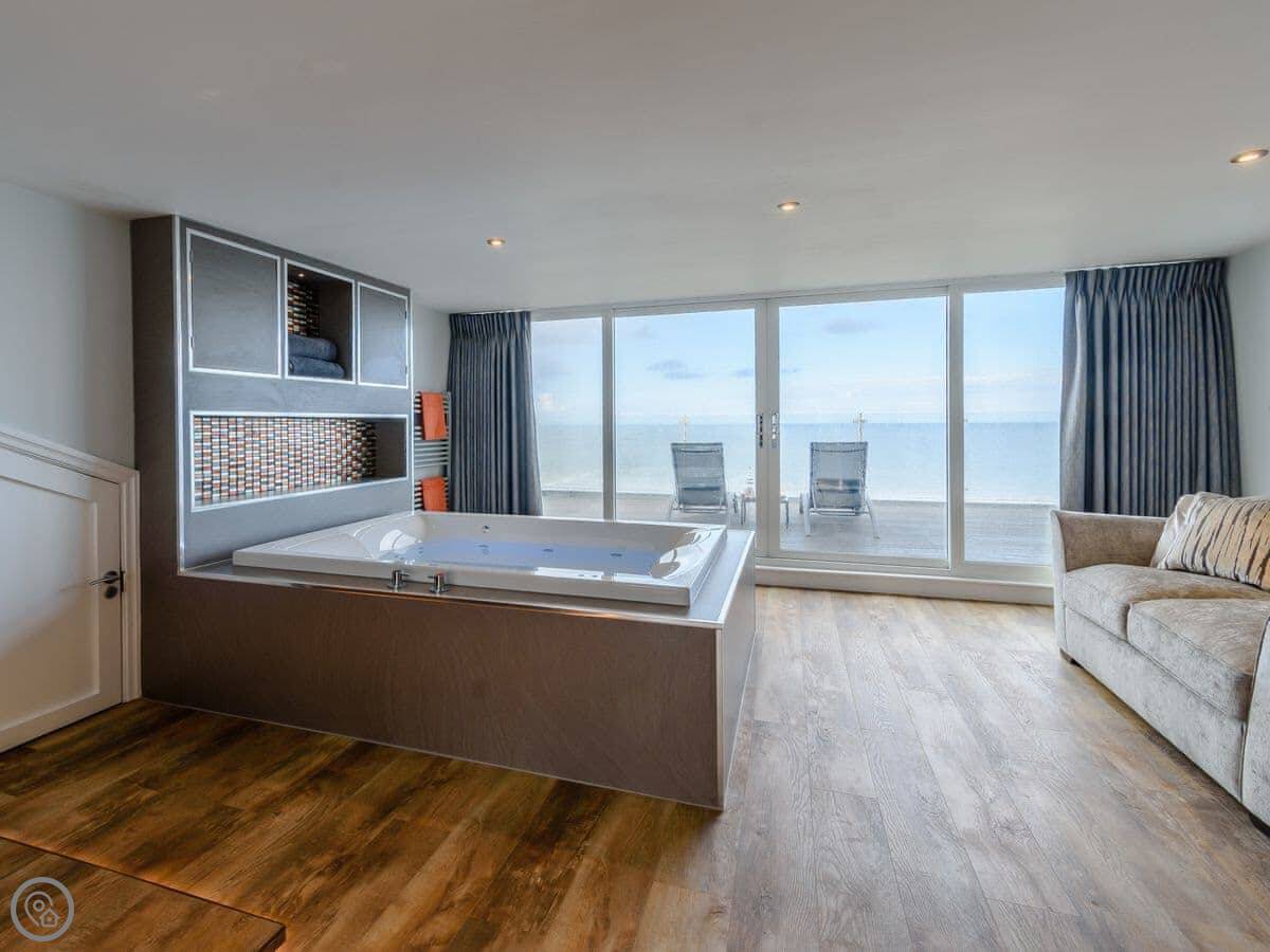 There are three bedrooms on the ground floor: two twins and a double with an en-suite shower. There’s also a main bathroom on that floor. Upstairs is the master bedroom. It has a super kingsize bed and a spa bath facing the sea. There’s a double sofa bed in there too, which can be made up if needed. It opens onto a private balcony.