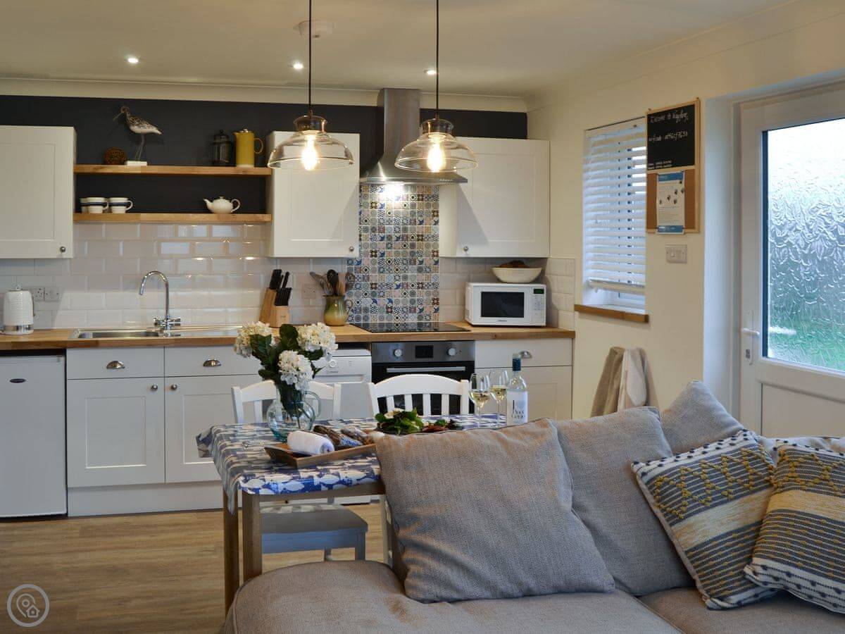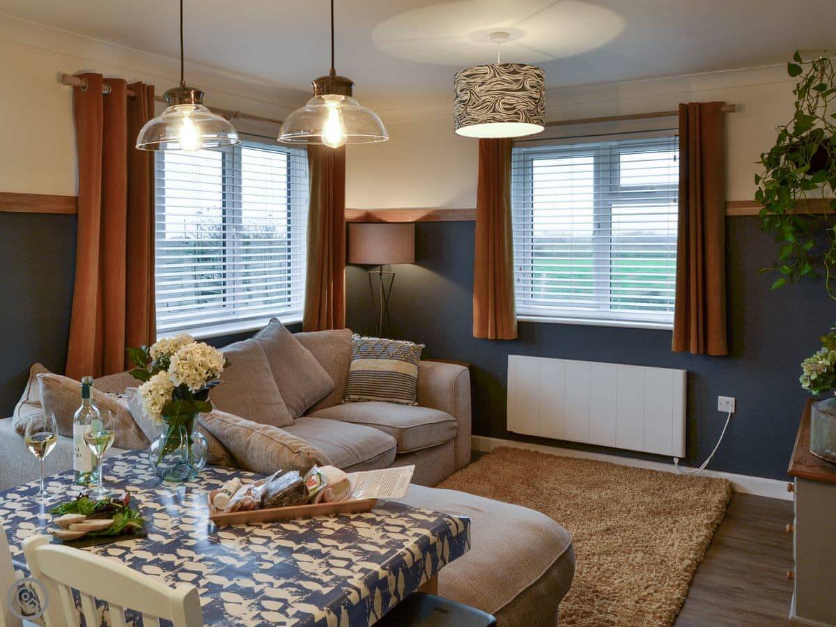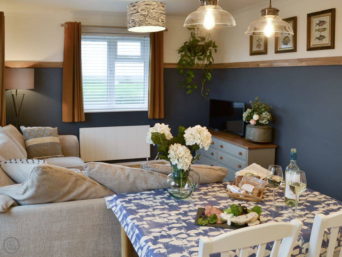 There's an open plan living area. The patio looks out over fields, not the sea. You get a good view of the countryside.