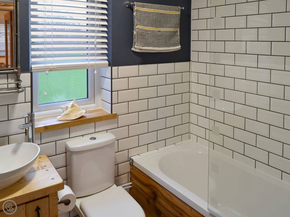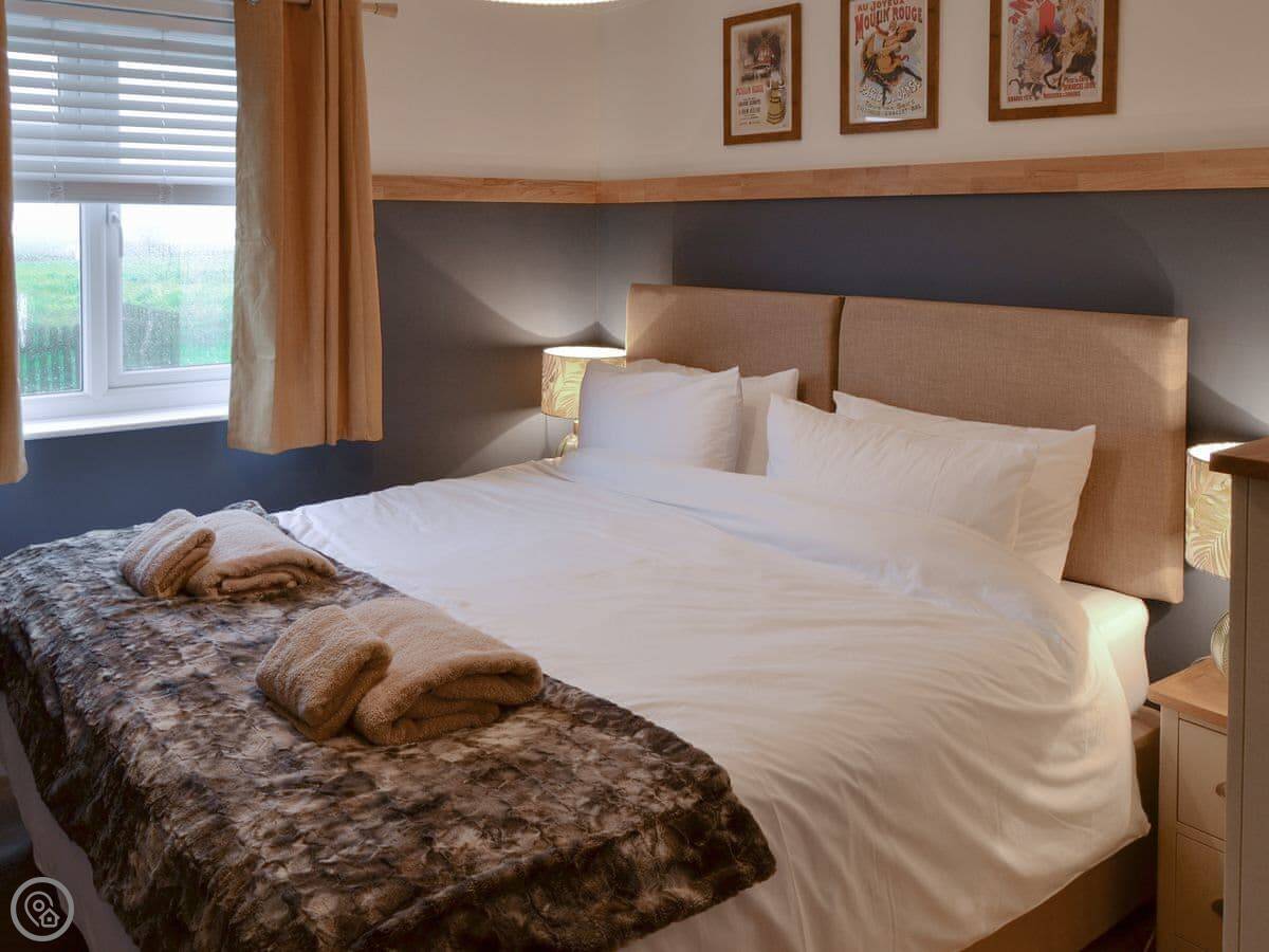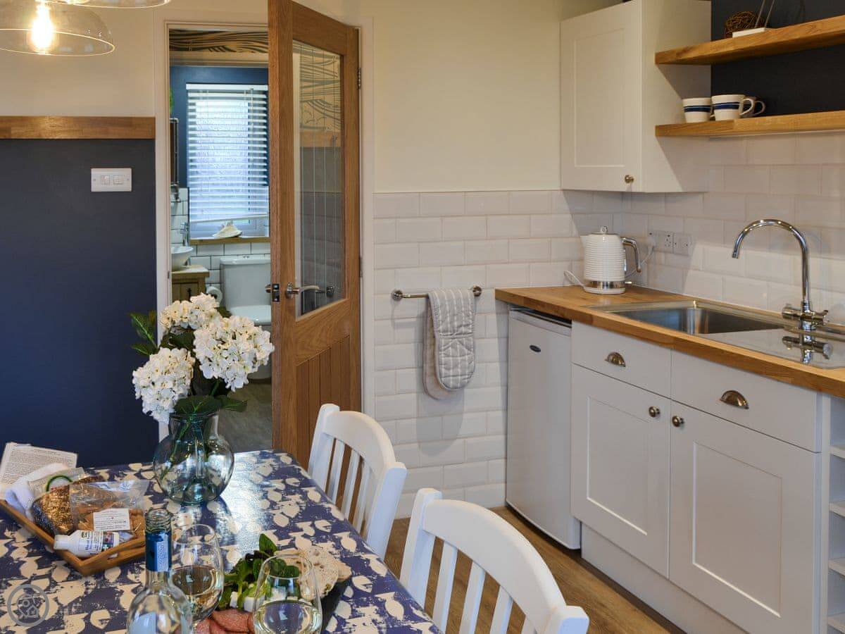 There's an open plan living area. The patio looks out over fields, not the sea. You get a good view of the countryside.