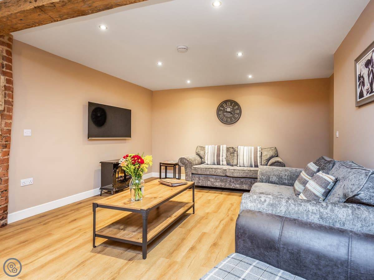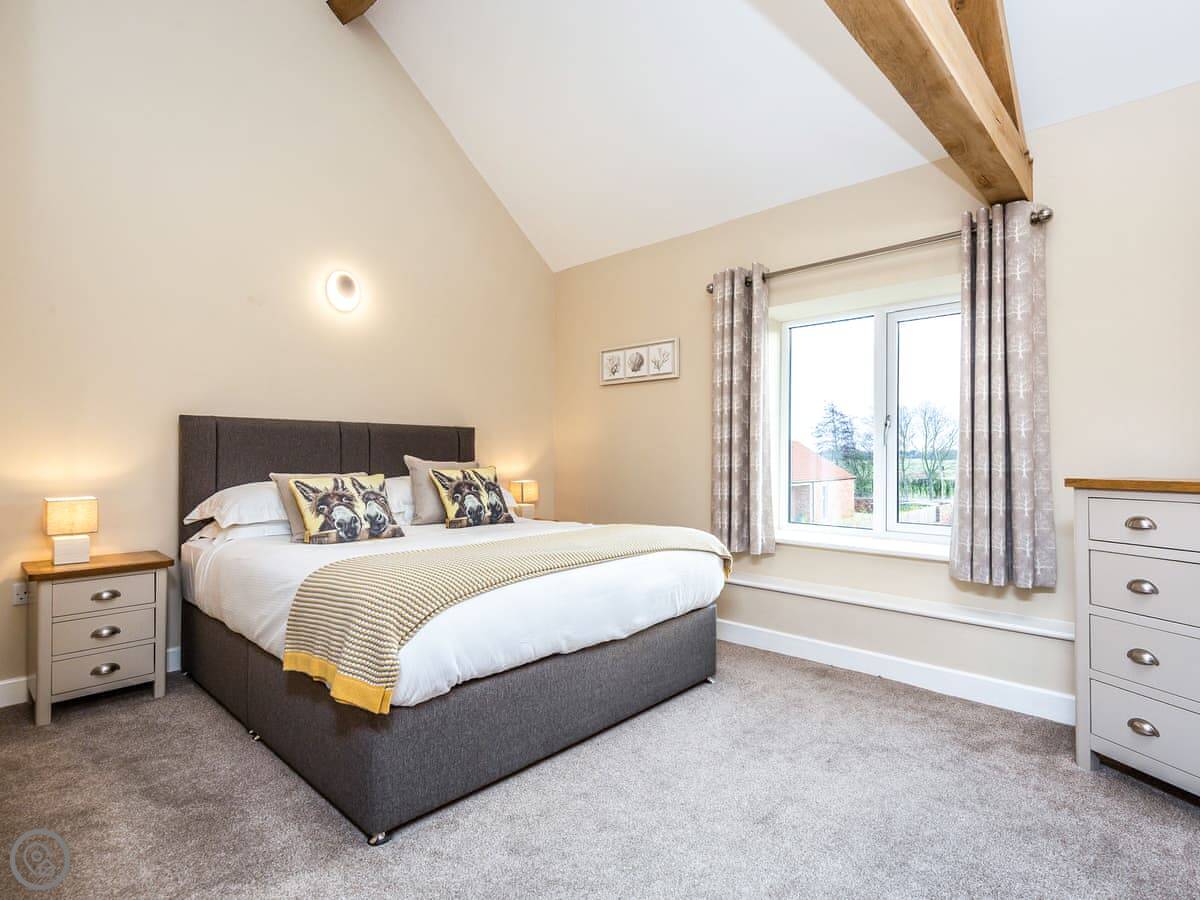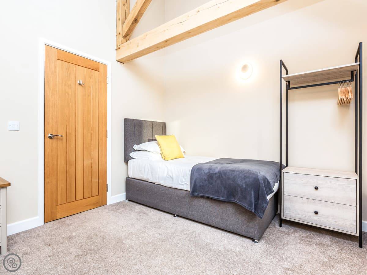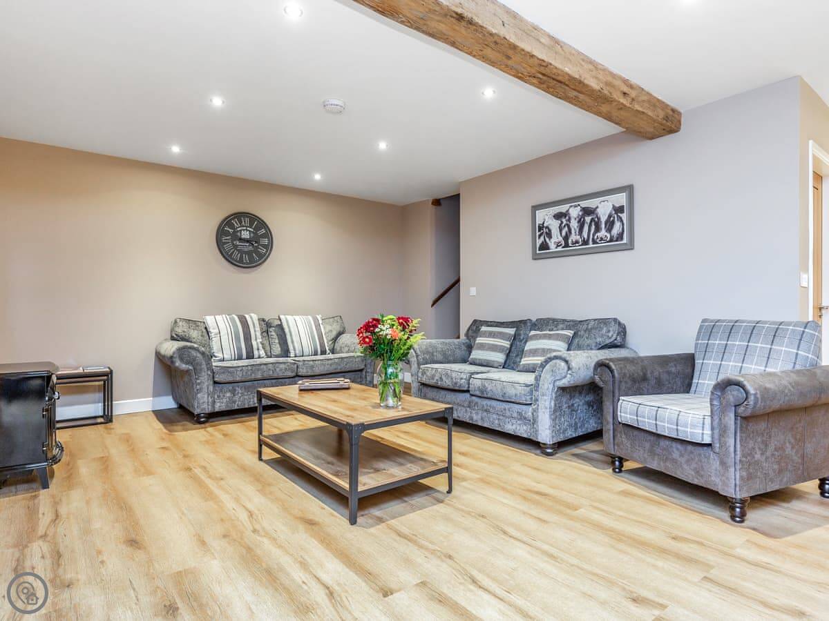 It sleeps six. Three bedrooms, each with its own bathroom, which is handy. It's got a 5 Star rating, so it's well-equipped and comfortable. The conversion kept some of the original barn features, like the beams.