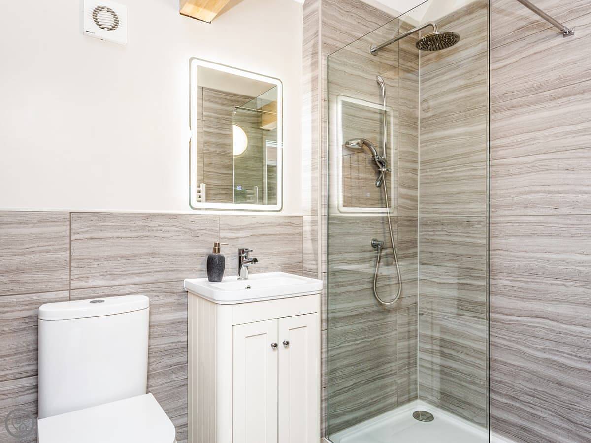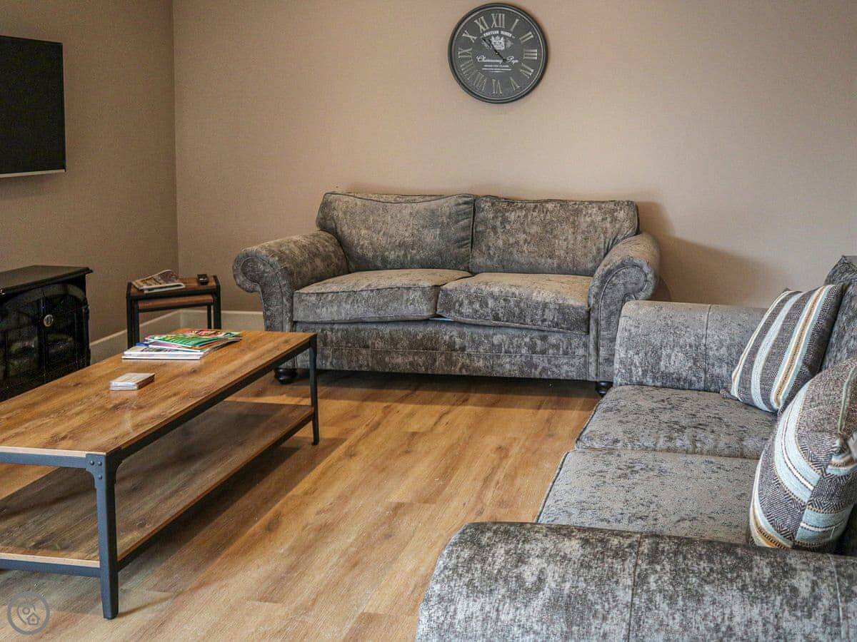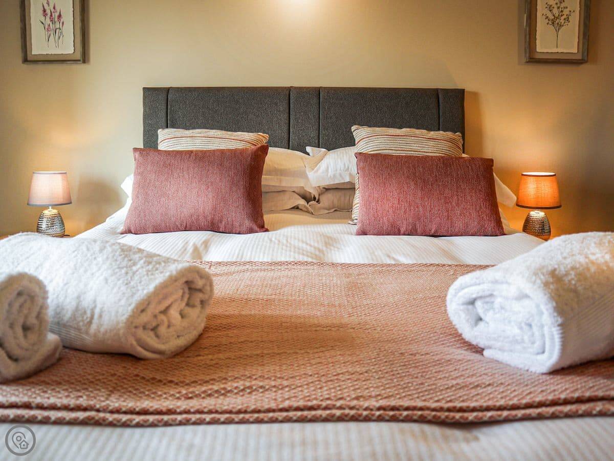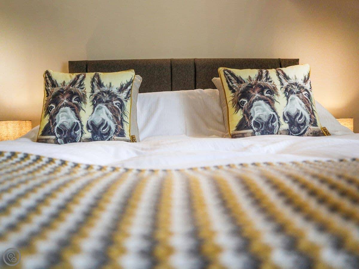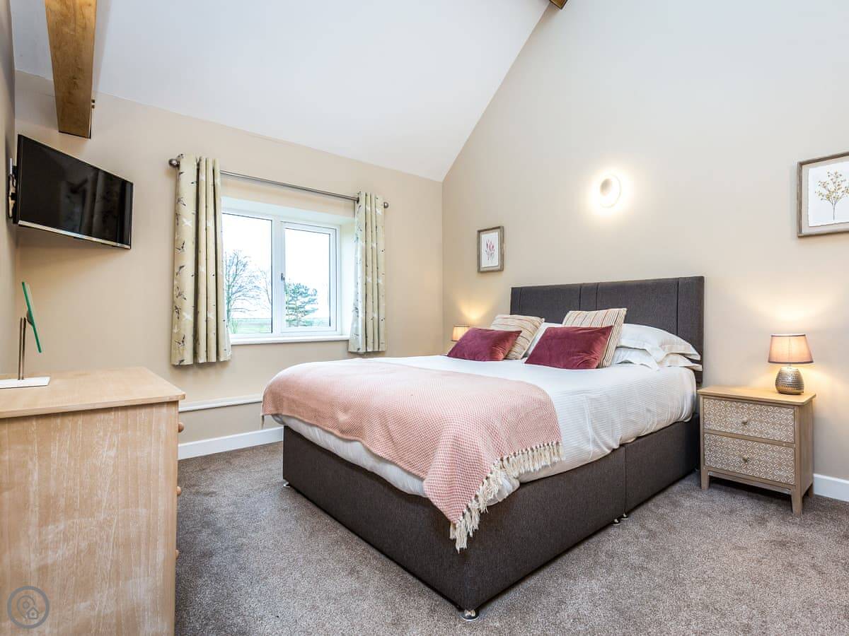 It sleeps six. Three bedrooms, each with its own bathroom, which is handy. It's got a 5 Star rating, so it's well-equipped and comfortable. The conversion kept some of the original barn features, like the beams.