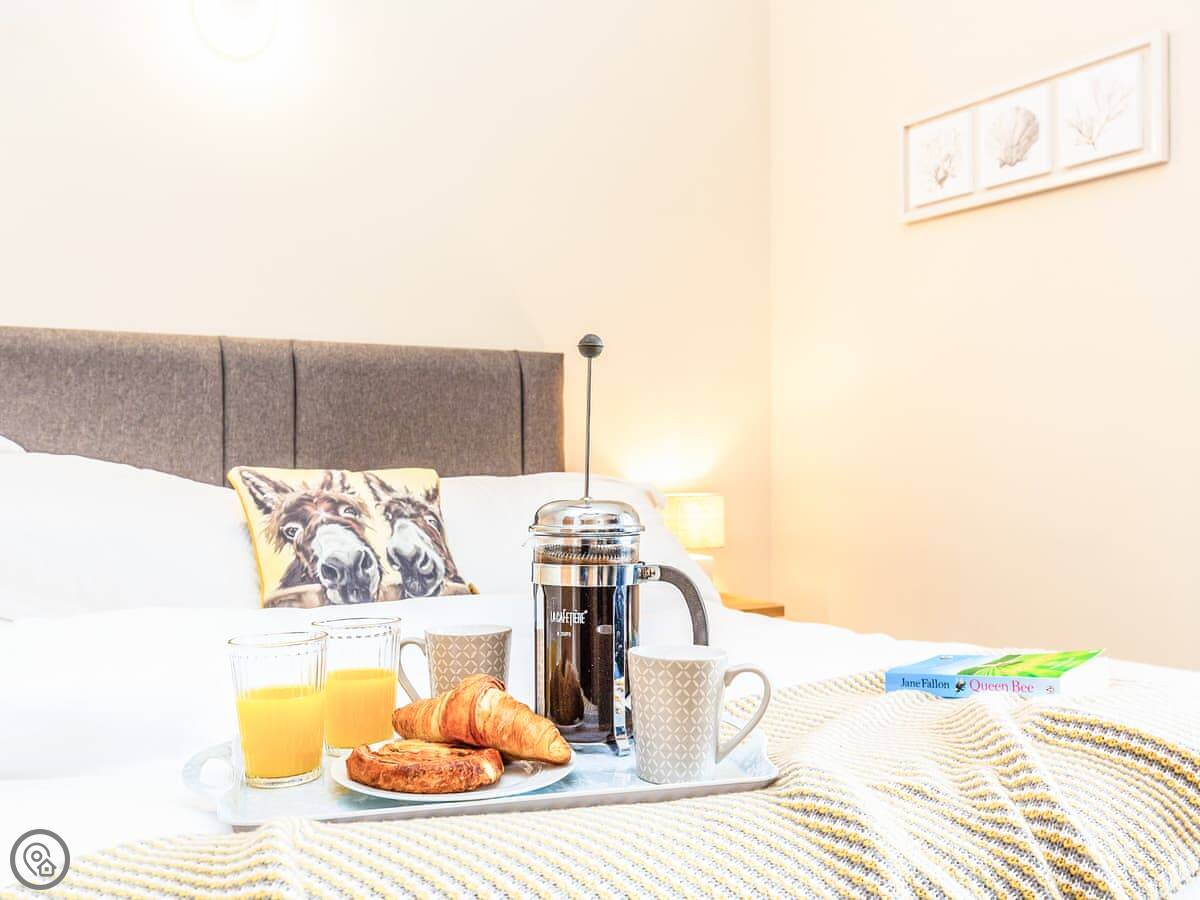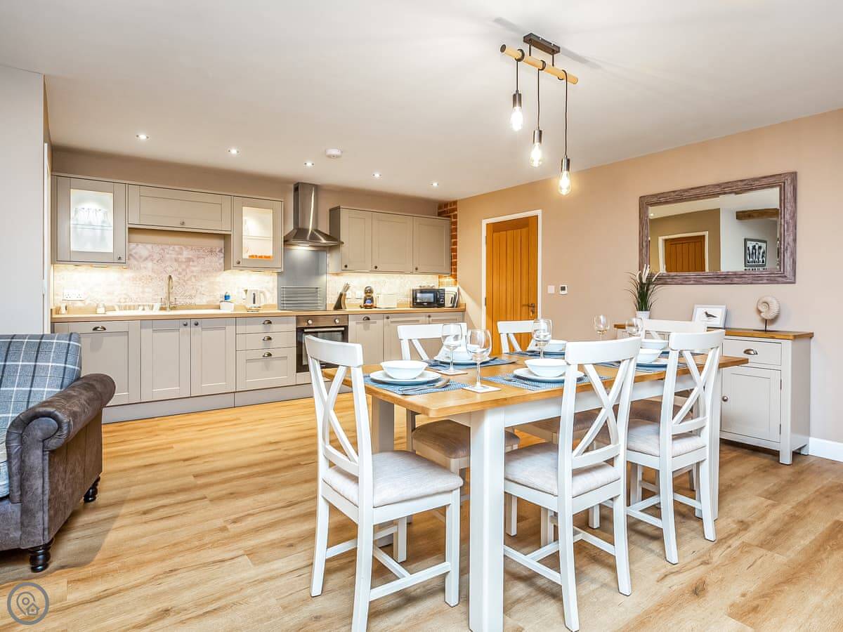 Inside, it's open plan. There's a dishwasher, washing machine, TV, and WiFi. Bedding and towels are included. We can provide a cot and highchair. You can bring one well-behaved dog.