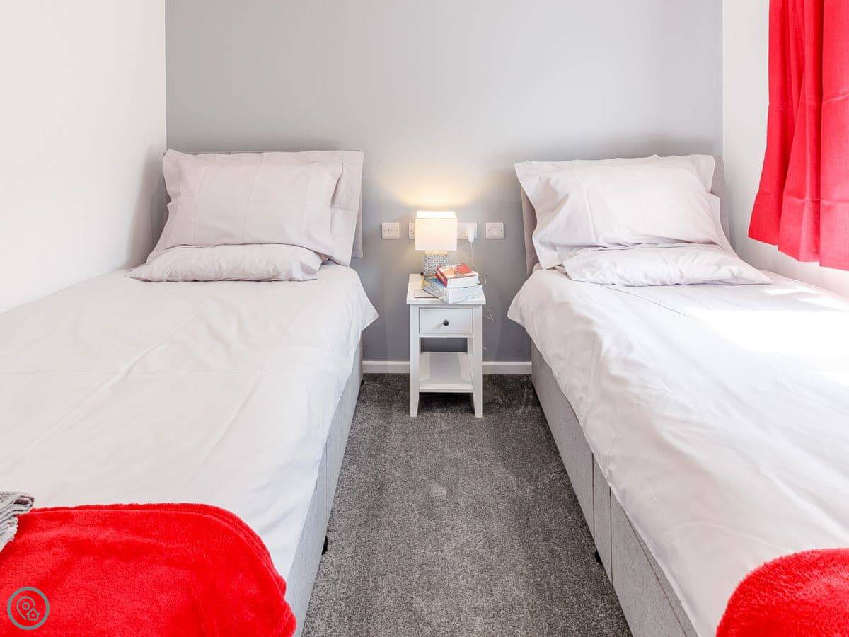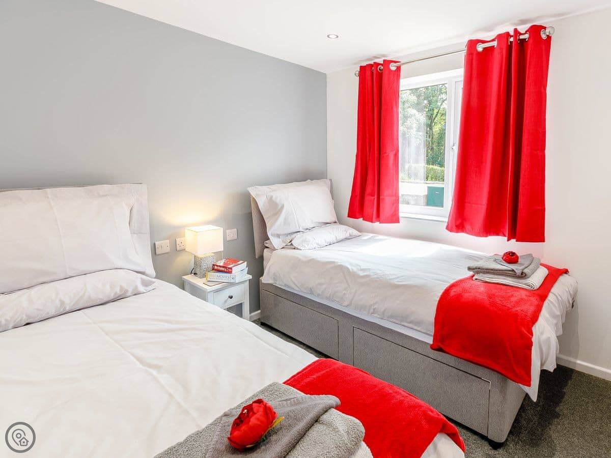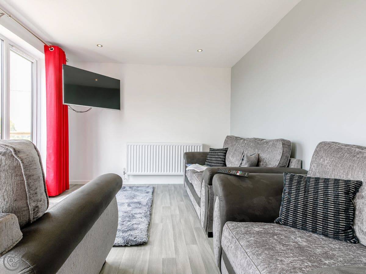 The lodge sleeps four. Two bedrooms, one bathroom. Everything's on the ground floor, which is good if steps are a problem. It's got a 4 Star rating. It's comfortable and clean.