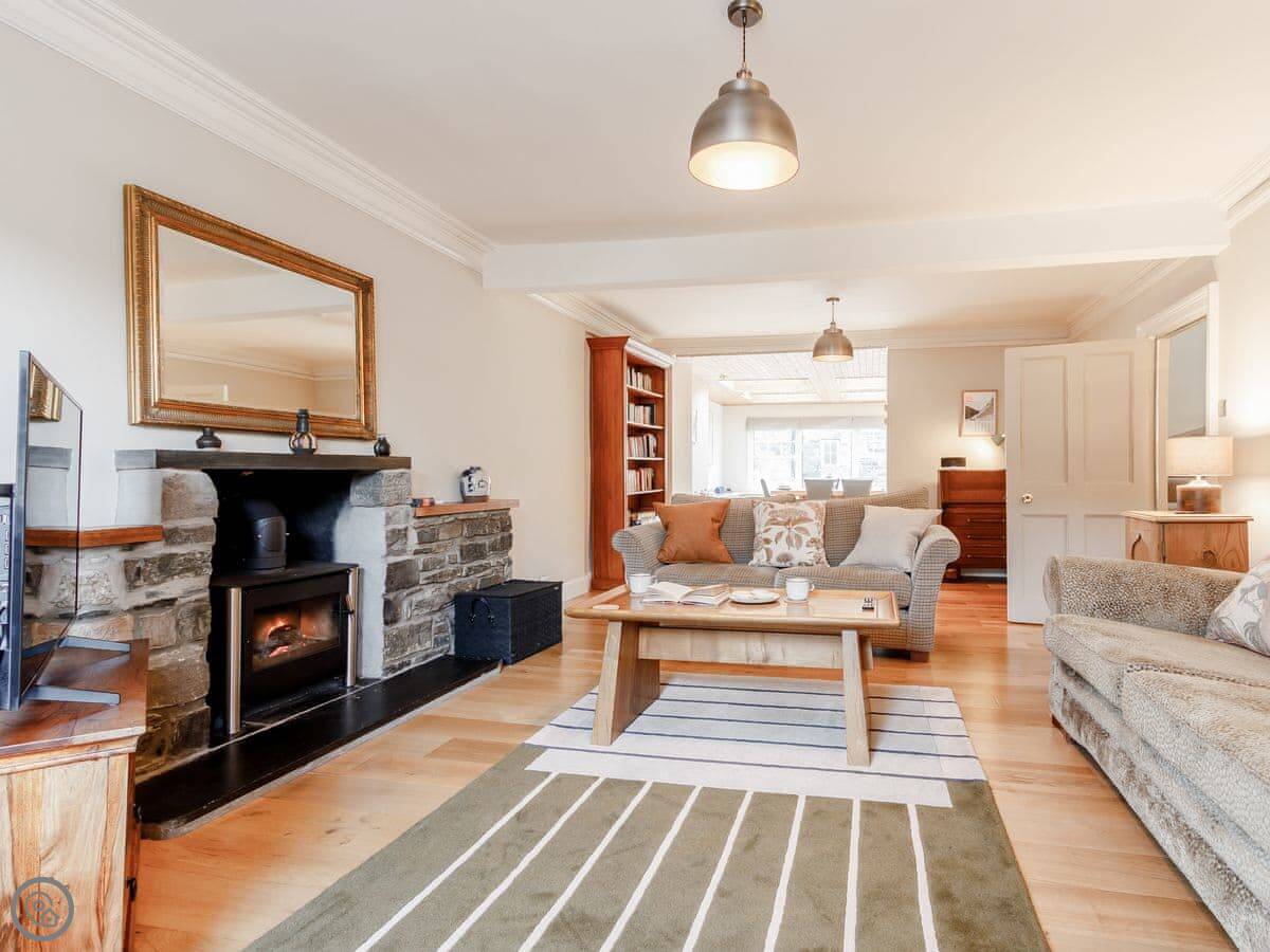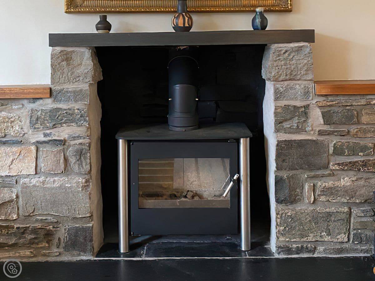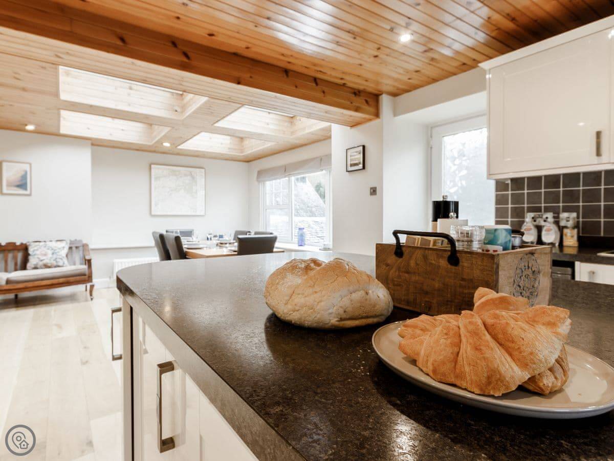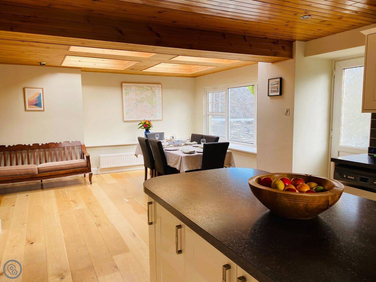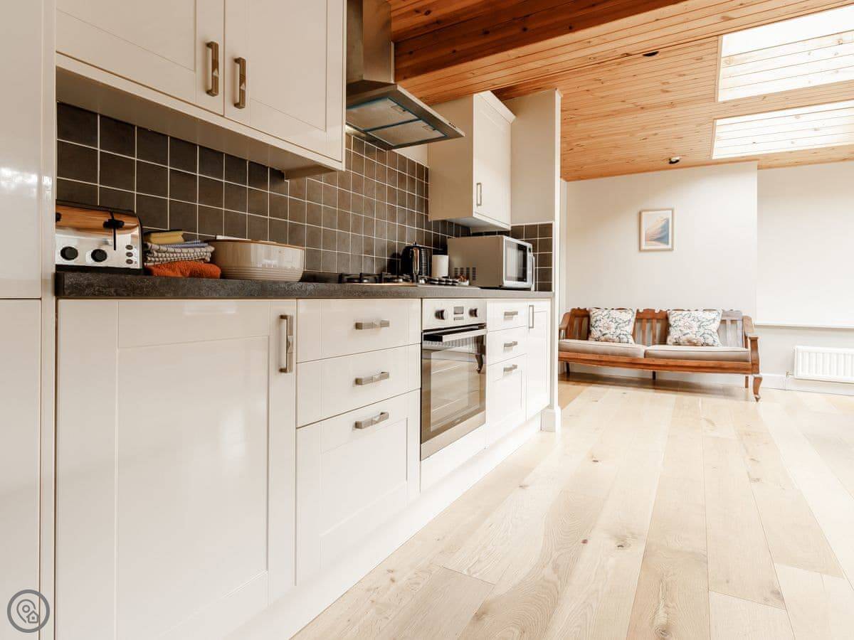 It sleeps six. Three bedrooms, two bathrooms. It’s got a 4 Star rating, so it’s comfortable and well looked after. The living space is all open plan, which is good if you’re all in together. There’s a woodburning stove for cooler evenings.