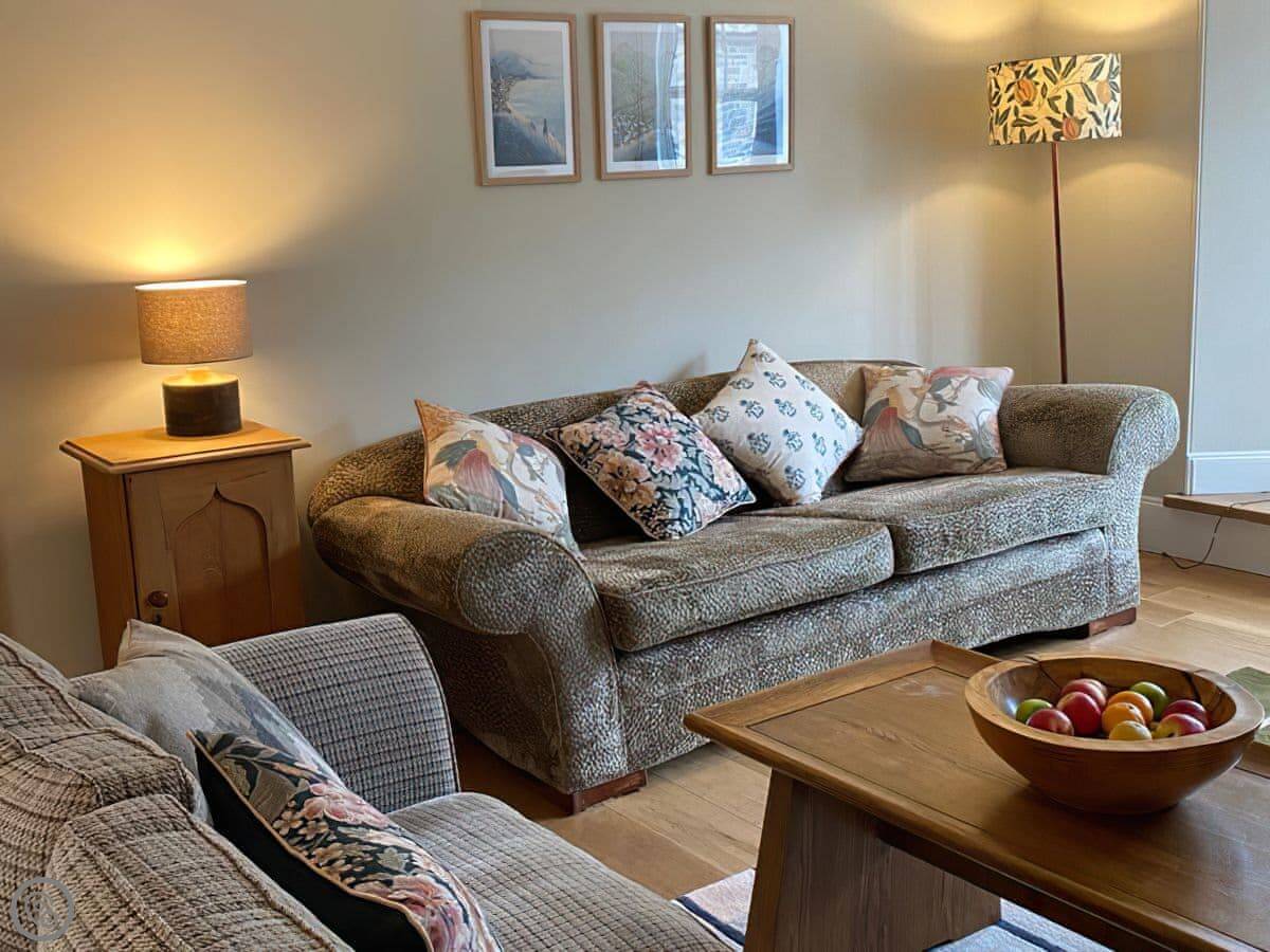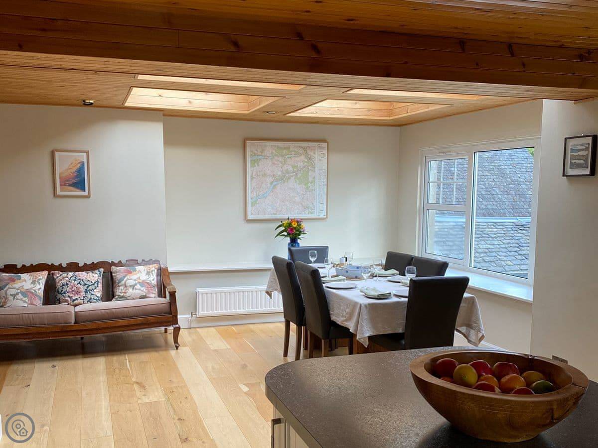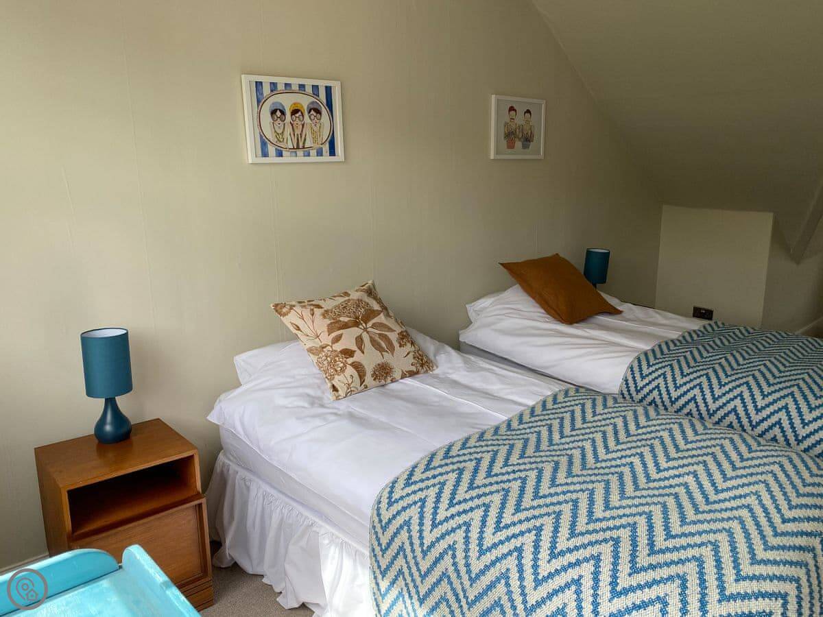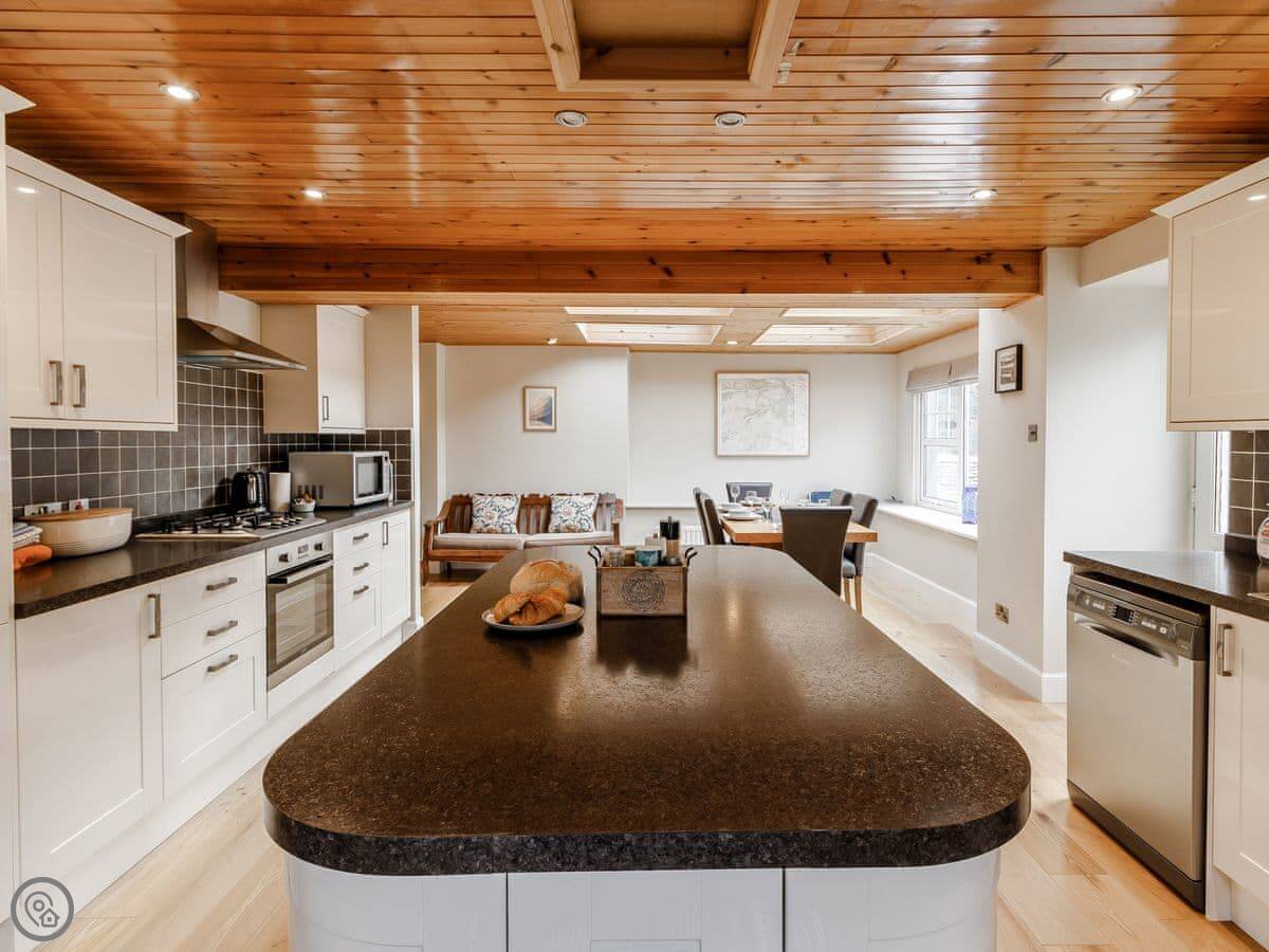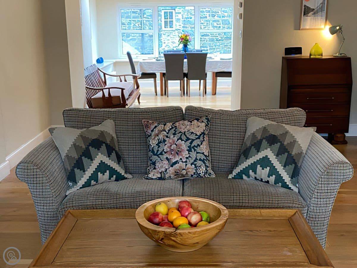 It sleeps six. Three bedrooms, two bathrooms. It’s got a 4 Star rating, so it’s comfortable and well looked after. The living space is all open plan, which is good if you’re all in together. There’s a woodburning stove for cooler evenings.