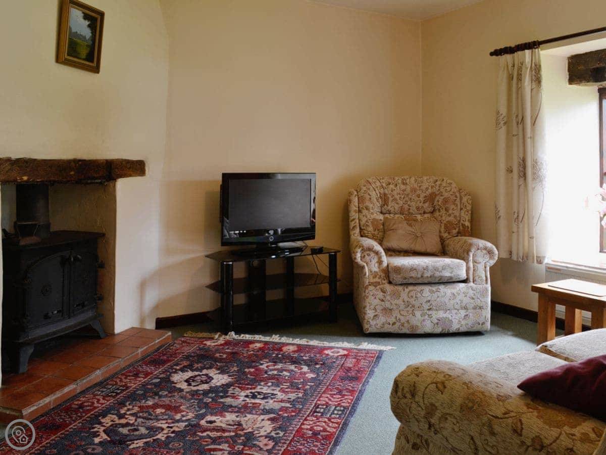 This is Honeysuckle Cottage. It's one of two converted stone barns on our farm here in Pathfinder Village. The farm is 65 acres, so you get fields and woodland around you. We keep some sheep and cattle.