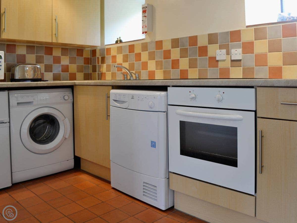 Inside, you've got a washing machine, a TV, and bedding and towels are included. There's parking right outside.