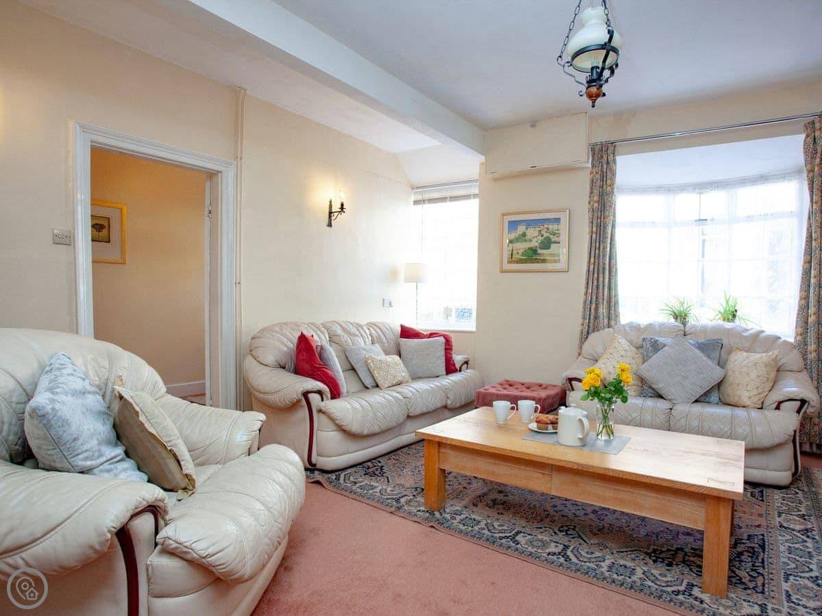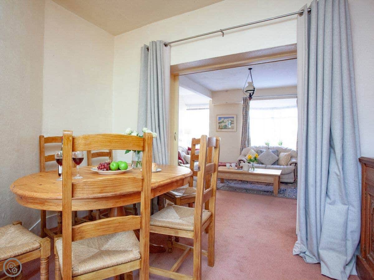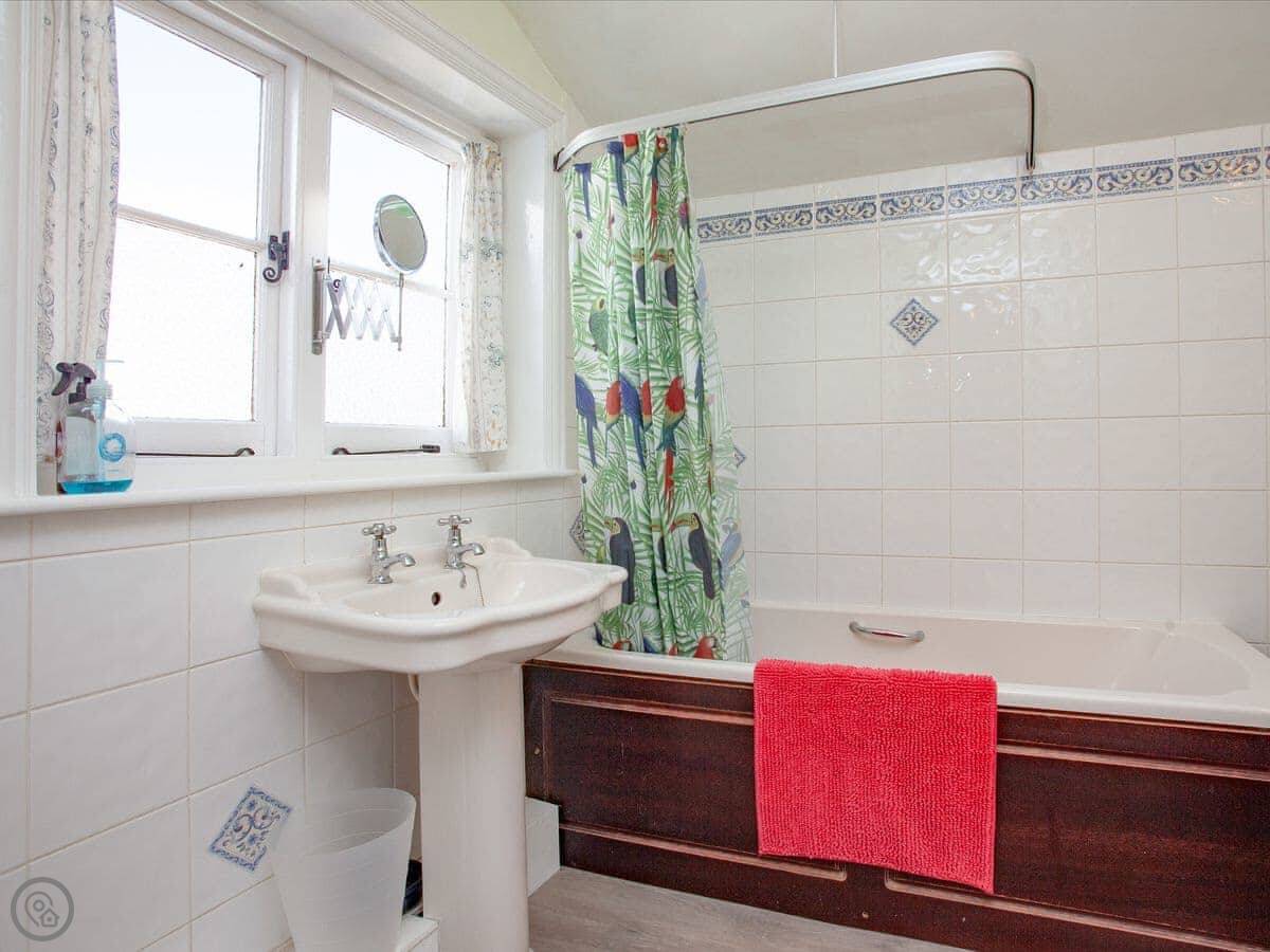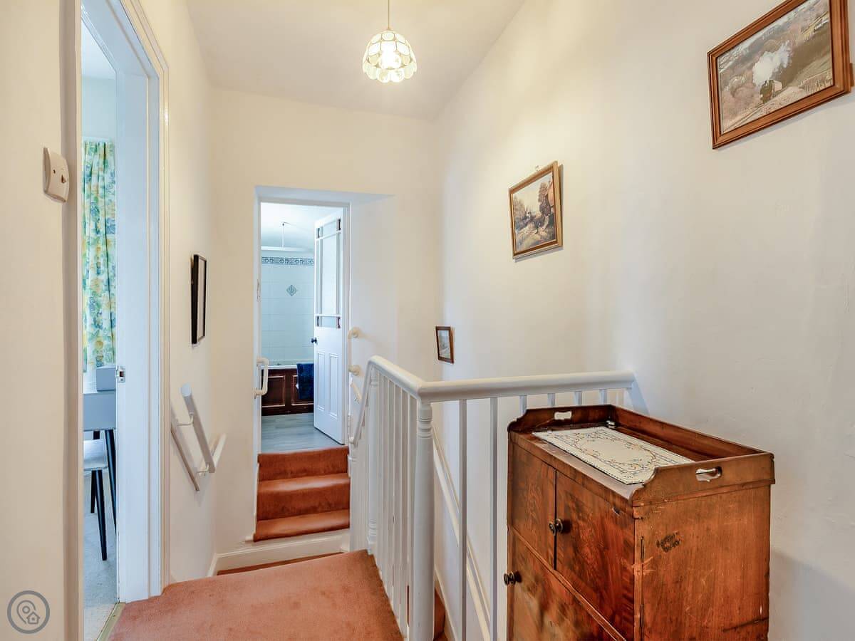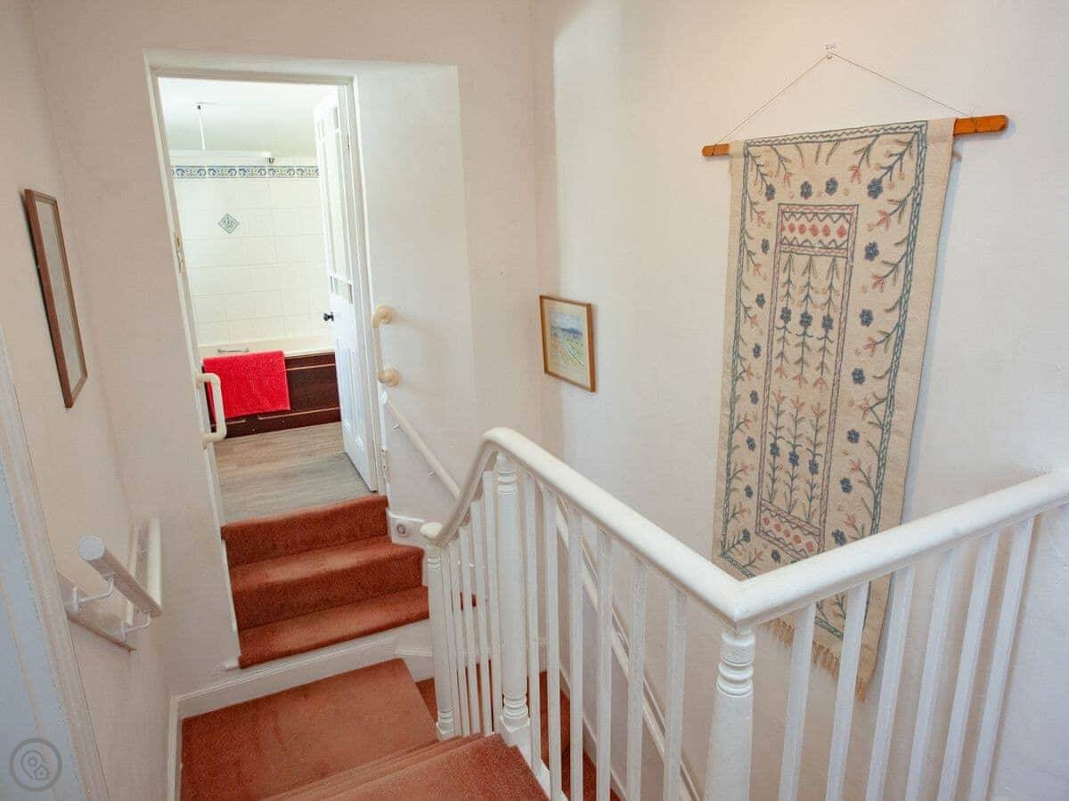 It sleeps six. Three bedrooms, two bathrooms. One bathroom has a bath, the other is a shower room downstairs. It's got a 4 Star rating, so it's well-equipped and comfortable. The stairs are normal, but there are a couple of extra steps up to the main bathroom from the landing.