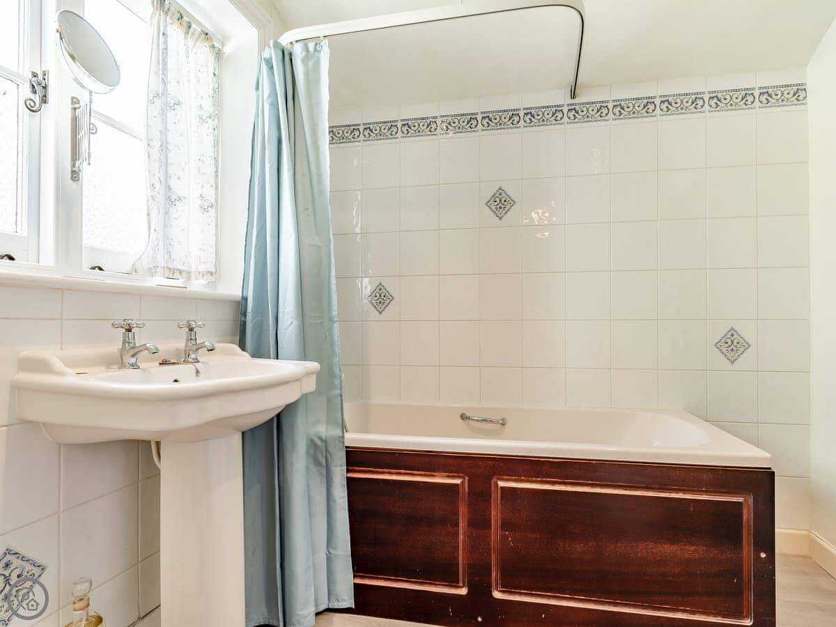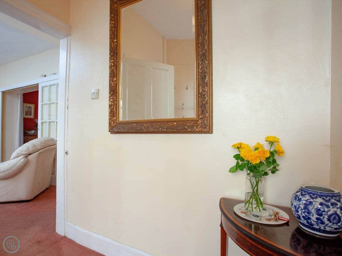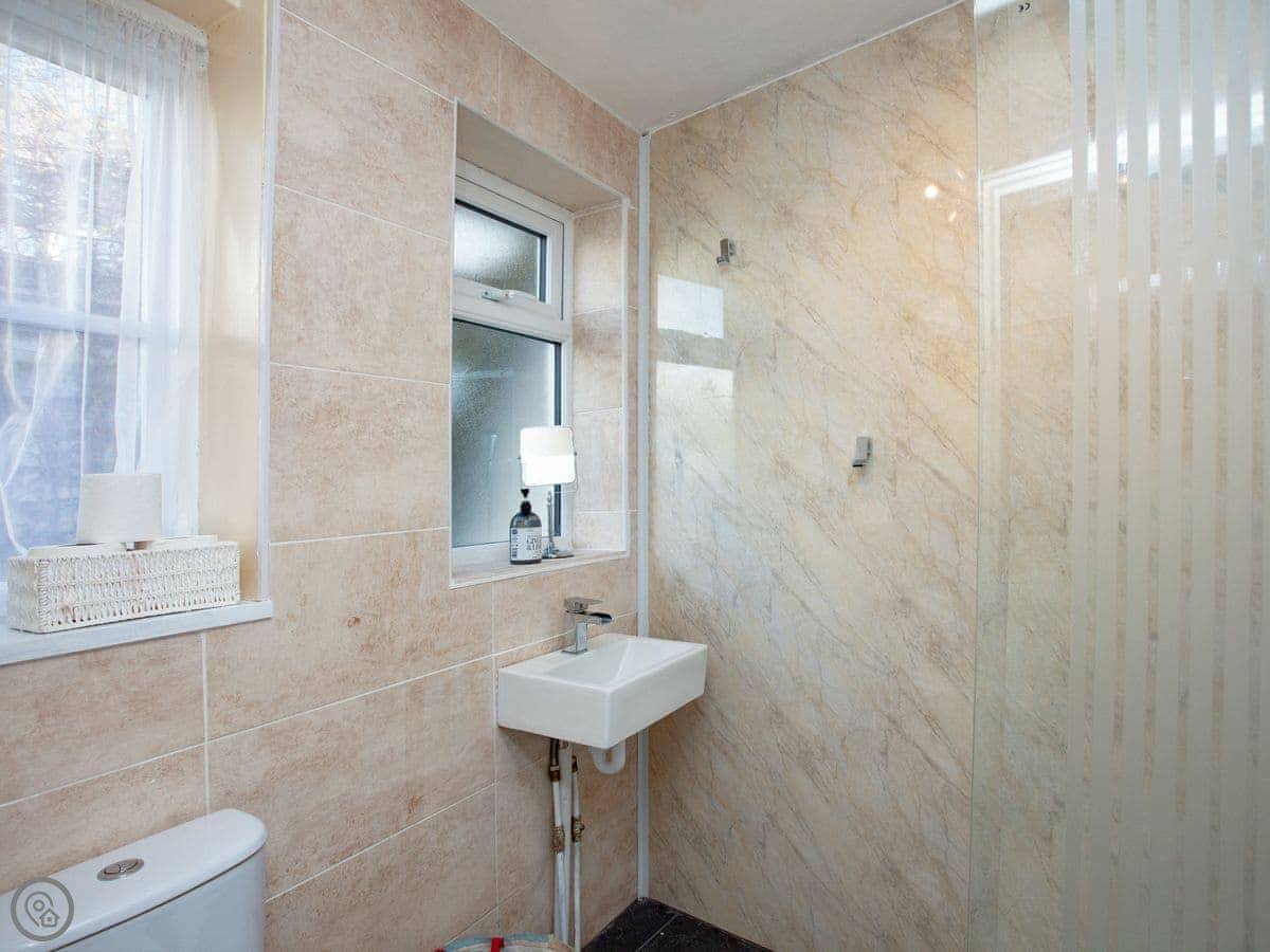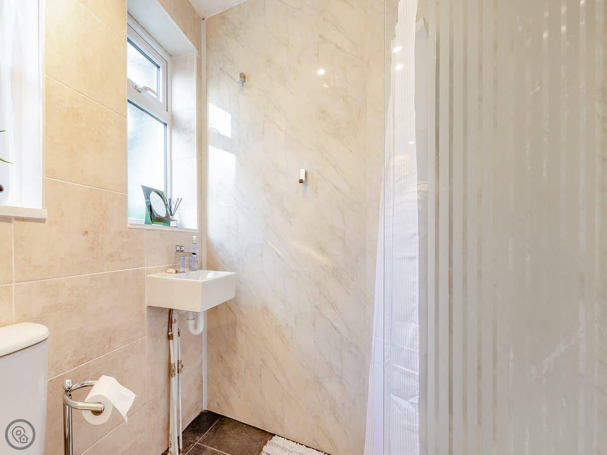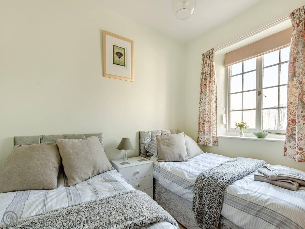 It sleeps six. Three bedrooms, two bathrooms. One bathroom has a bath, the other is a shower room downstairs. It's got a 4 Star rating, so it's well-equipped and comfortable. The stairs are normal, but there are a couple of extra steps up to the main bathroom from the landing.