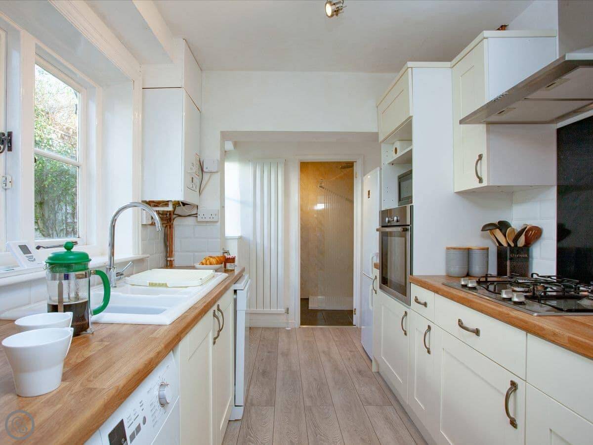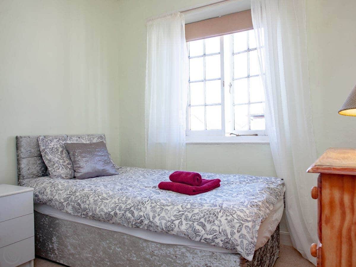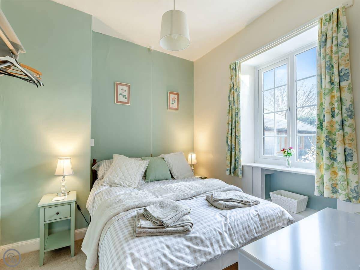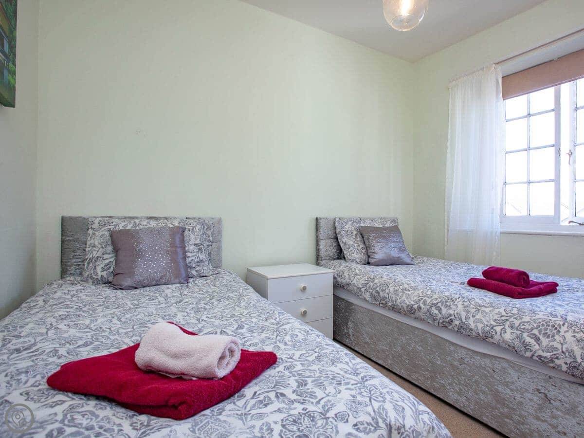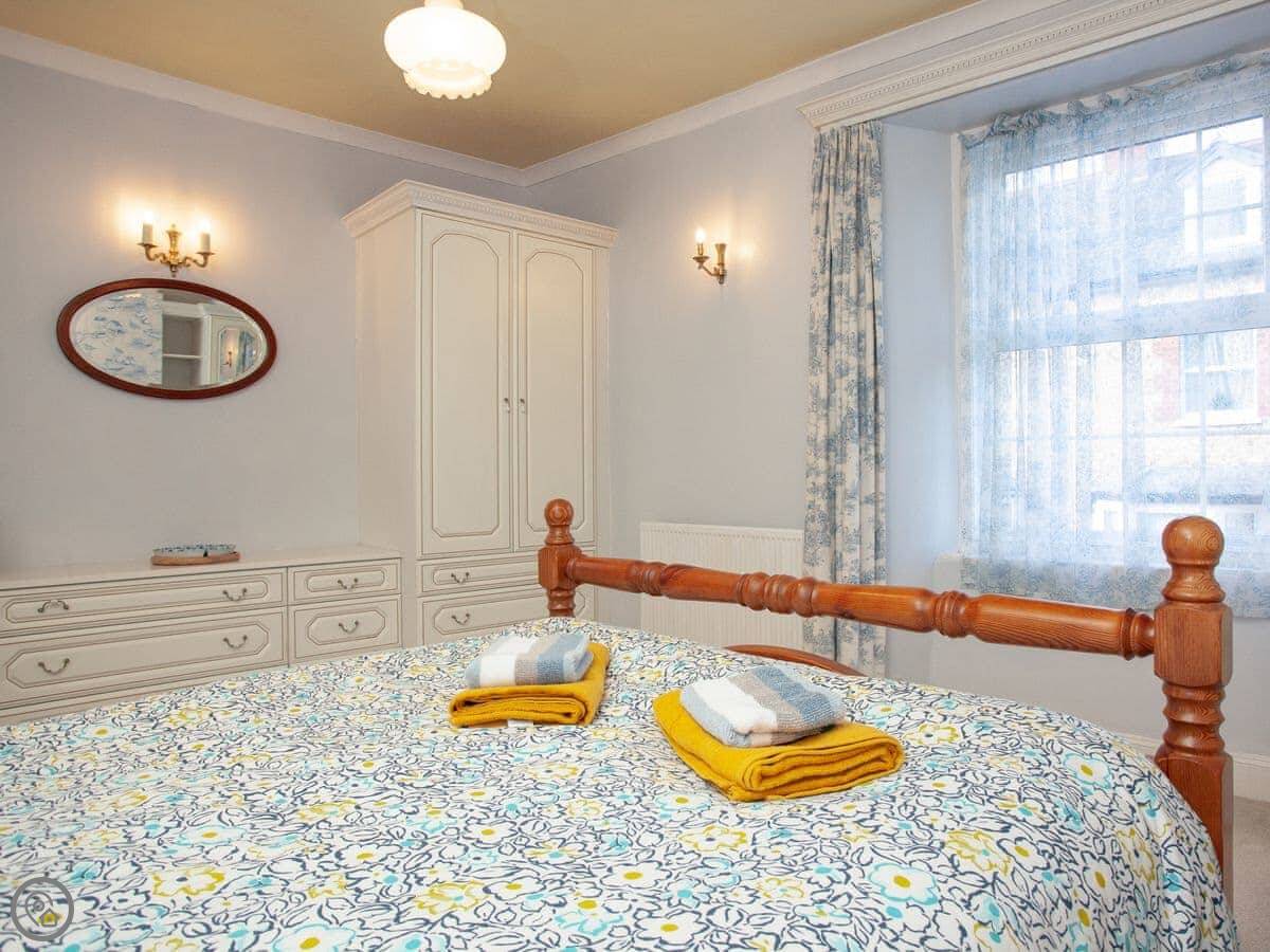It sleeps six. Three bedrooms, two bathrooms. One bathroom has a bath, the other is a shower room downstairs. It's got a 4 Star rating, so it's well-equipped and comfortable. The stairs are normal, but there are a couple of extra steps up to the main bathroom from the landing.