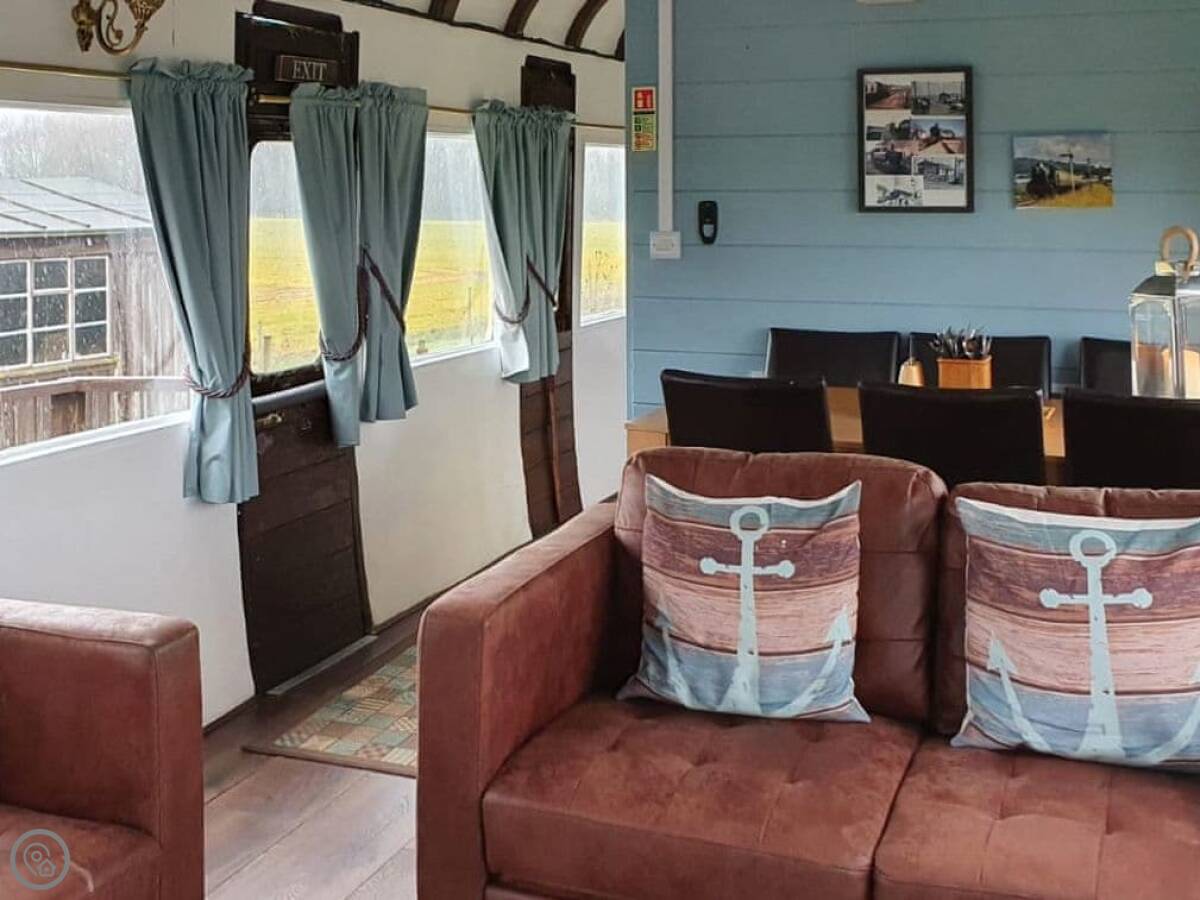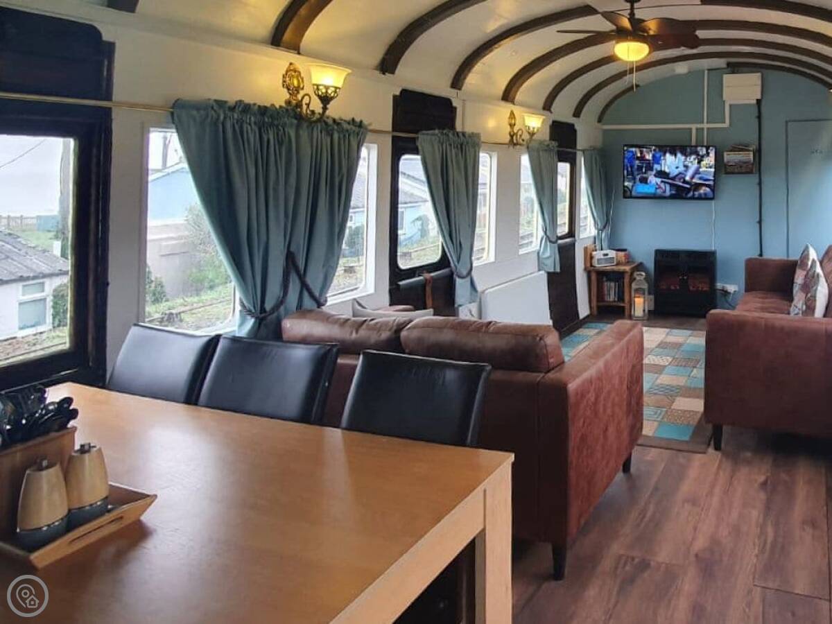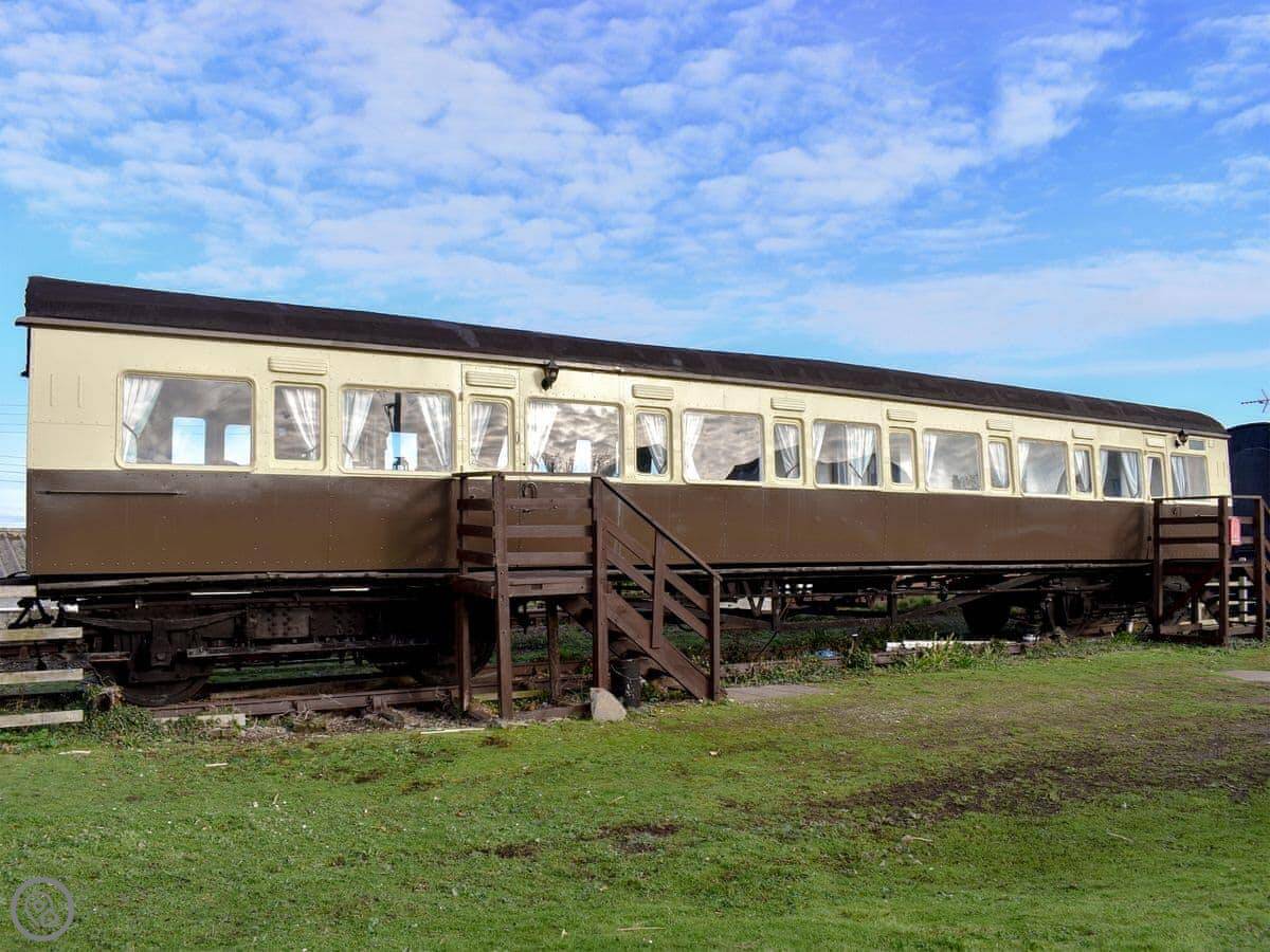 Outside, there's a large garden area with a patio and a BBQ. You have private parking. Important thing about the garden: the carriage is raised up on blocks, so the underside is open and you can see the working railway track behind it. You have to keep dogs on a lead there, and watch children closely.