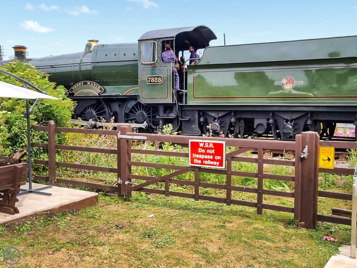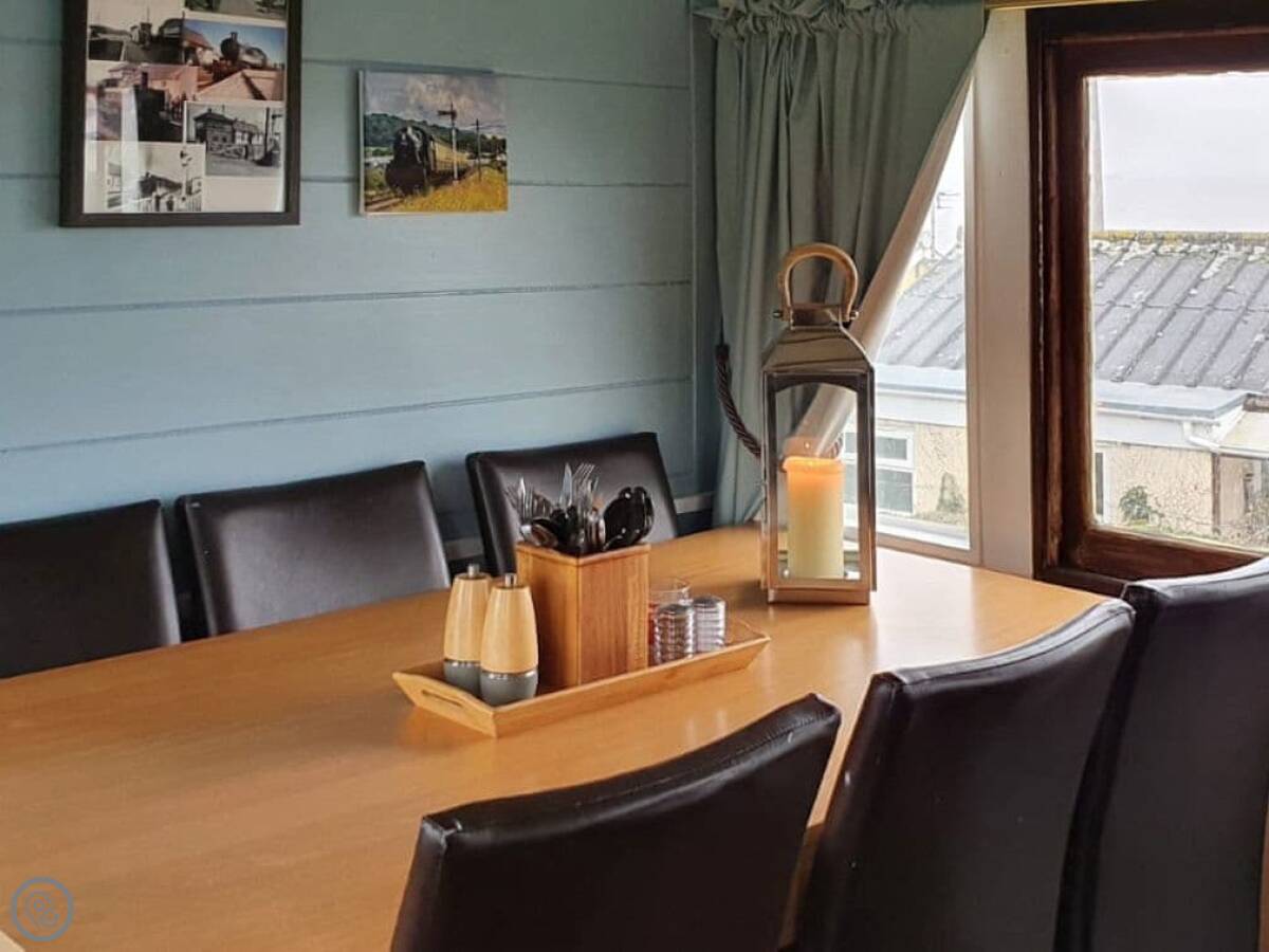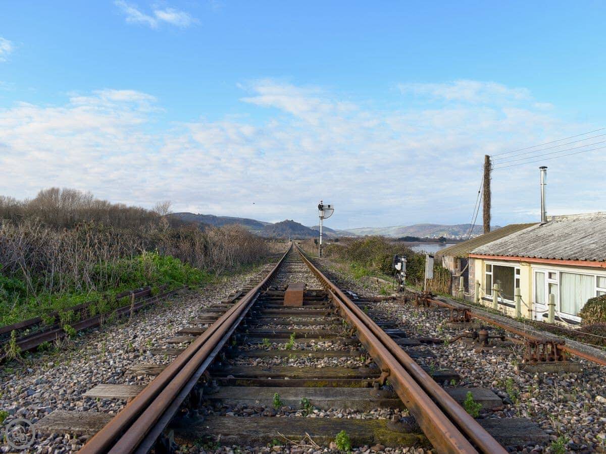 Outside, there's a large garden area with a patio and a BBQ. You have private parking. Important thing about the garden: the carriage is raised up on blocks, so the underside is open and you can see the working railway track behind it. You have to keep dogs on a lead there, and watch children closely.